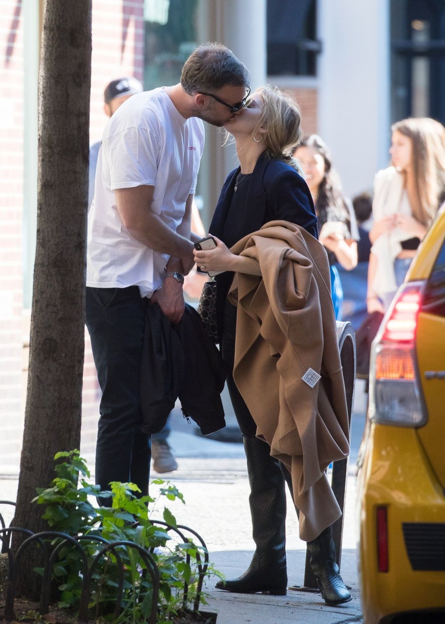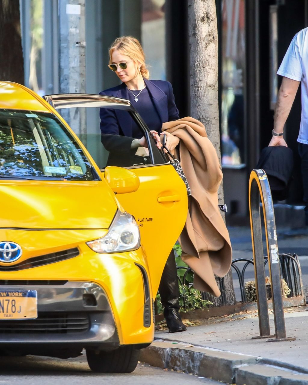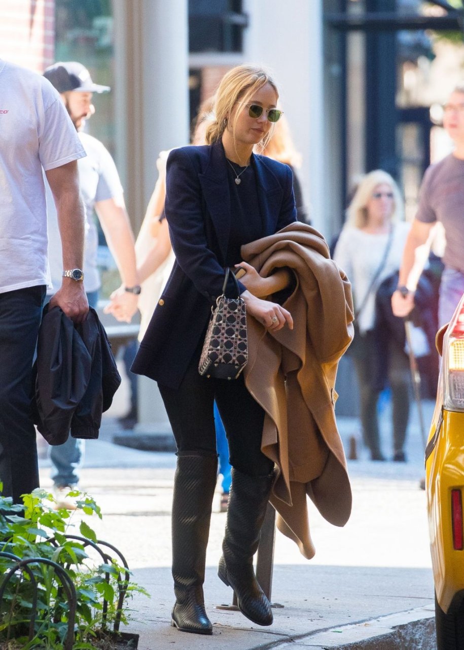 Дженнифер Лоуренс и Кук Мэрони долго целовались перед тем, как разойтись в Нью-Йорке, 14.10.2019. 29-летняя актриса несла сумку Dior и была одета в черный пиджак, кроп-топ, брюки с застежкой на пуговицы и высокие сапоги до колена.