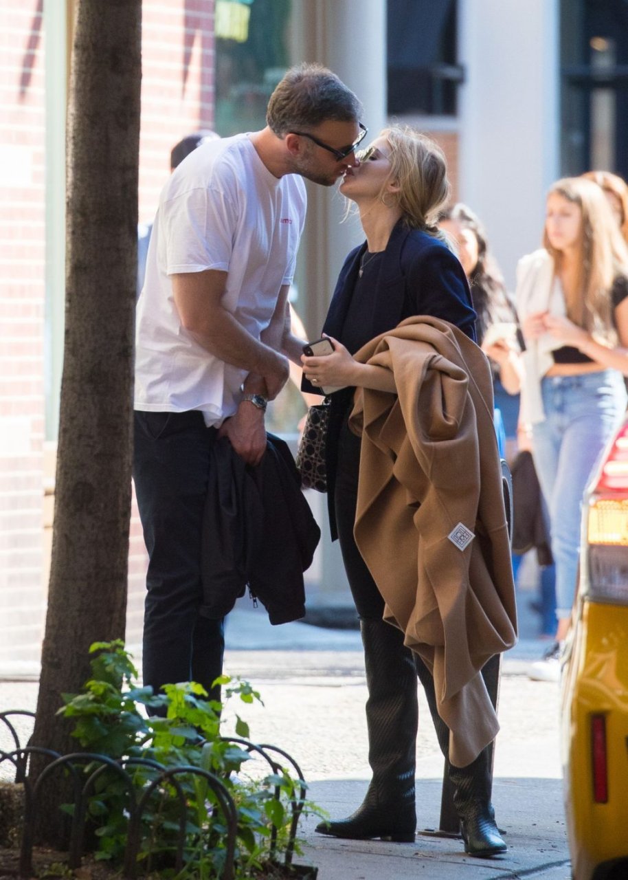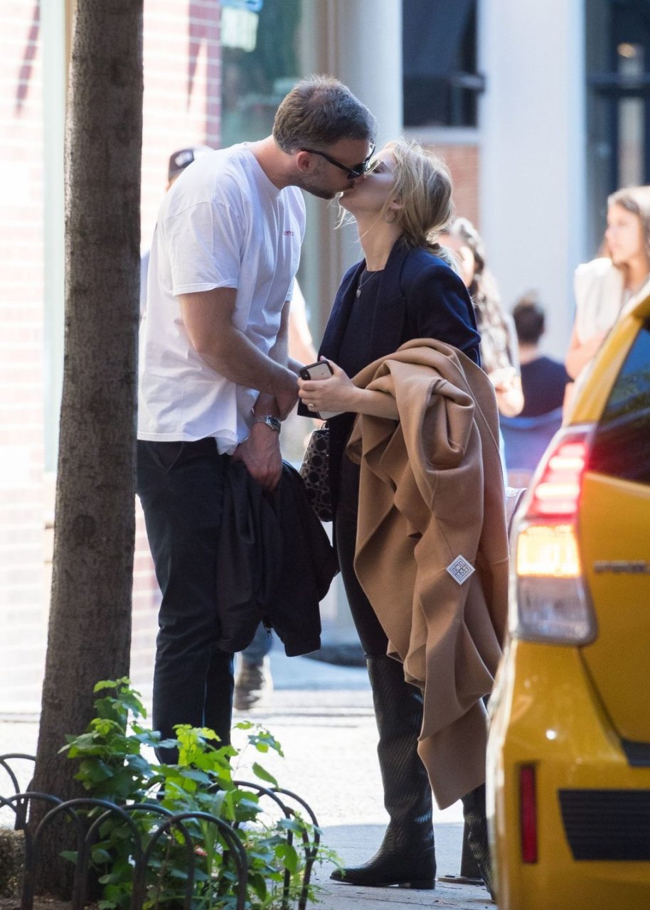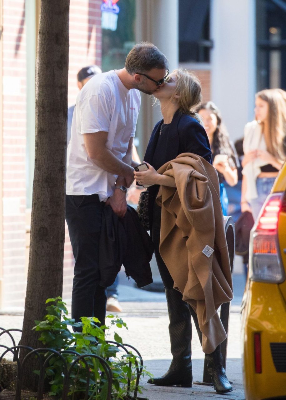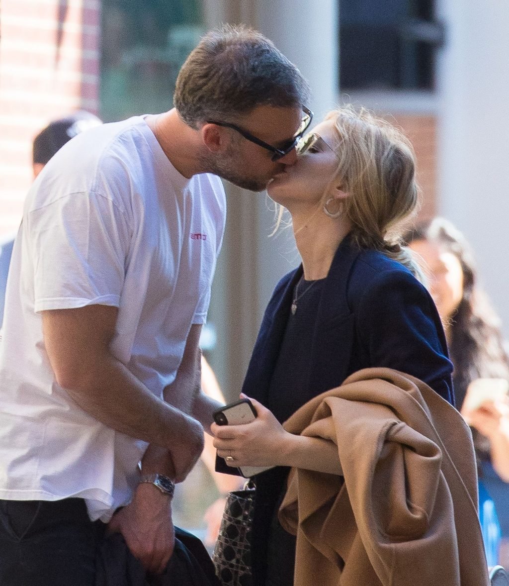 Дженнифер Лоуренс и Кук Мэрони долго целовались перед тем, как разойтись в Нью-Йорке, 14.10.2019. 29-летняя актриса несла сумку Dior и была одета в черный пиджак, кроп-топ, брюки с застежкой на пуговицы и высокие сапоги до колена.