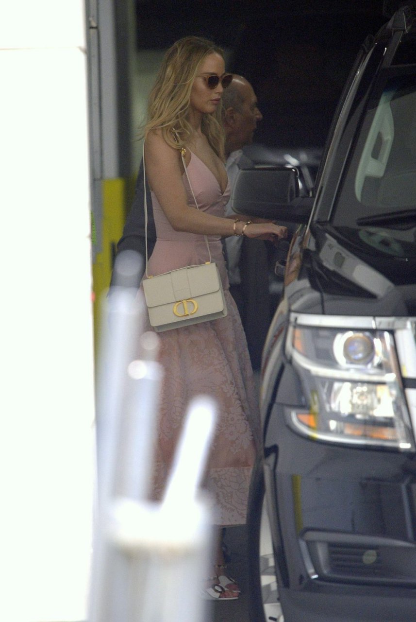 Актриса Дженнифер Лоуренс демонстрирует декольте в розовом платье на тонких бретелях, с сумкой Dior на плече и босоножками на шпильке с открытым носком в Нью-Йорке, 01.06.2019.
