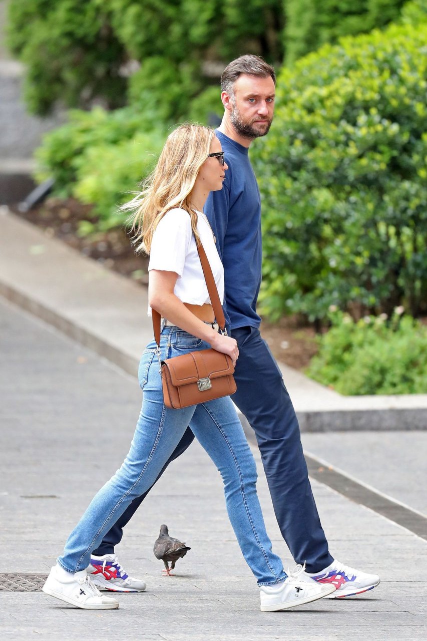 Дженнифер надела свитшот, который купила в сувенирном магазине, пока Кук стоял в очереди за билетами. 29-летняя актриса дополнила образ джинсами и белыми кроссовками.
