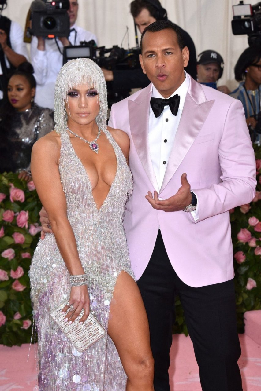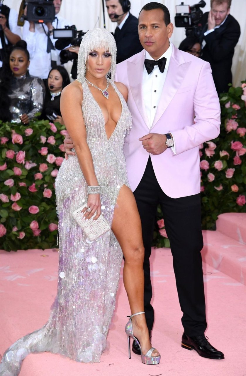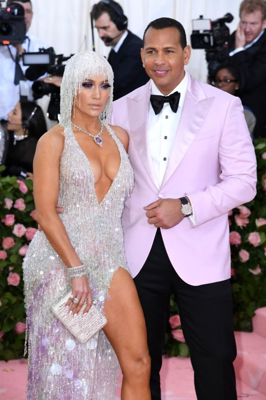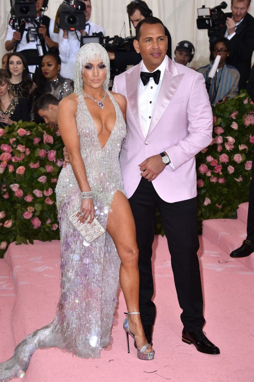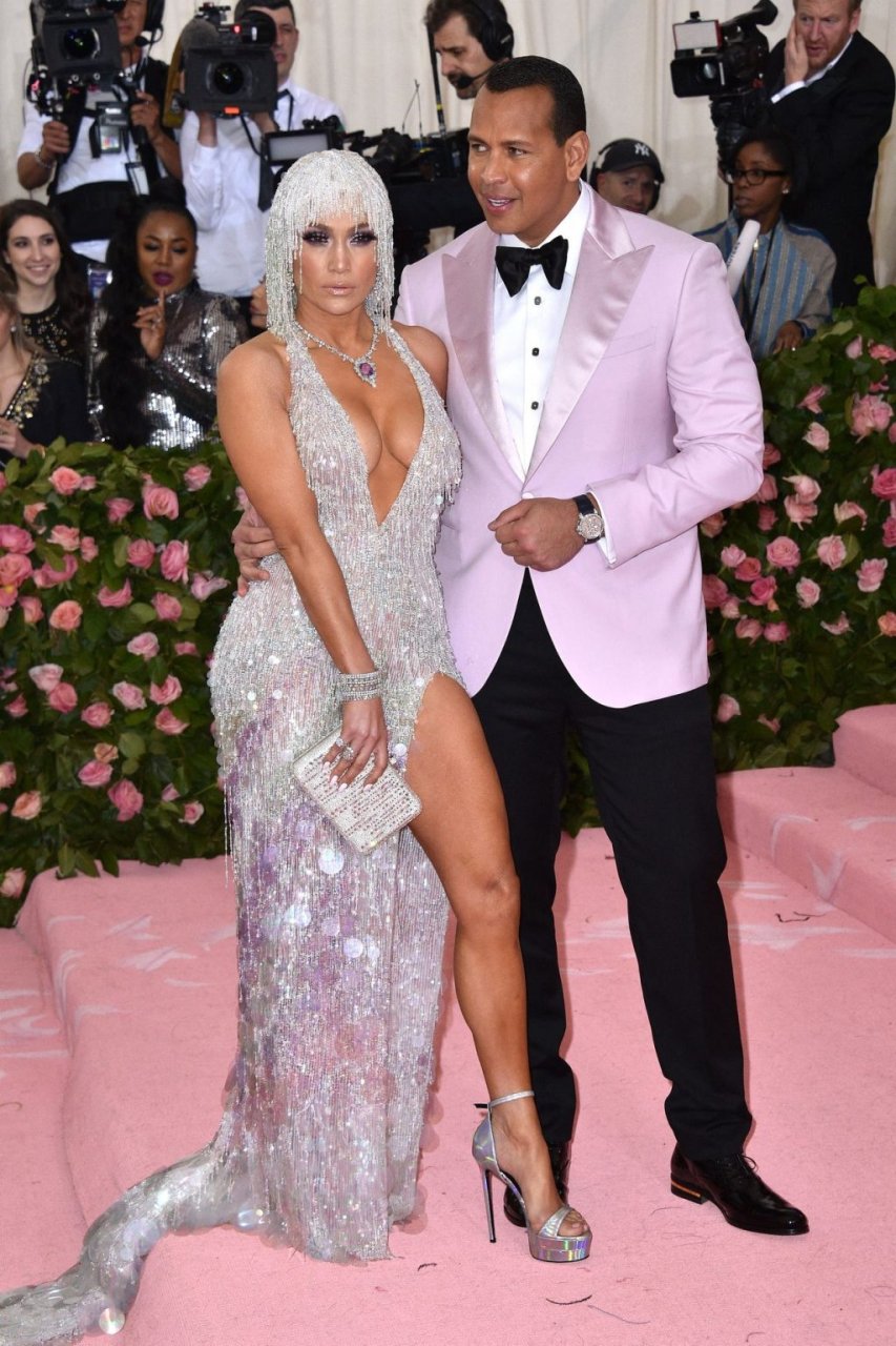 Дженнифер Лопес (49) и Алекс Родригес (43) появились на ковровой дорожке Met Gala в Нью-Йорке, 06.05.2019. Для мероприятия певица выбрала платье Versace и ожерелье от Harry Winston. У неё также есть обручальное кольцо с огромным бриллиантом.