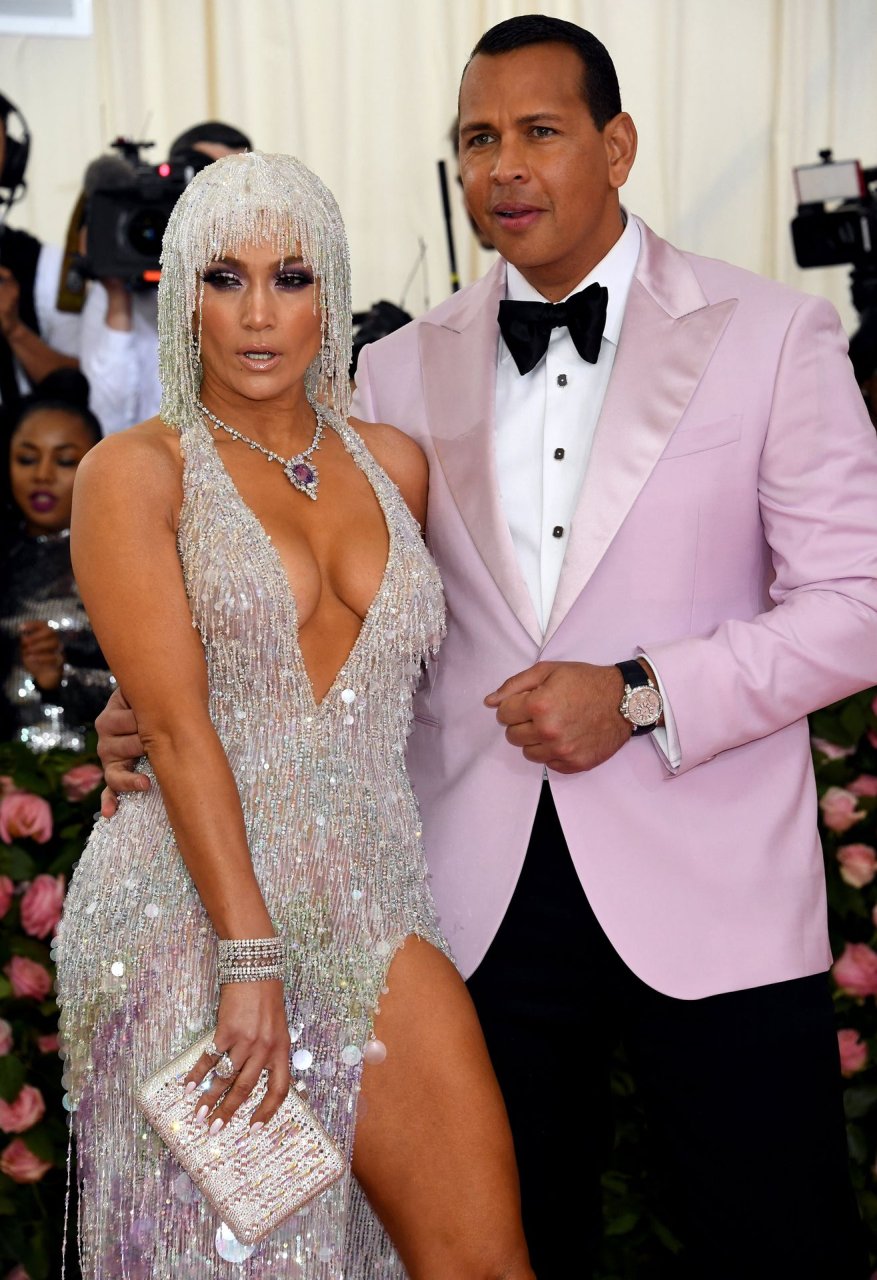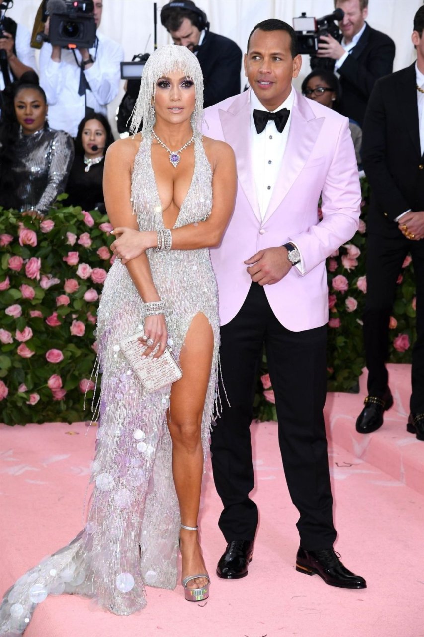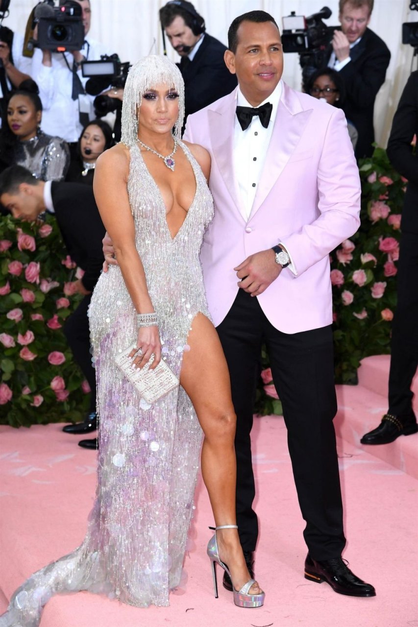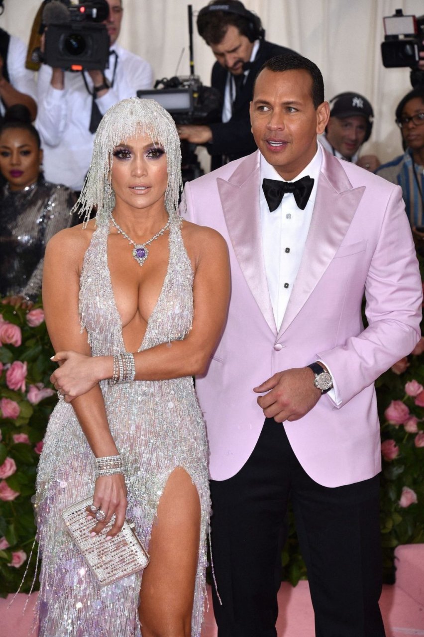 Дженнифер Лопес (49) и Алекс Родригес (43) появились на ковровой дорожке Met Gala в Нью-Йорке, 06.05.2019. Для мероприятия певица выбрала платье Versace и ожерелье от Harry Winston. У неё также есть обручальное кольцо с огромным бриллиантом.