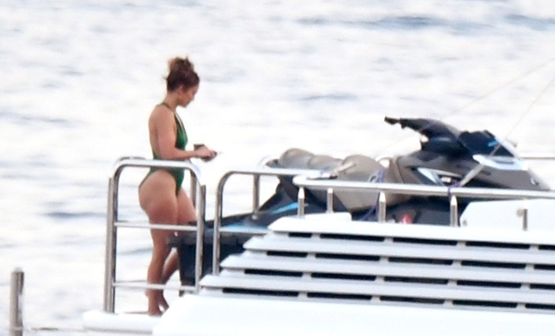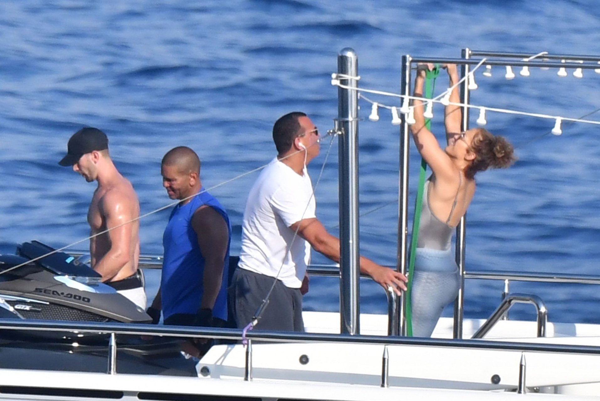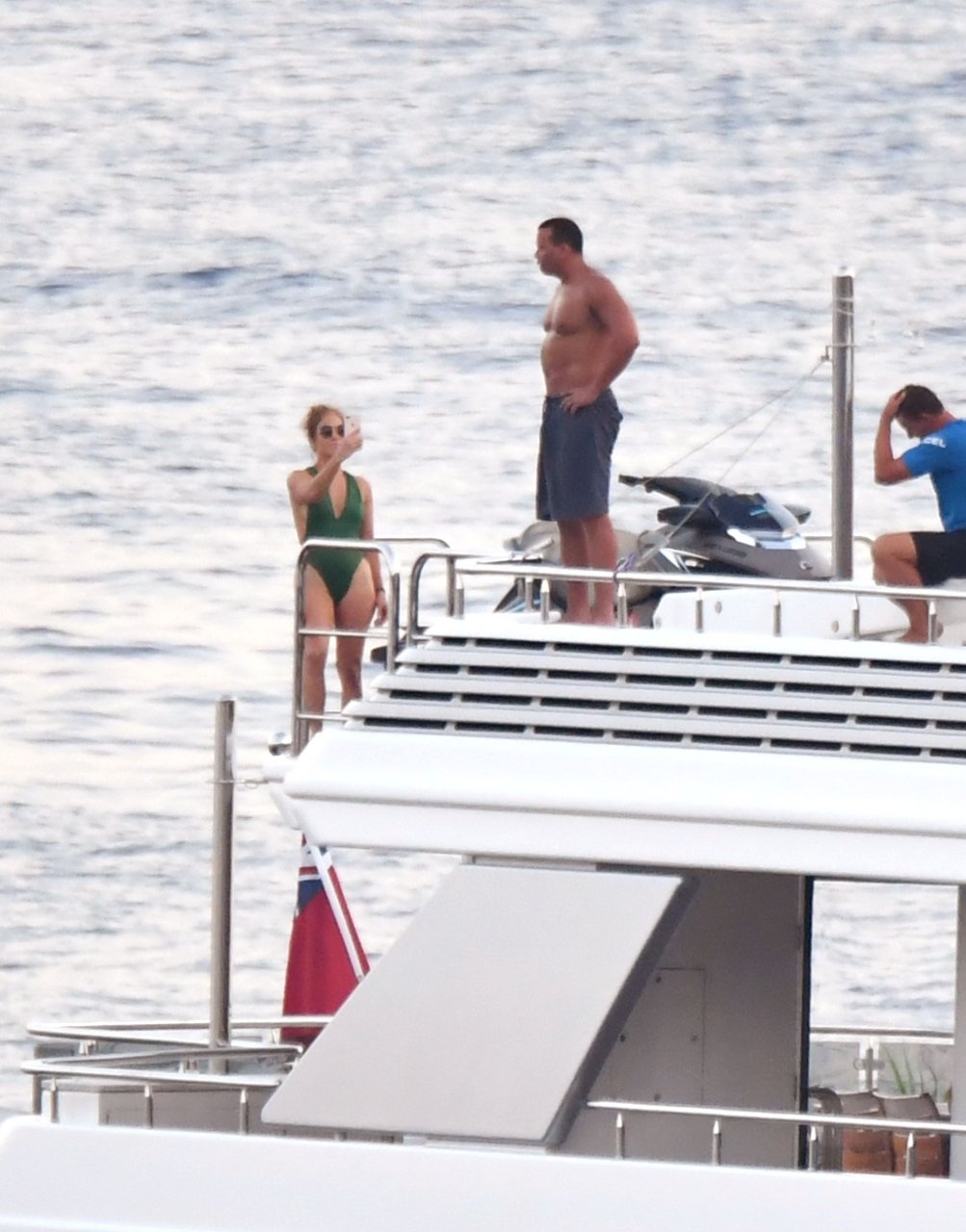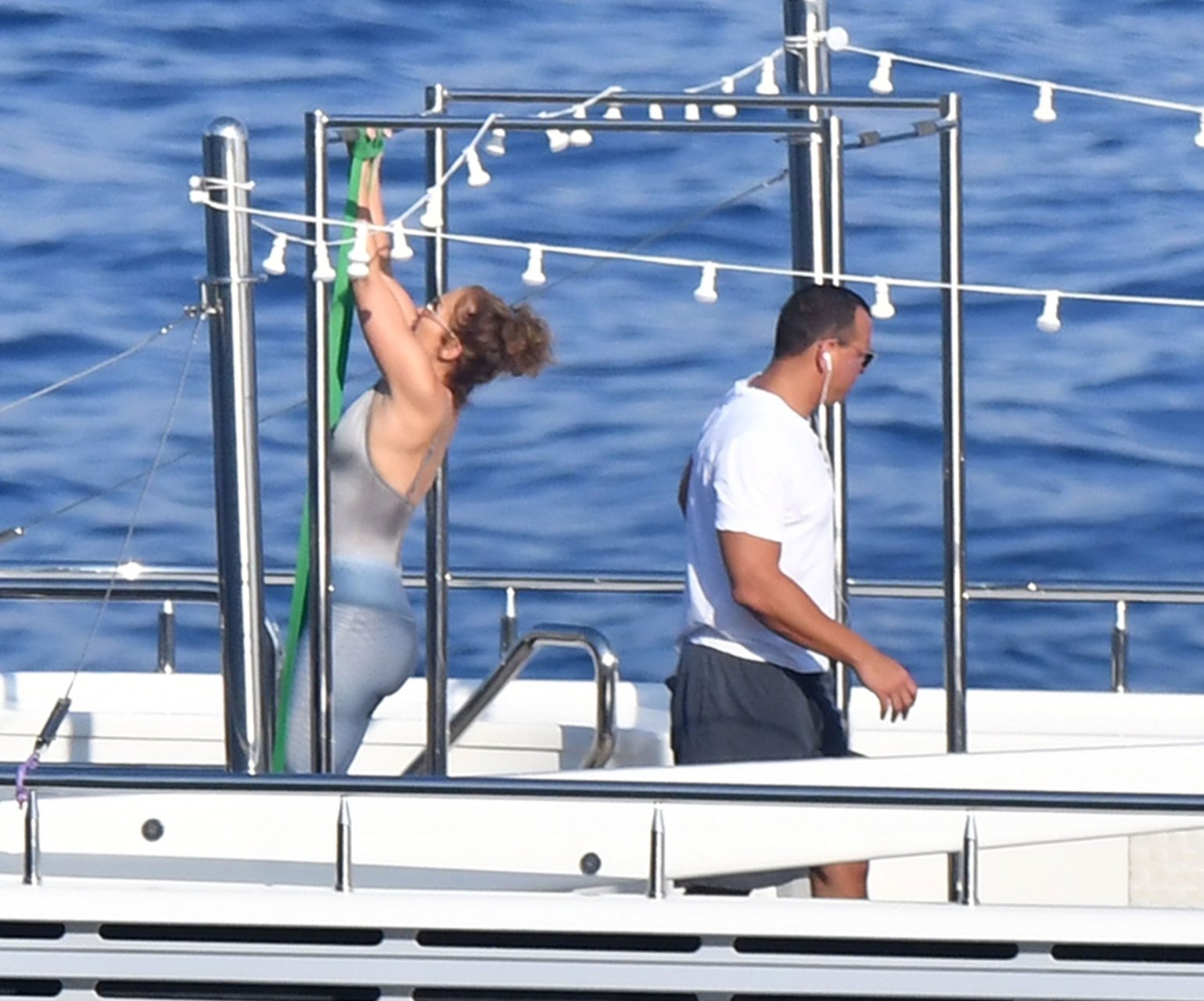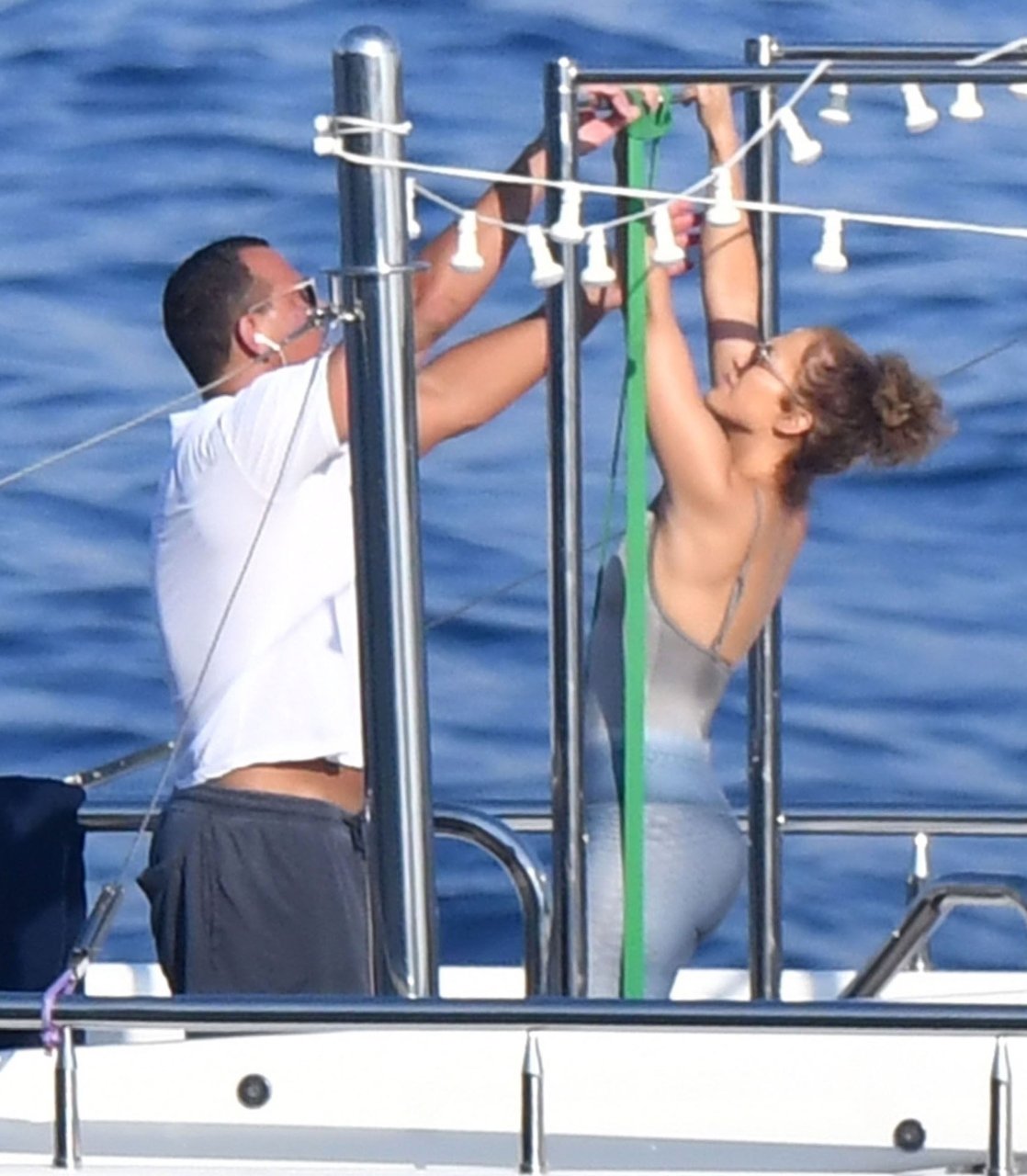 Дженнифер выглядела стильно в тёмных солнцезащитных очках и зелёном цельном купальнике, демонстрируя пышное декольте, пока занималась подтягиваниями вместе со своим менеджером и музыкальным продюсером Бенни Мединой. Алекс был замечен прыгающим с яхты и плывущим, а Джей-Ло снимала это на телефон.