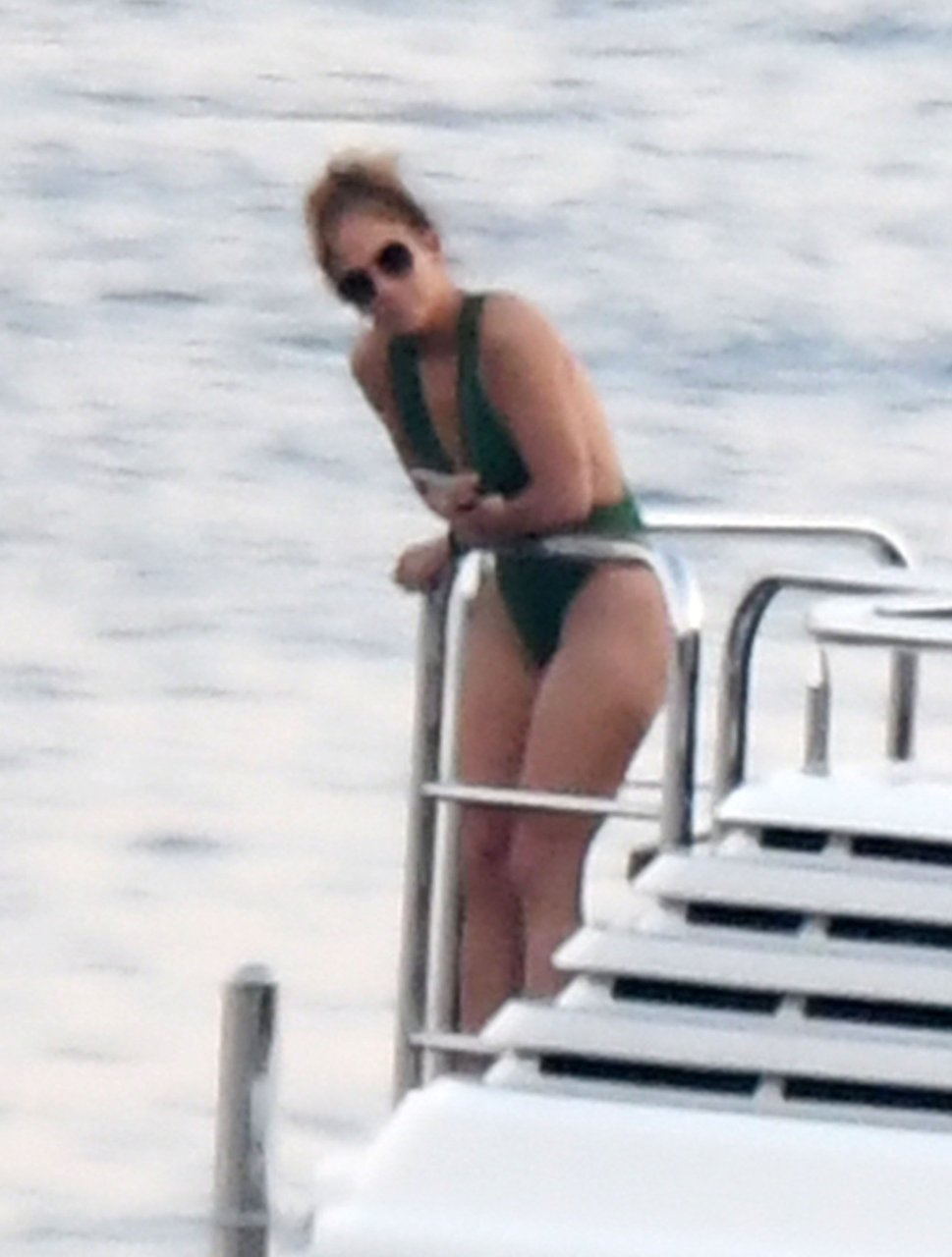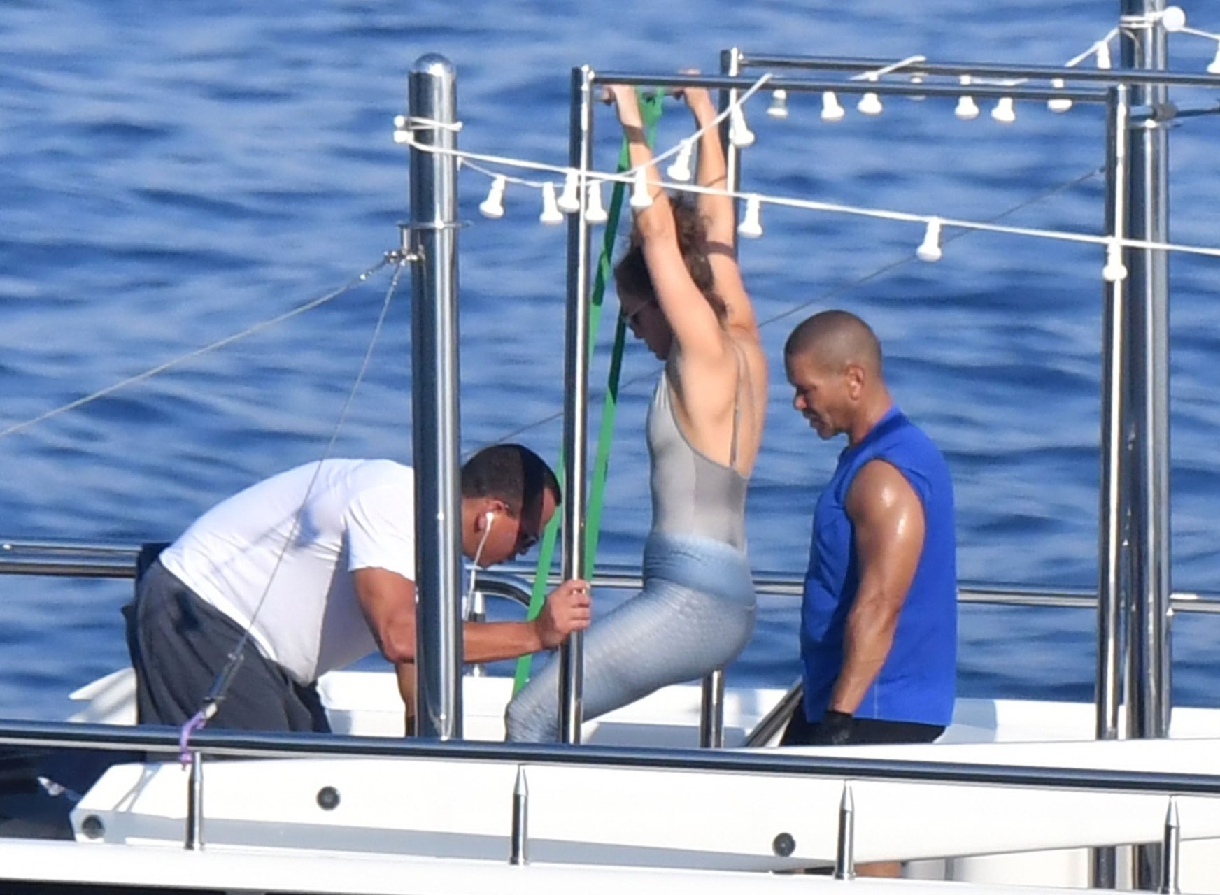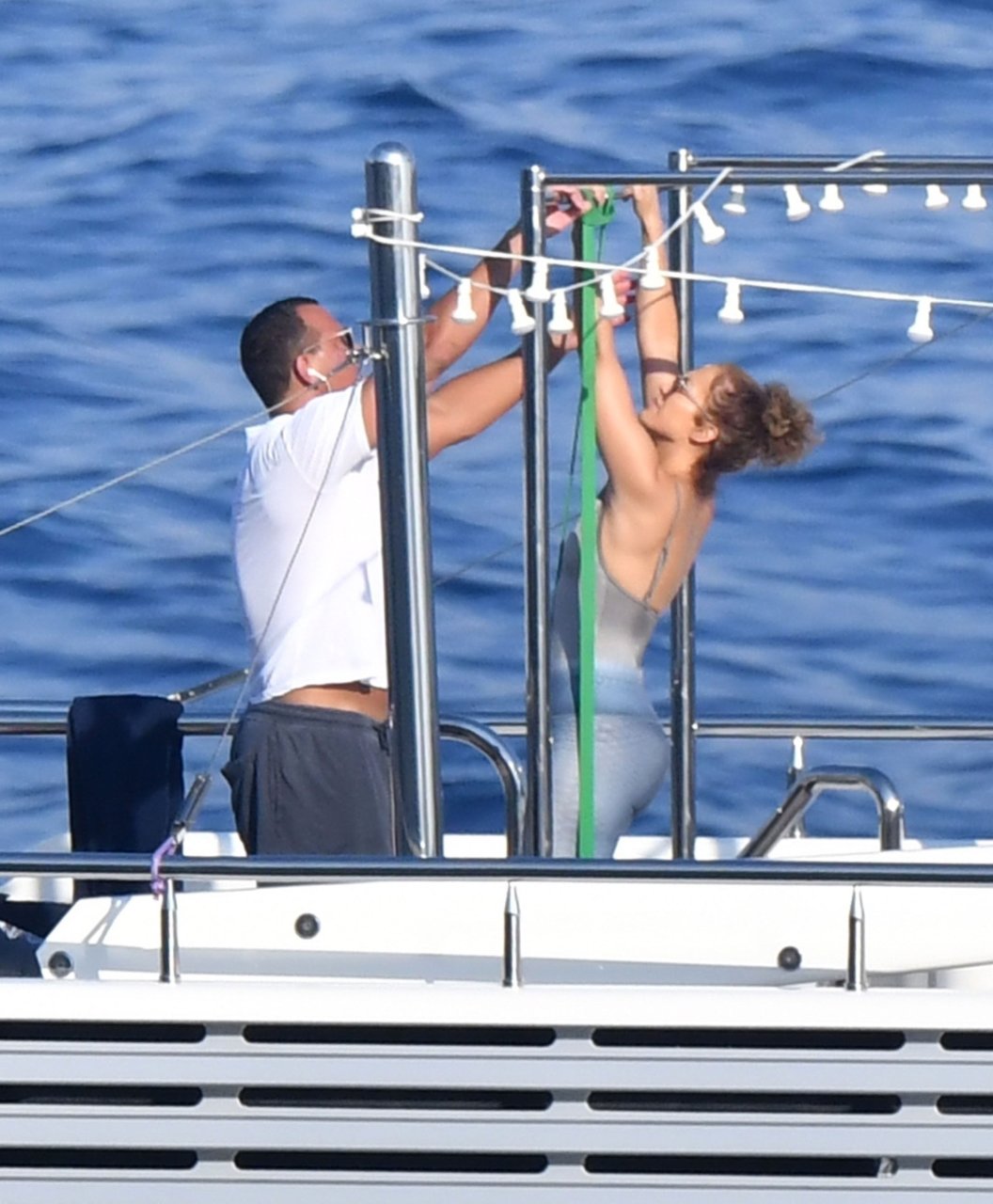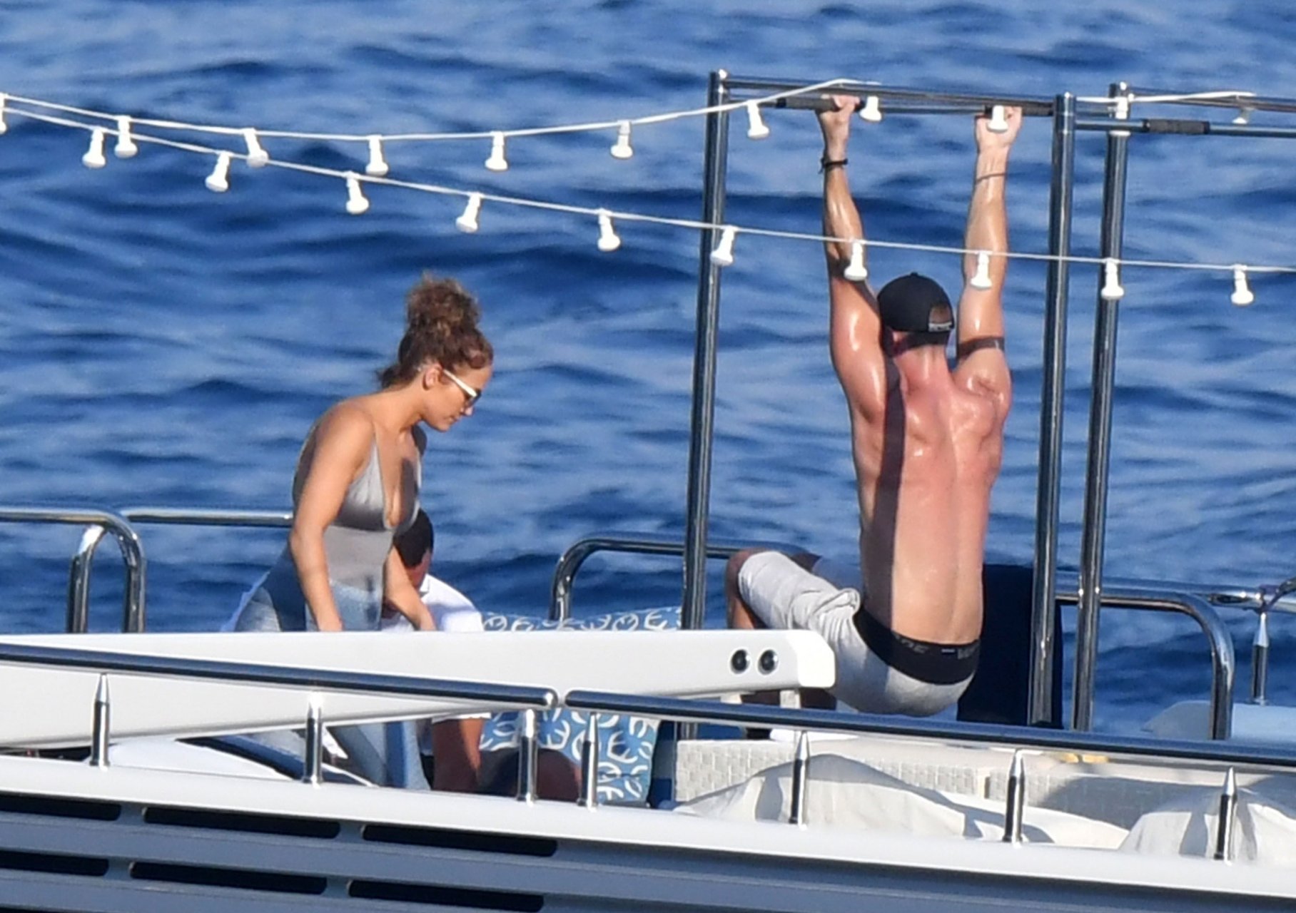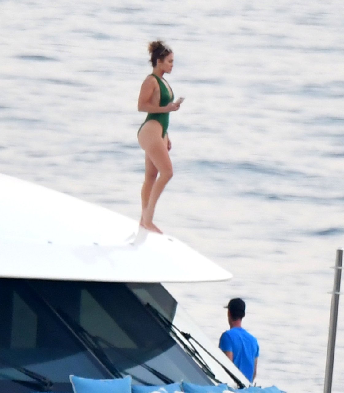 Дженнифер выглядела стильно в тёмных солнцезащитных очках и зелёном цельном купальнике, демонстрируя пышное декольте, пока занималась подтягиваниями вместе со своим менеджером и музыкальным продюсером Бенни Мединой. Алекс был замечен прыгающим с яхты и плывущим, а Джей-Ло снимала это на телефон.