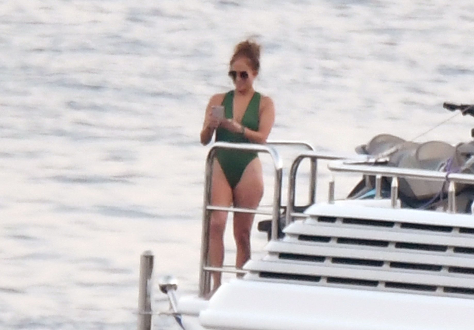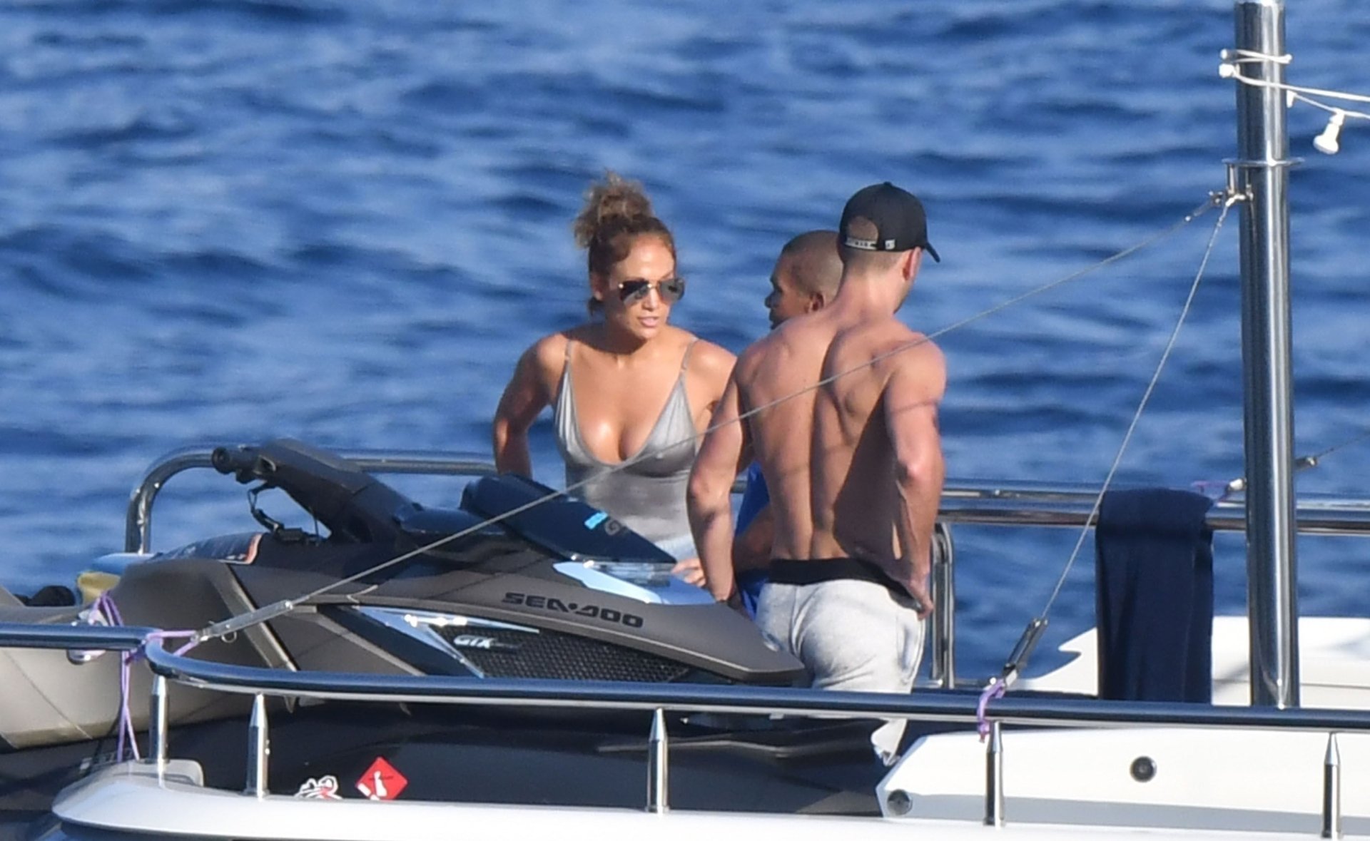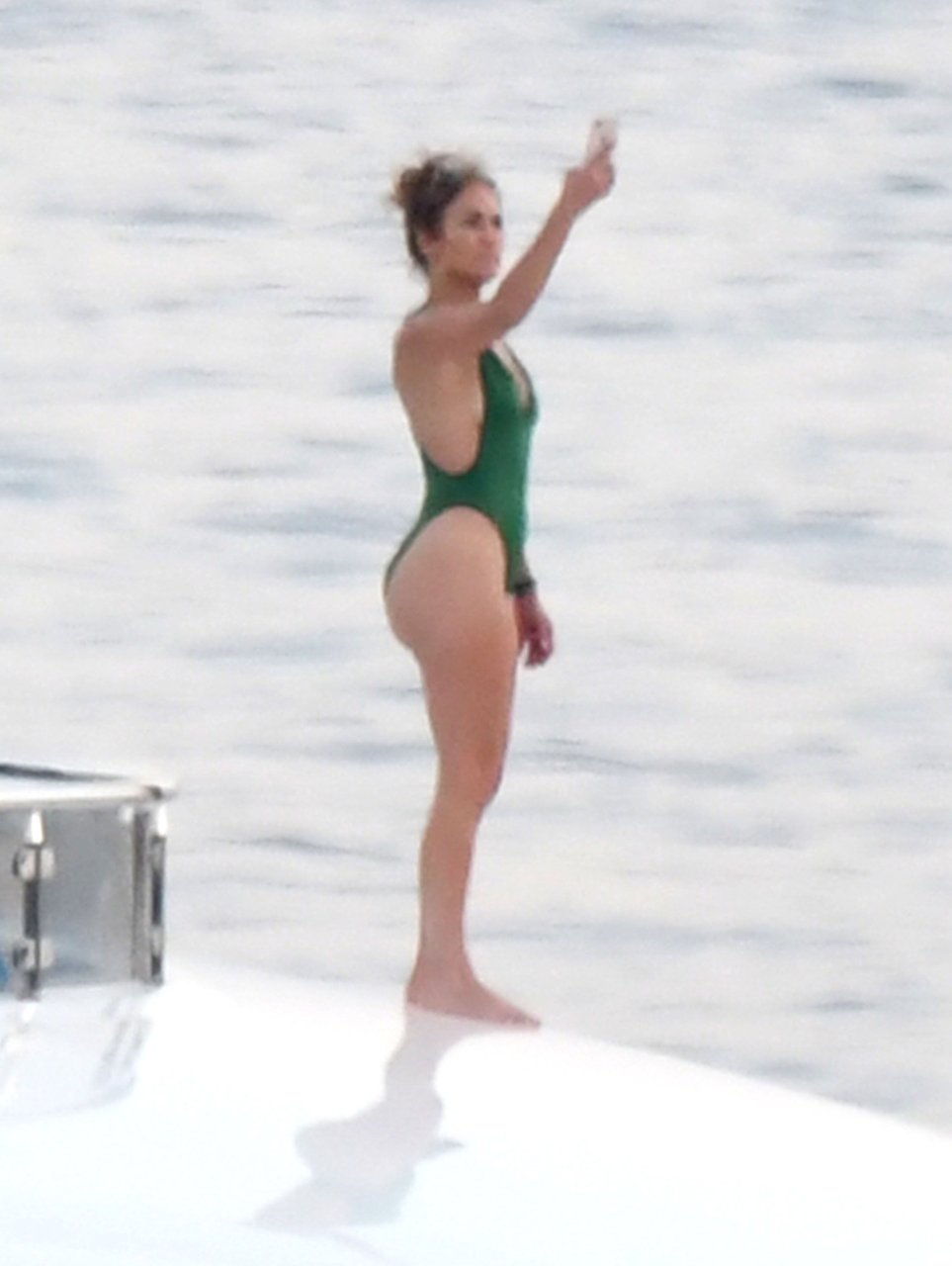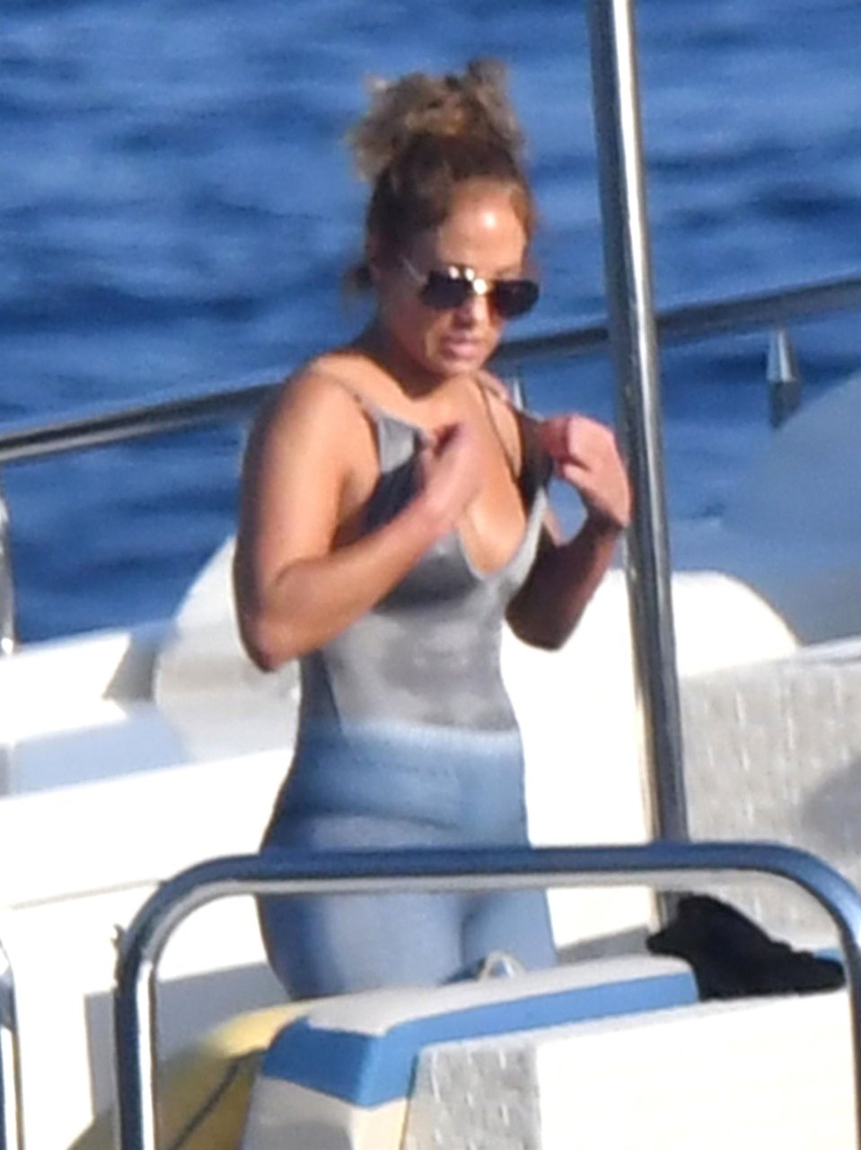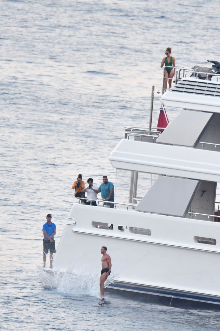 Дженнифер выглядела стильно в тёмных солнцезащитных очках и зелёном цельном купальнике, демонстрируя пышное декольте, пока занималась подтягиваниями вместе со своим менеджером и музыкальным продюсером Бенни Мединой. Алекс был замечен прыгающим с яхты и плывущим, а Джей-Ло снимала это на телефон.