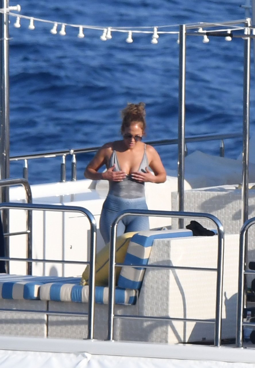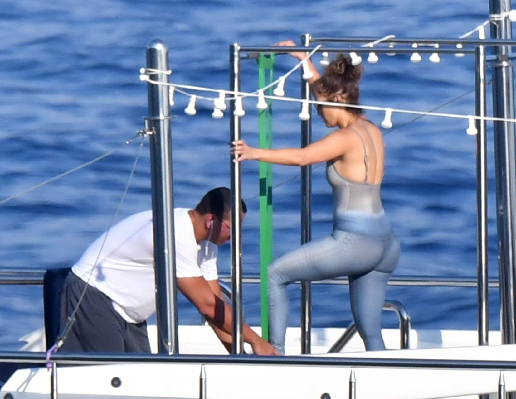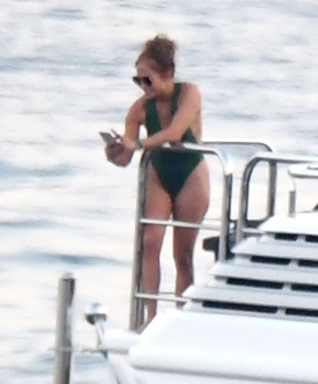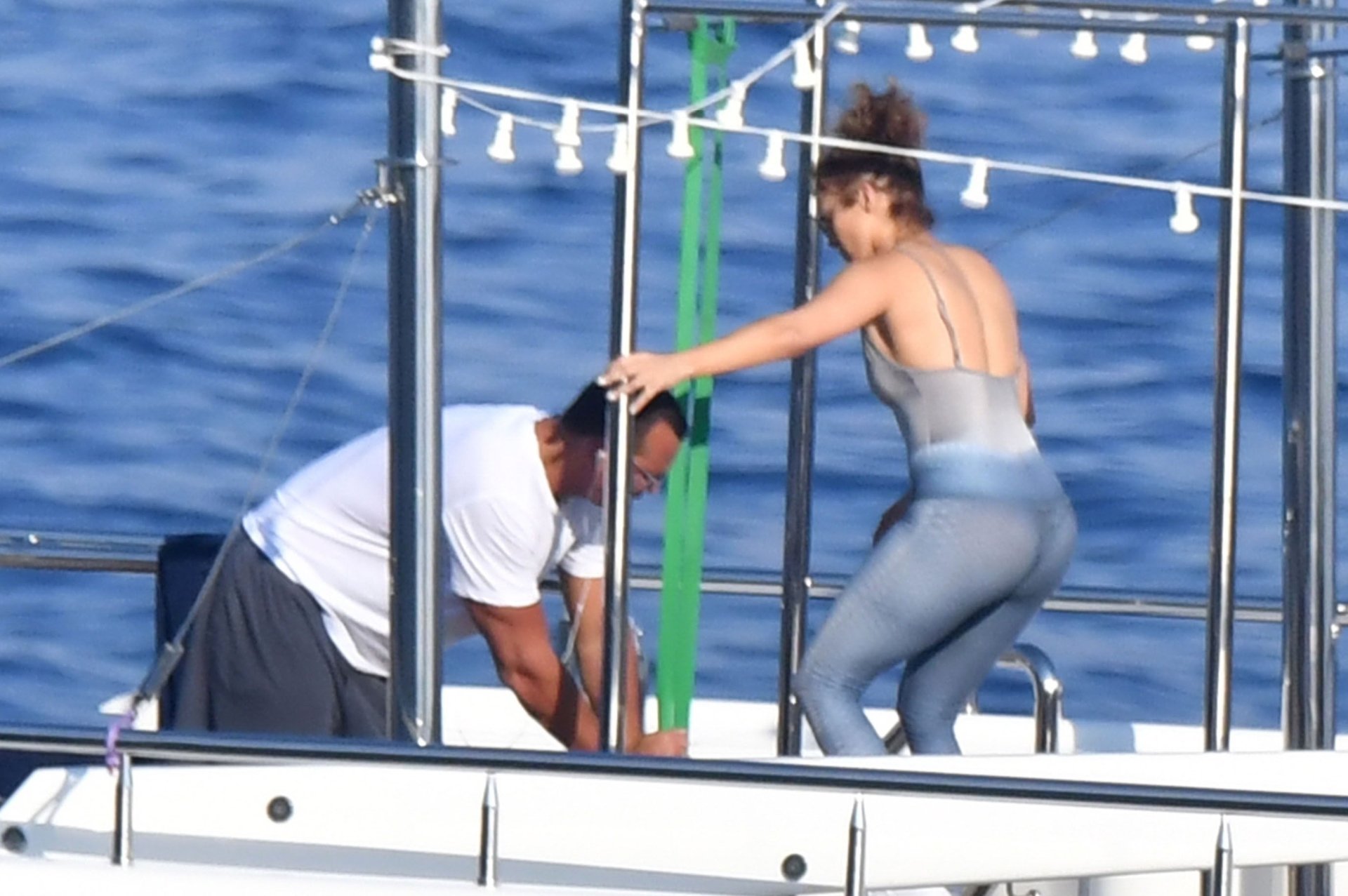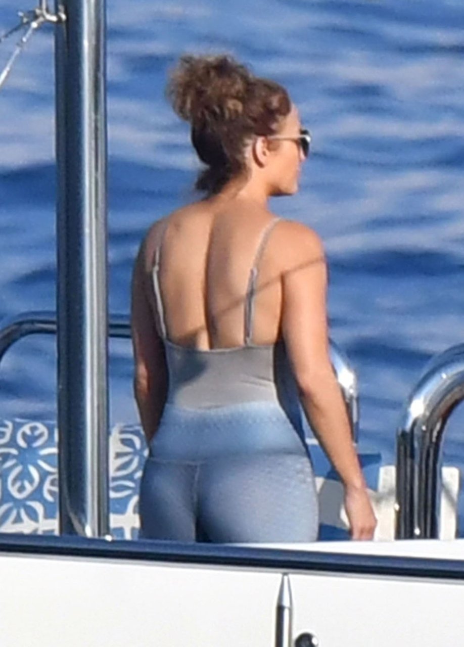 Дженнифер выглядела стильно в тёмных солнцезащитных очках и зелёном цельном купальнике, демонстрируя пышное декольте, пока занималась подтягиваниями вместе со своим менеджером и музыкальным продюсером Бенни Мединой. Алекс был замечен прыгающим с яхты и плывущим, а Джей-Ло снимала это на телефон.