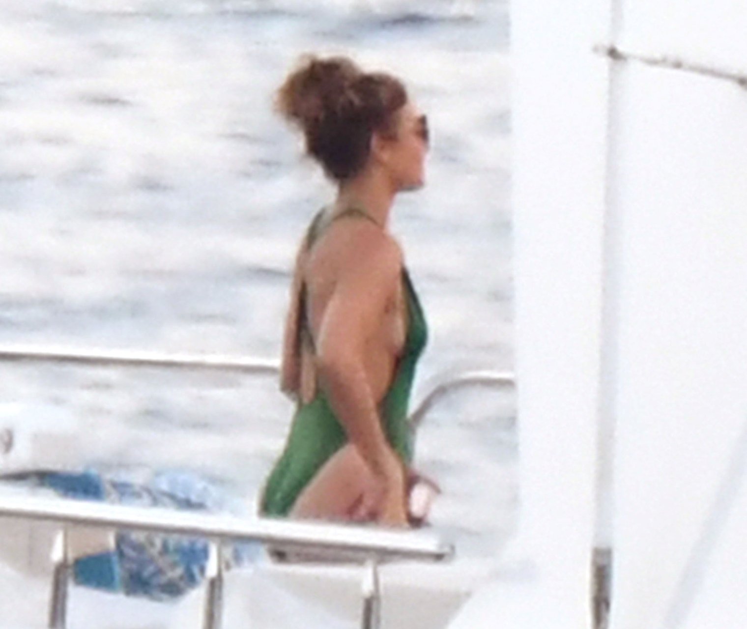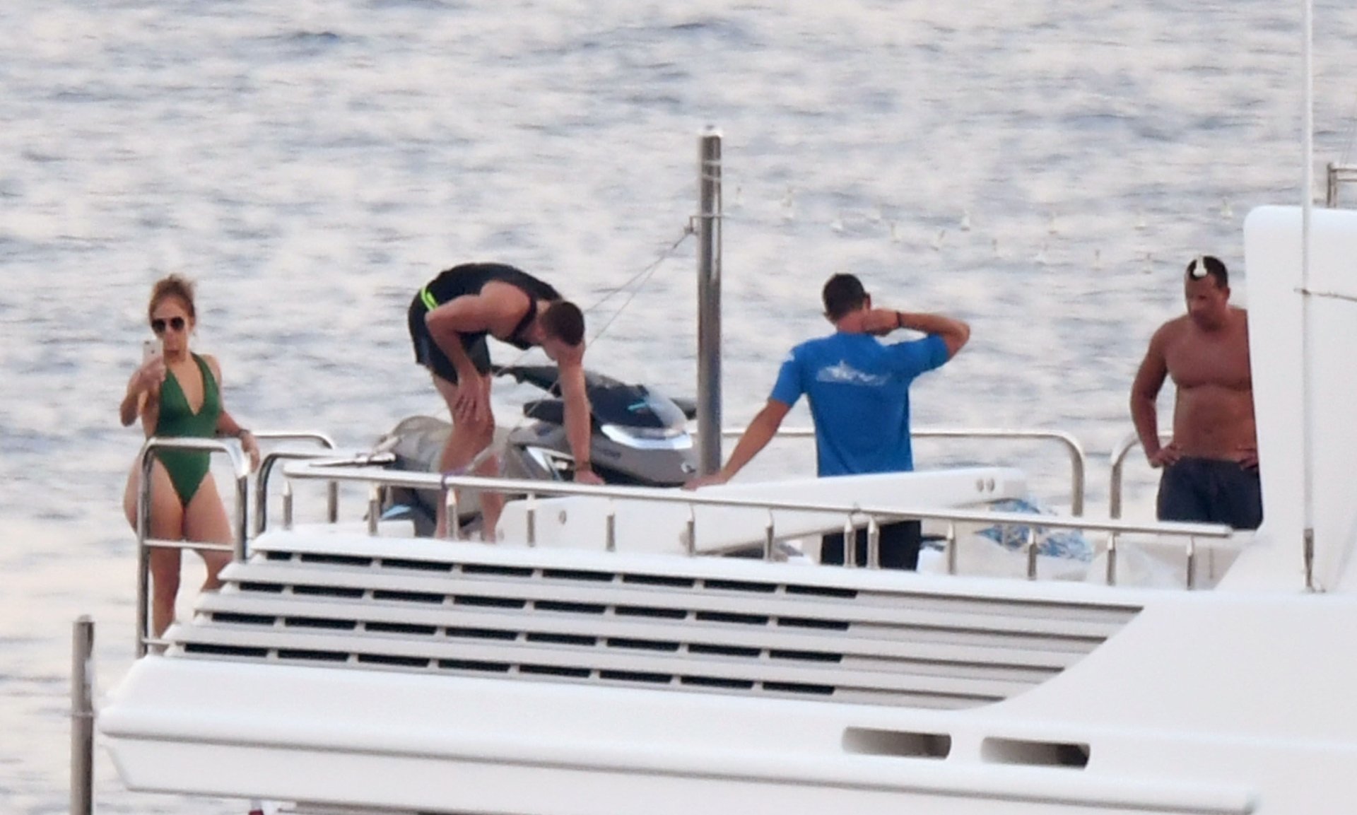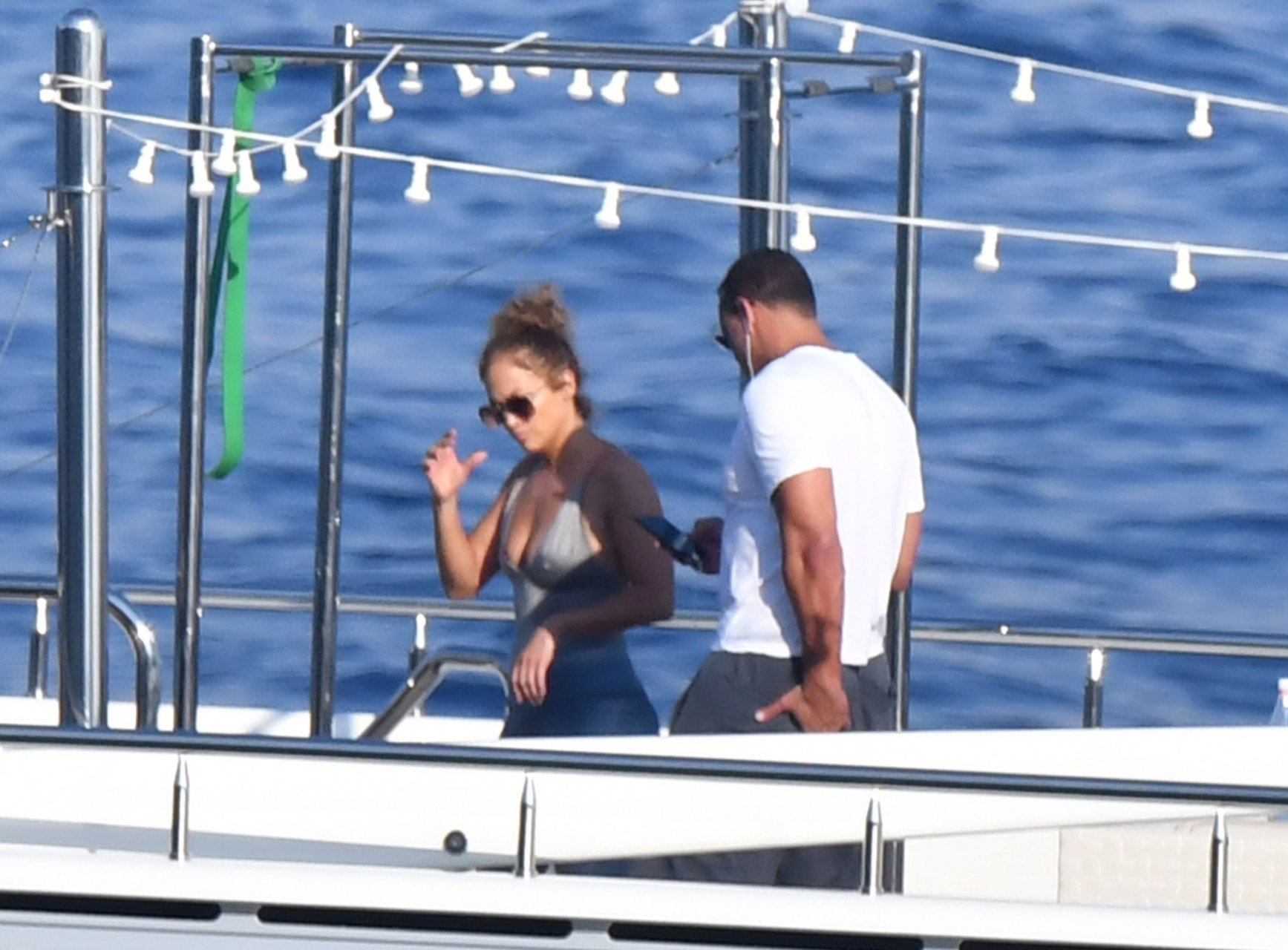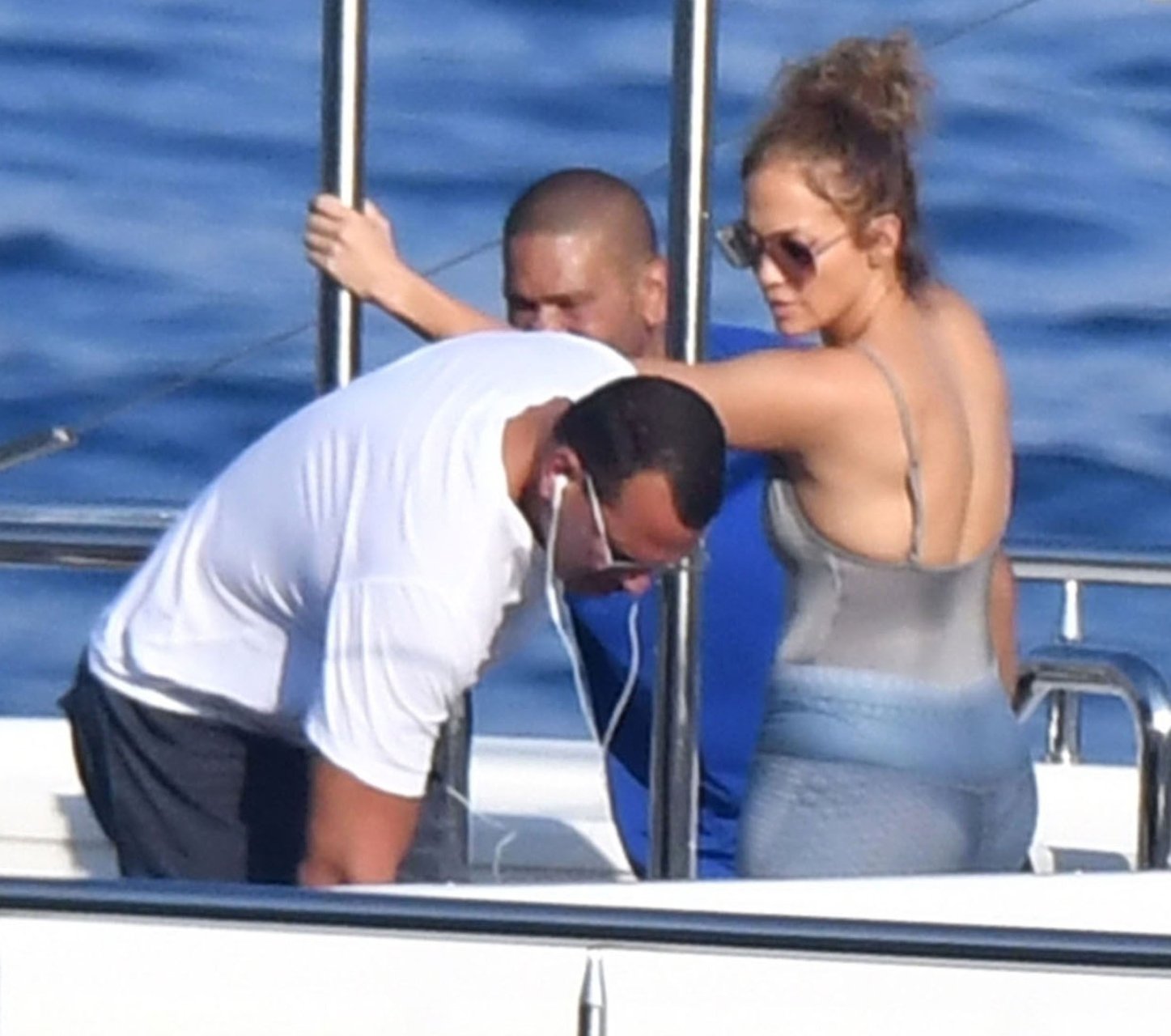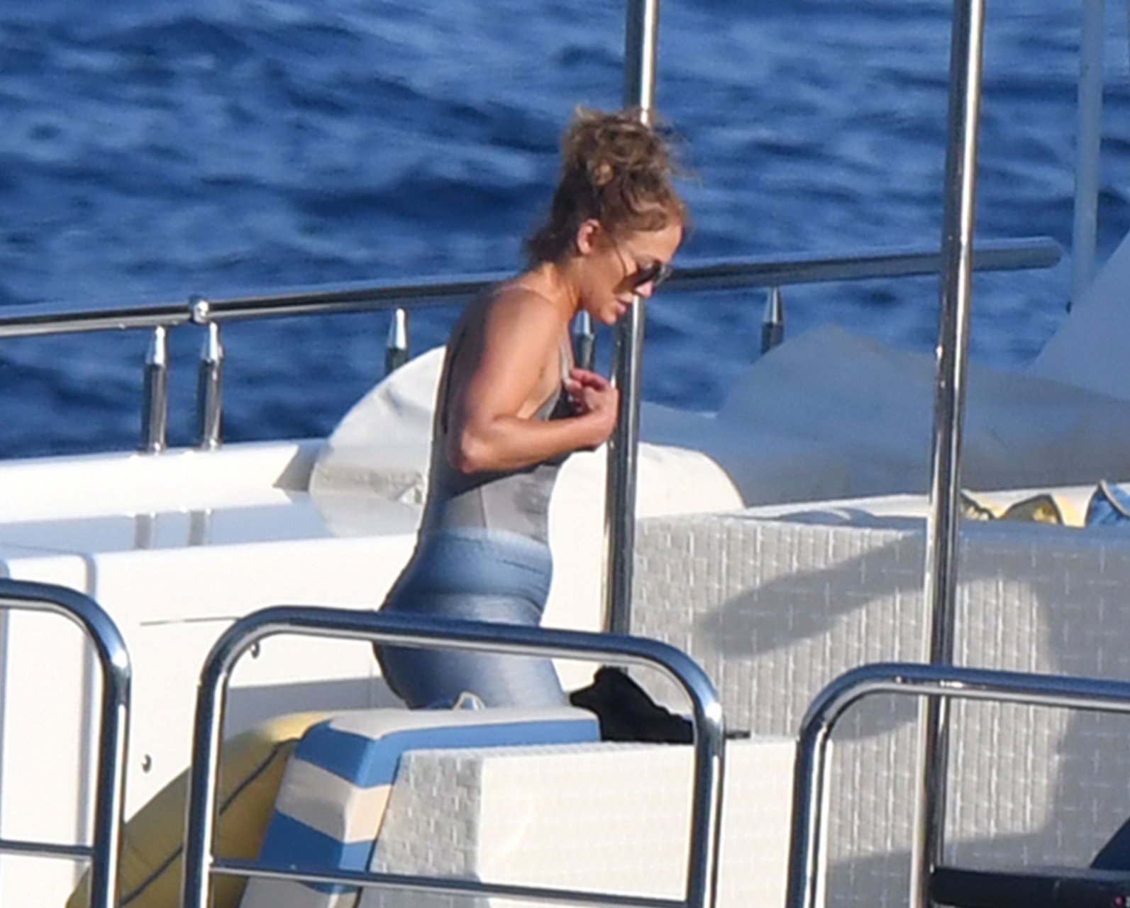 Дженнифер выглядела стильно в тёмных солнцезащитных очках и зелёном цельном купальнике, демонстрируя пышное декольте, пока занималась подтягиваниями вместе со своим менеджером и музыкальным продюсером Бенни Мединой. Алекс был замечен прыгающим с яхты и плывущим, а Джей-Ло снимала это на телефон.