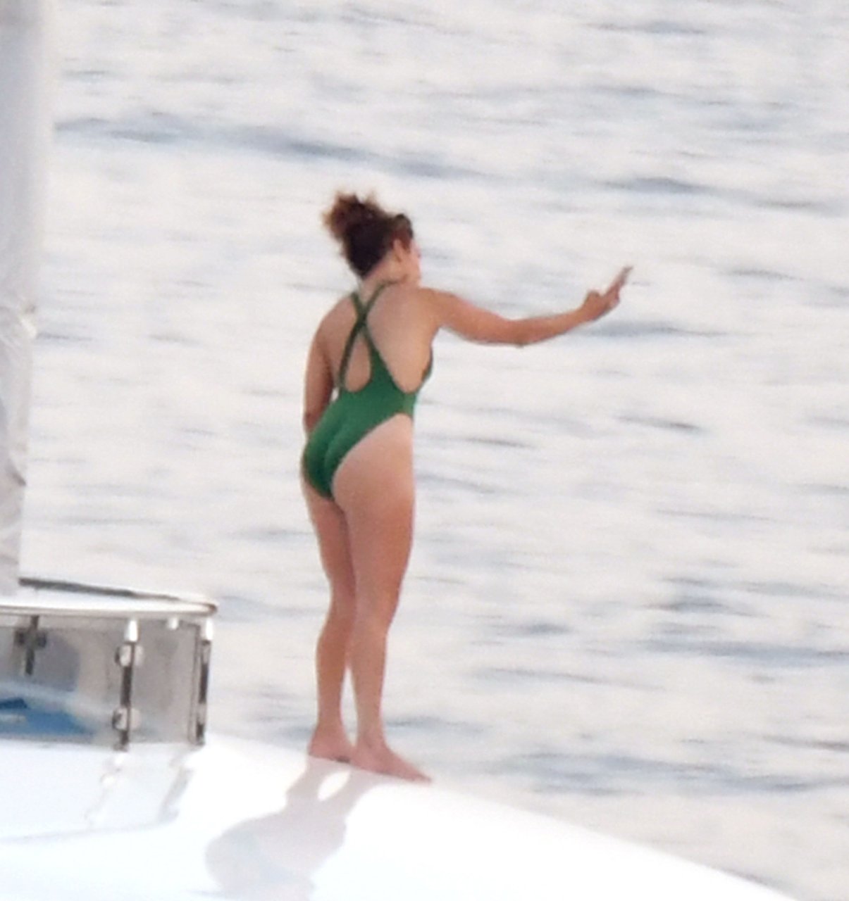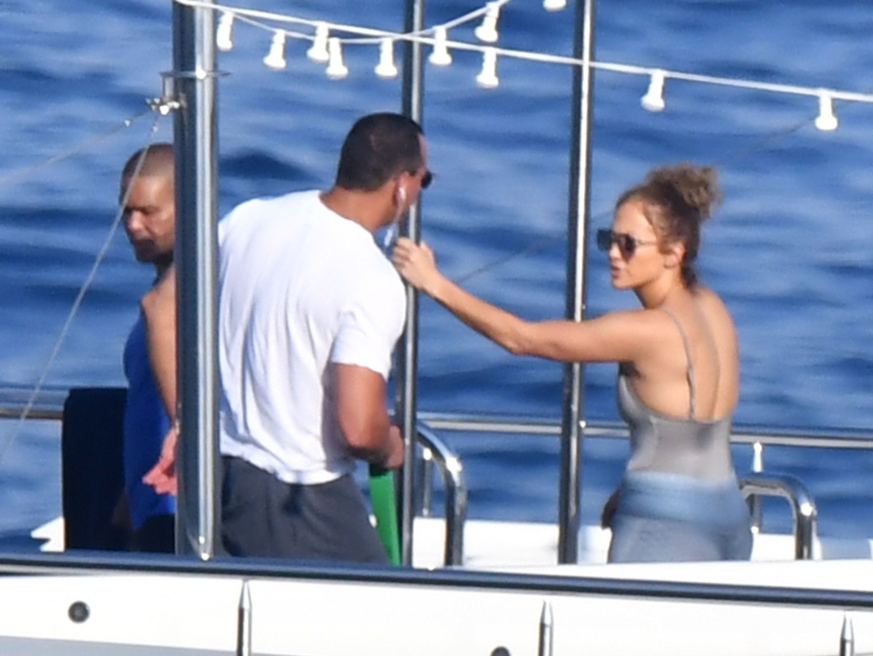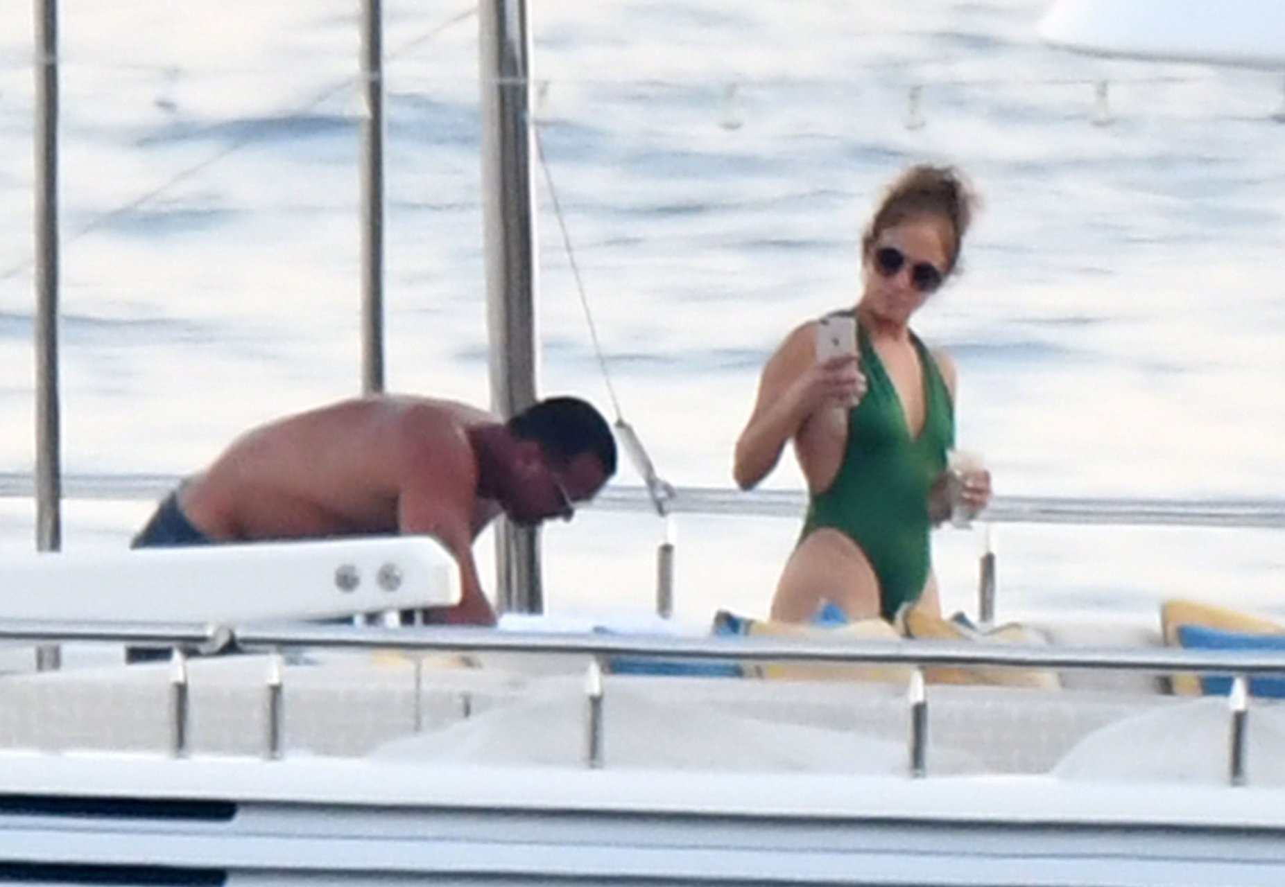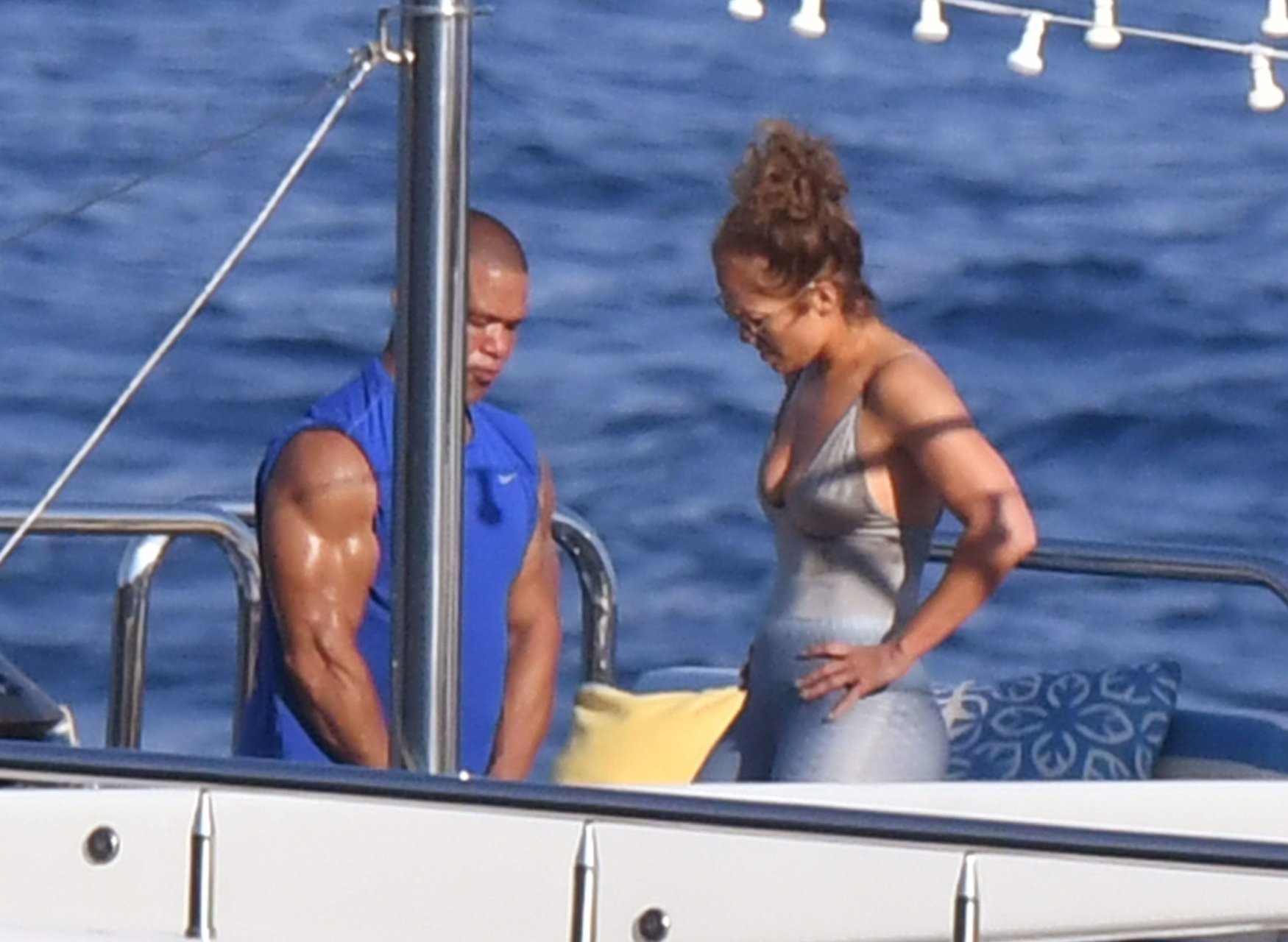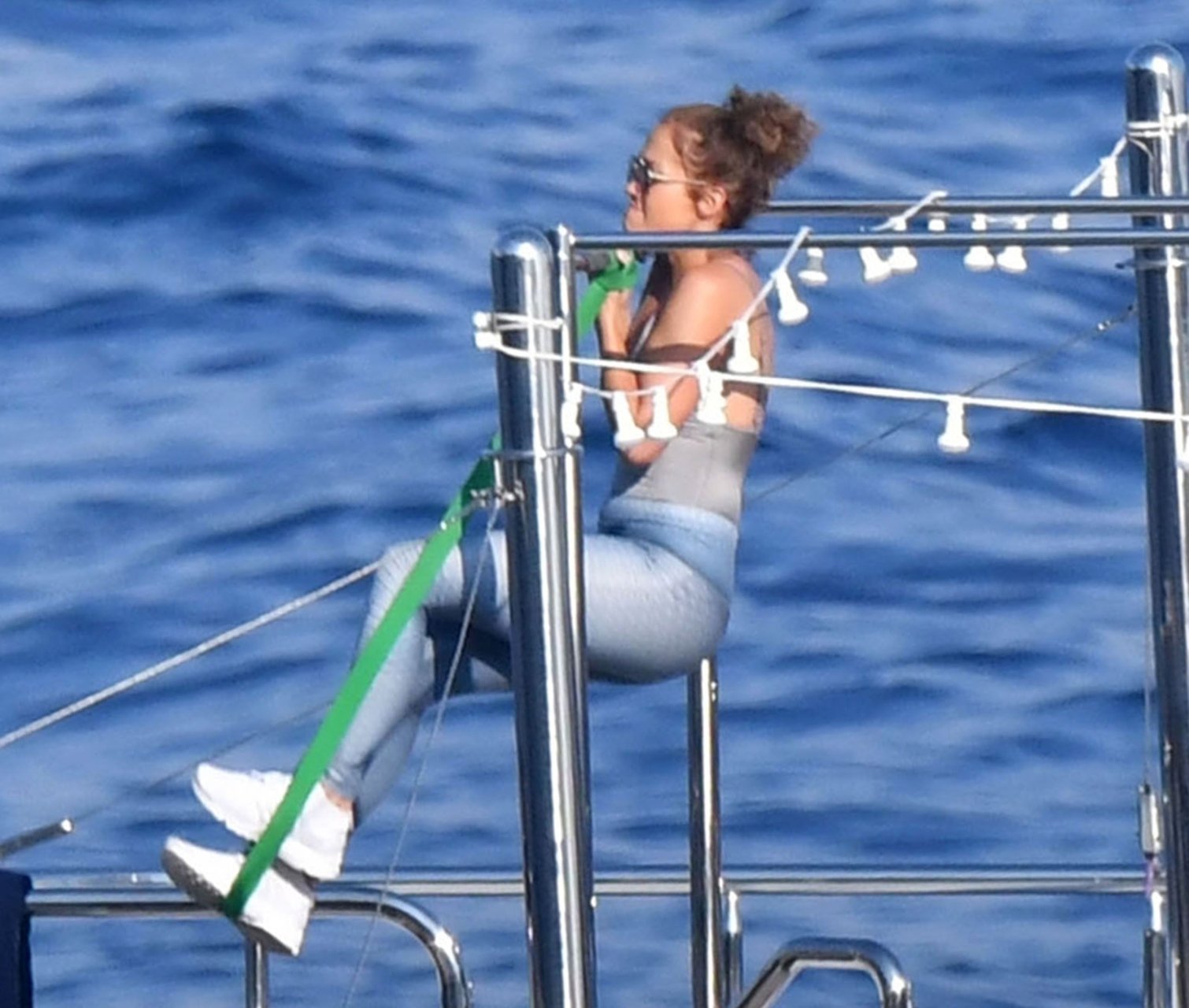 Дженнифер выглядела стильно в тёмных солнцезащитных очках и зелёном цельном купальнике, демонстрируя пышное декольте, пока занималась подтягиваниями вместе со своим менеджером и музыкальным продюсером Бенни Мединой. Алекс был замечен прыгающим с яхты и плывущим, а Джей-Ло снимала это на телефон.