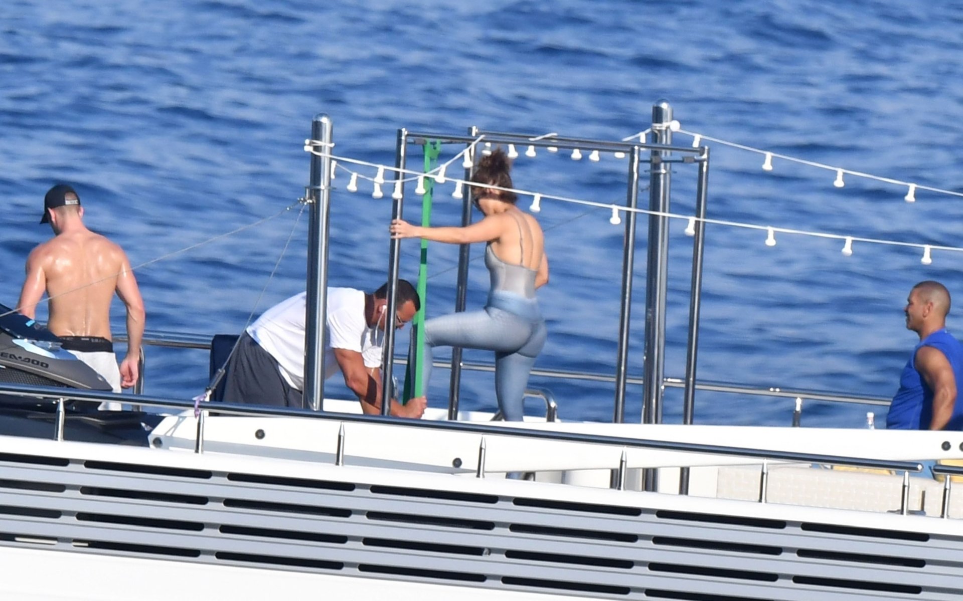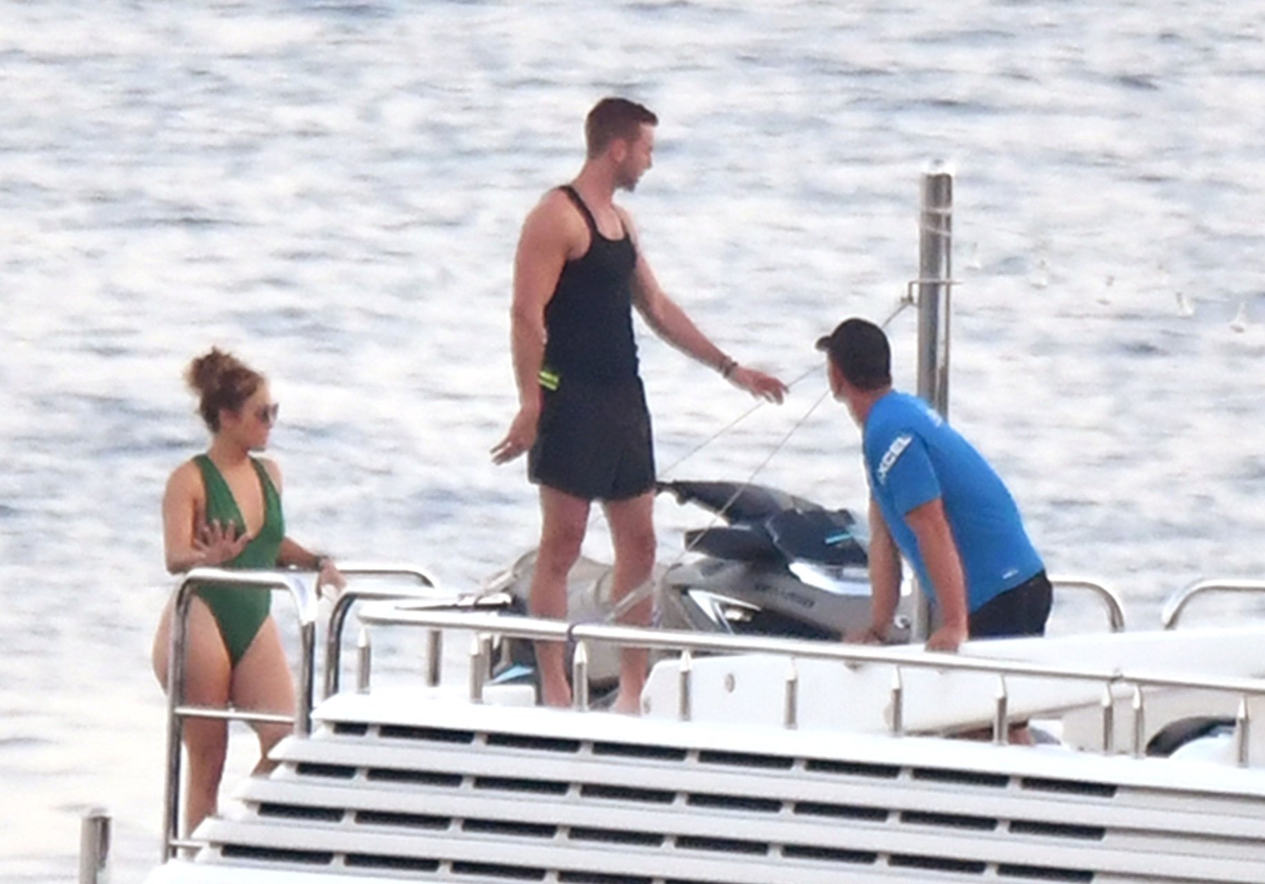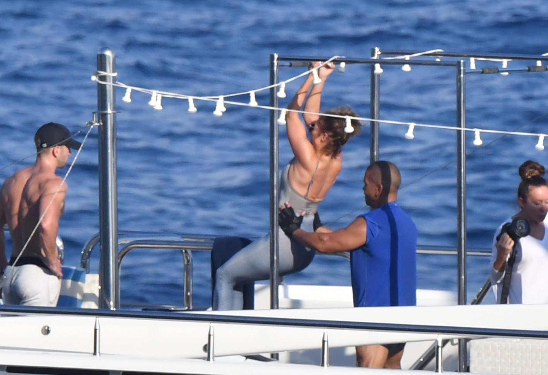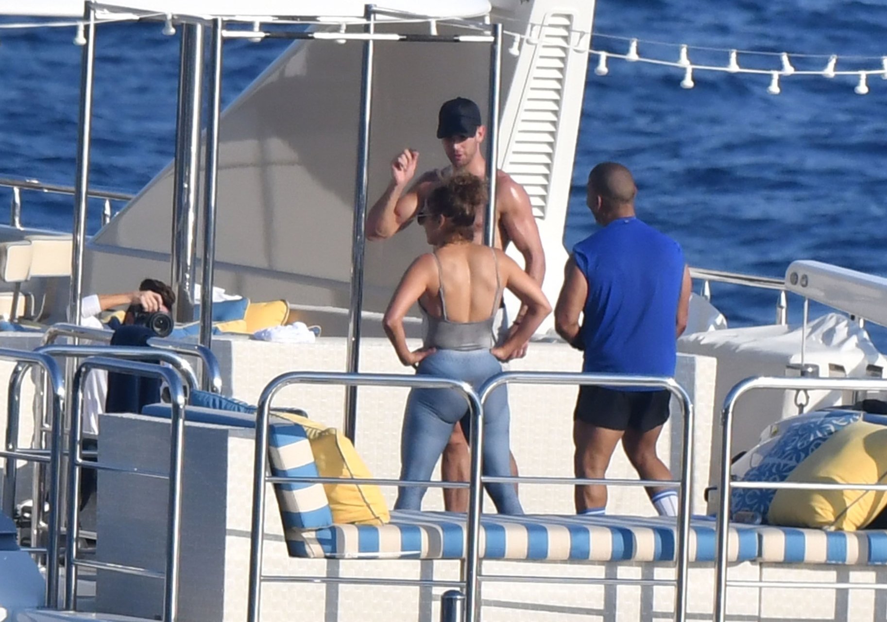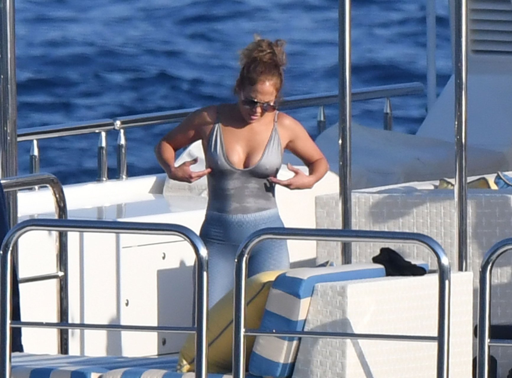 Дженнифер выглядела стильно в тёмных солнцезащитных очках и зелёном цельном купальнике, демонстрируя пышное декольте, пока занималась подтягиваниями вместе со своим менеджером и музыкальным продюсером Бенни Мединой. Алекс был замечен прыгающим с яхты и плывущим, а Джей-Ло снимала это на телефон.