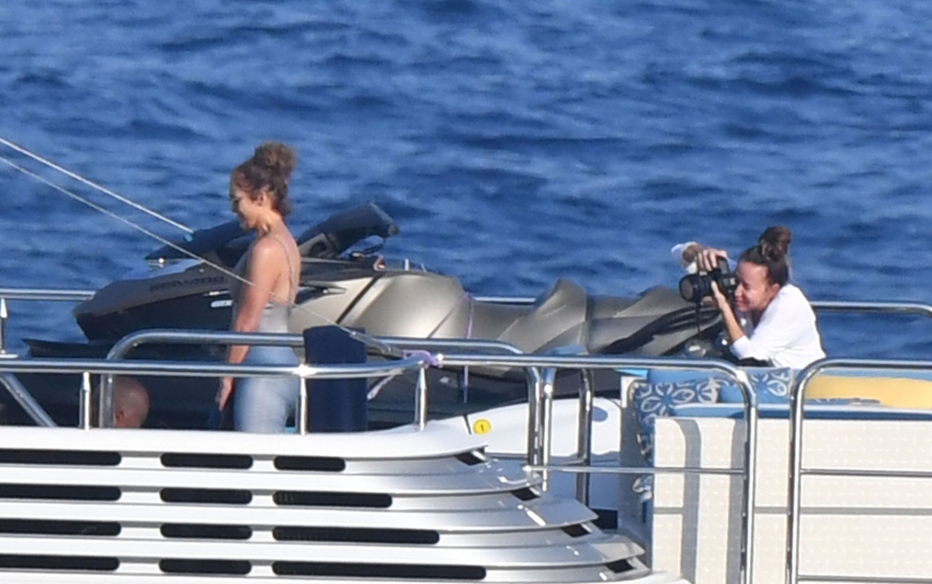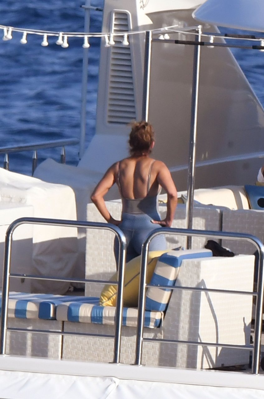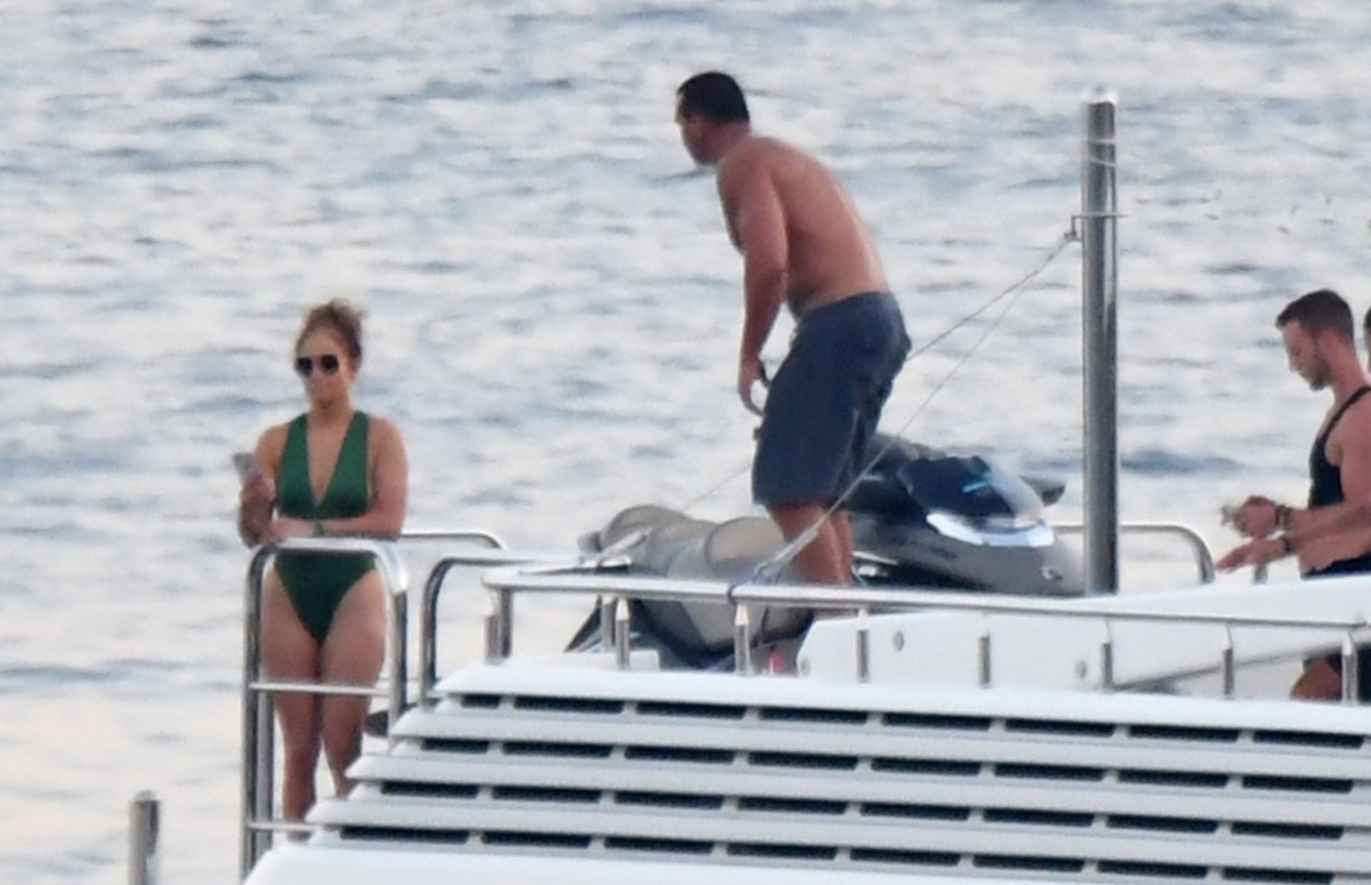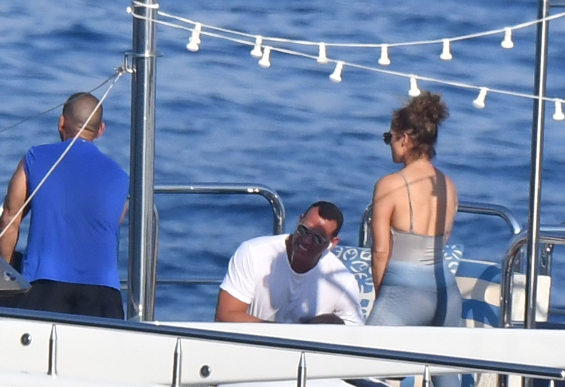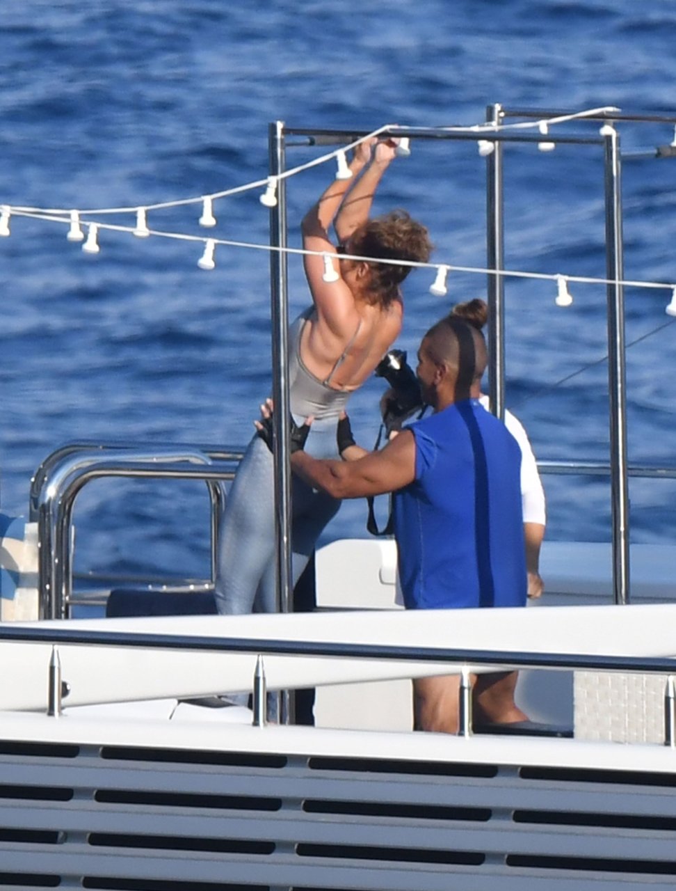 Дженнифер выглядела стильно в тёмных солнцезащитных очках и зелёном цельном купальнике, демонстрируя пышное декольте, пока занималась подтягиваниями вместе со своим менеджером и музыкальным продюсером Бенни Мединой. Алекс был замечен прыгающим с яхты и плывущим, а Джей-Ло снимала это на телефон.