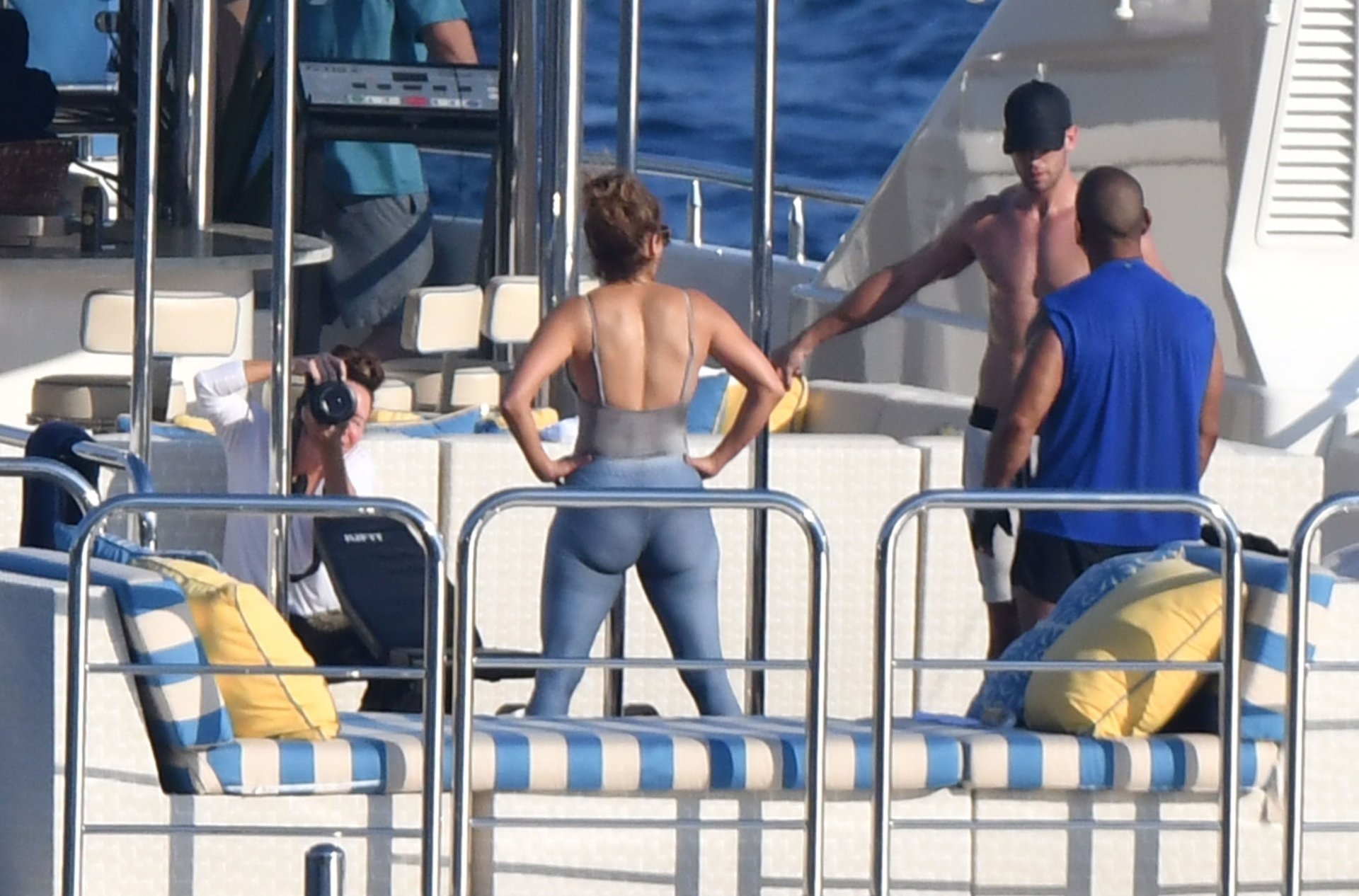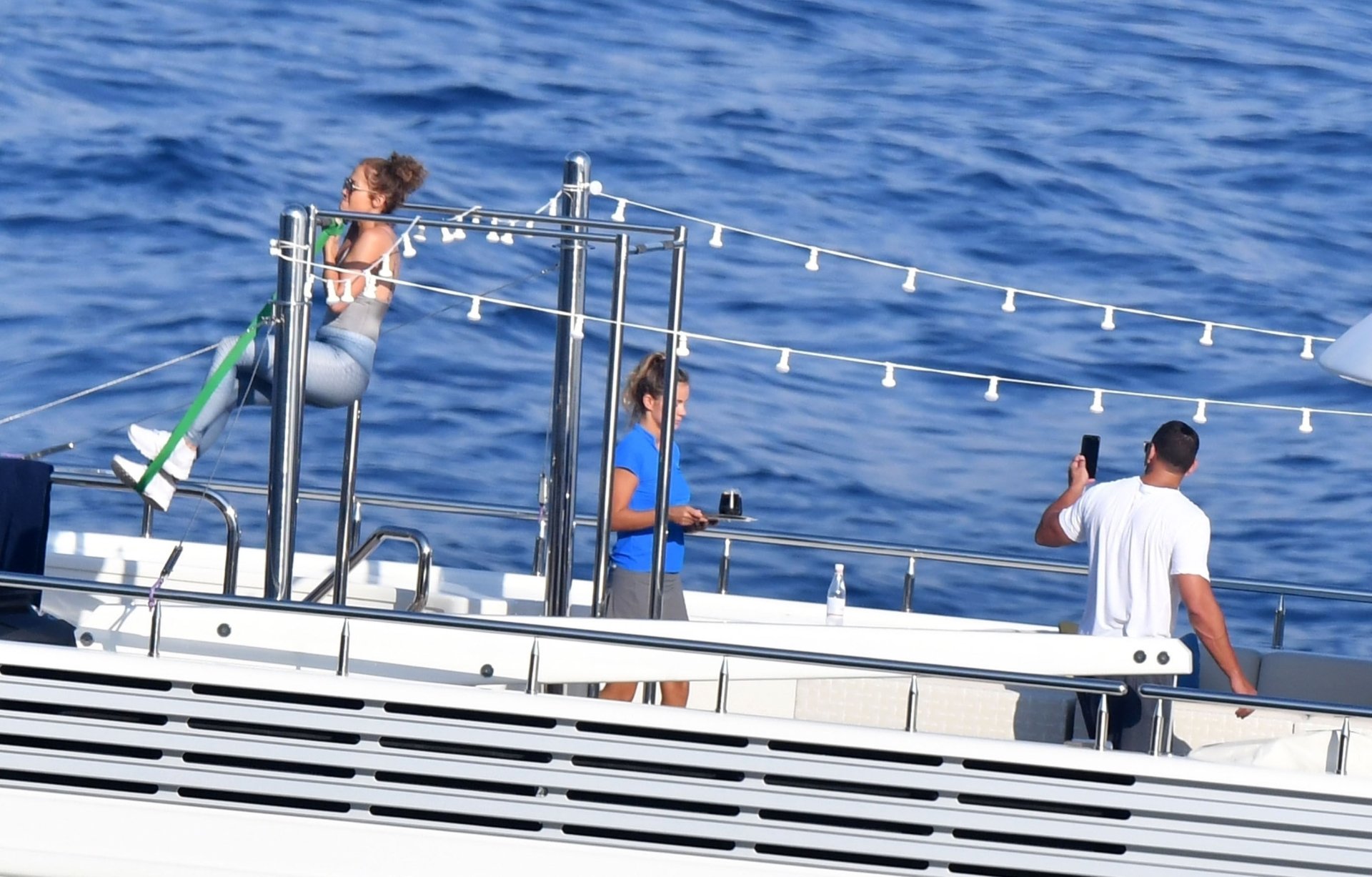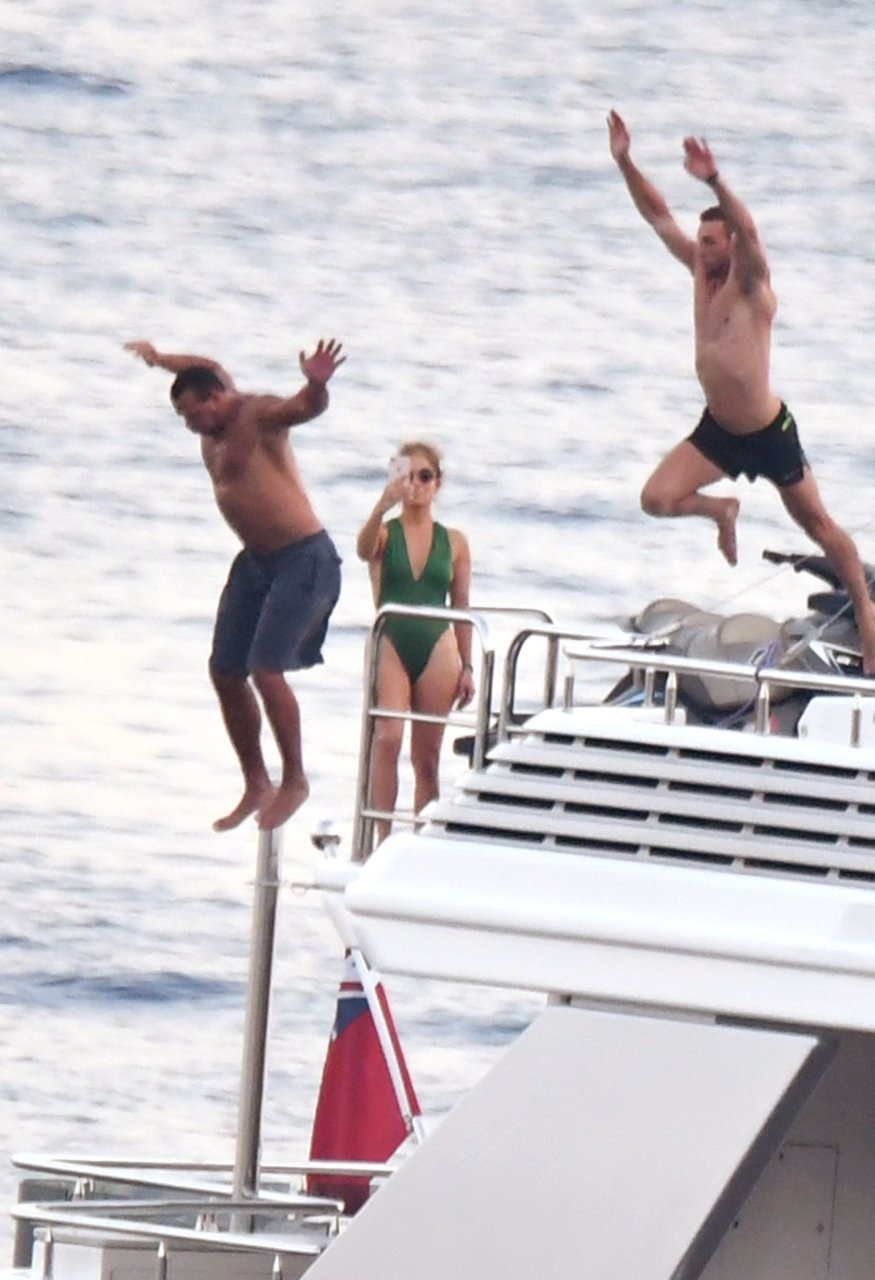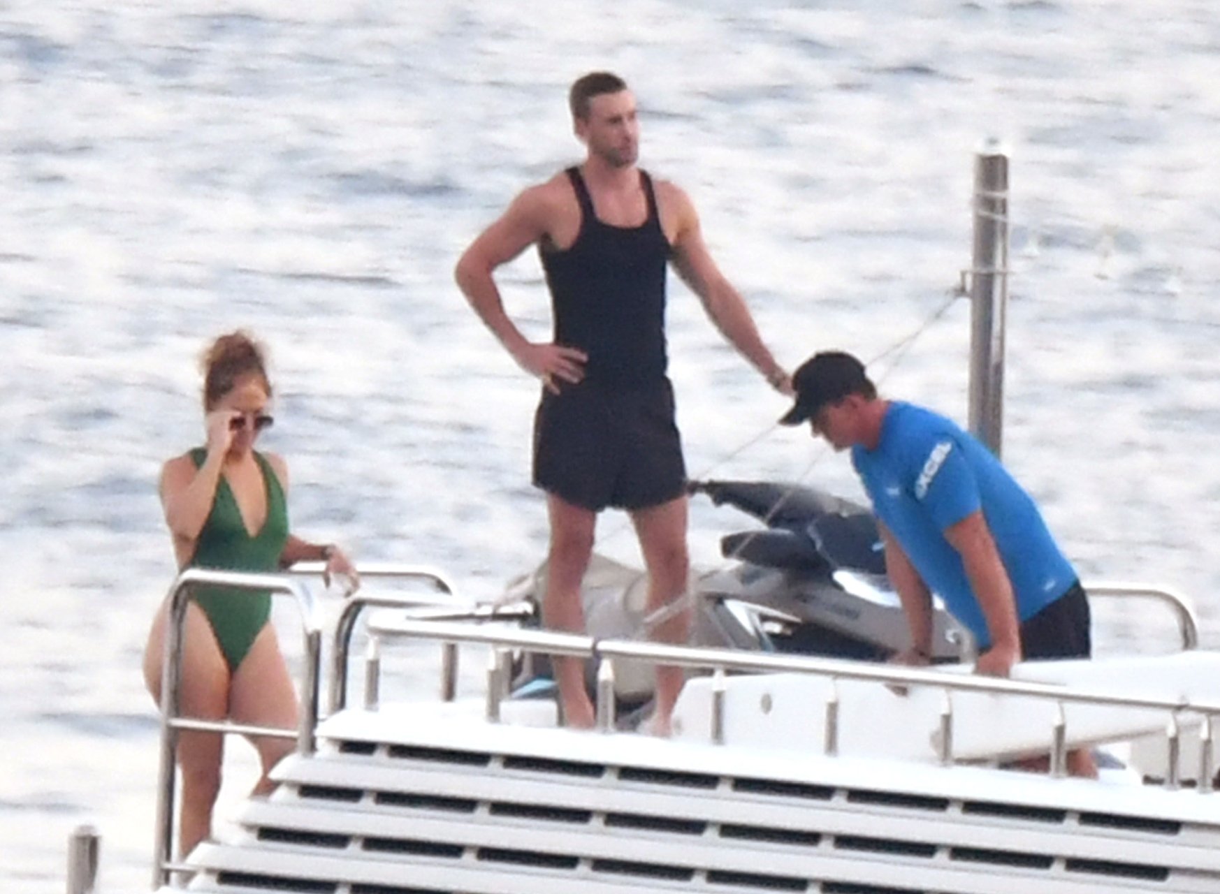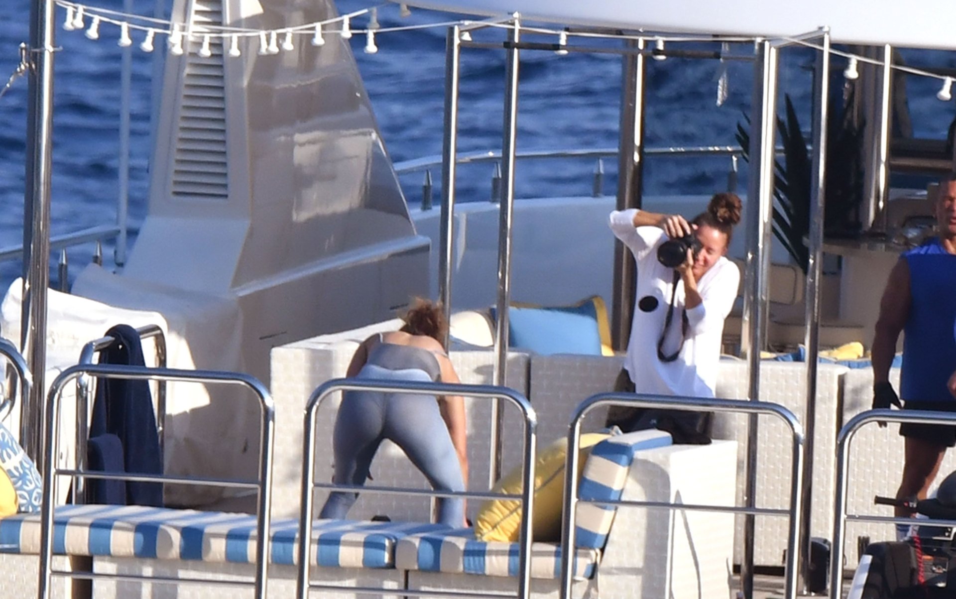 Дженнифер выглядела стильно в тёмных солнцезащитных очках и зелёном цельном купальнике, демонстрируя пышное декольте, пока занималась подтягиваниями вместе со своим менеджером и музыкальным продюсером Бенни Мединой. Алекс был замечен прыгающим с яхты и плывущим, а Джей-Ло снимала это на телефон.