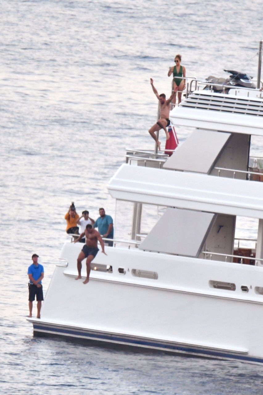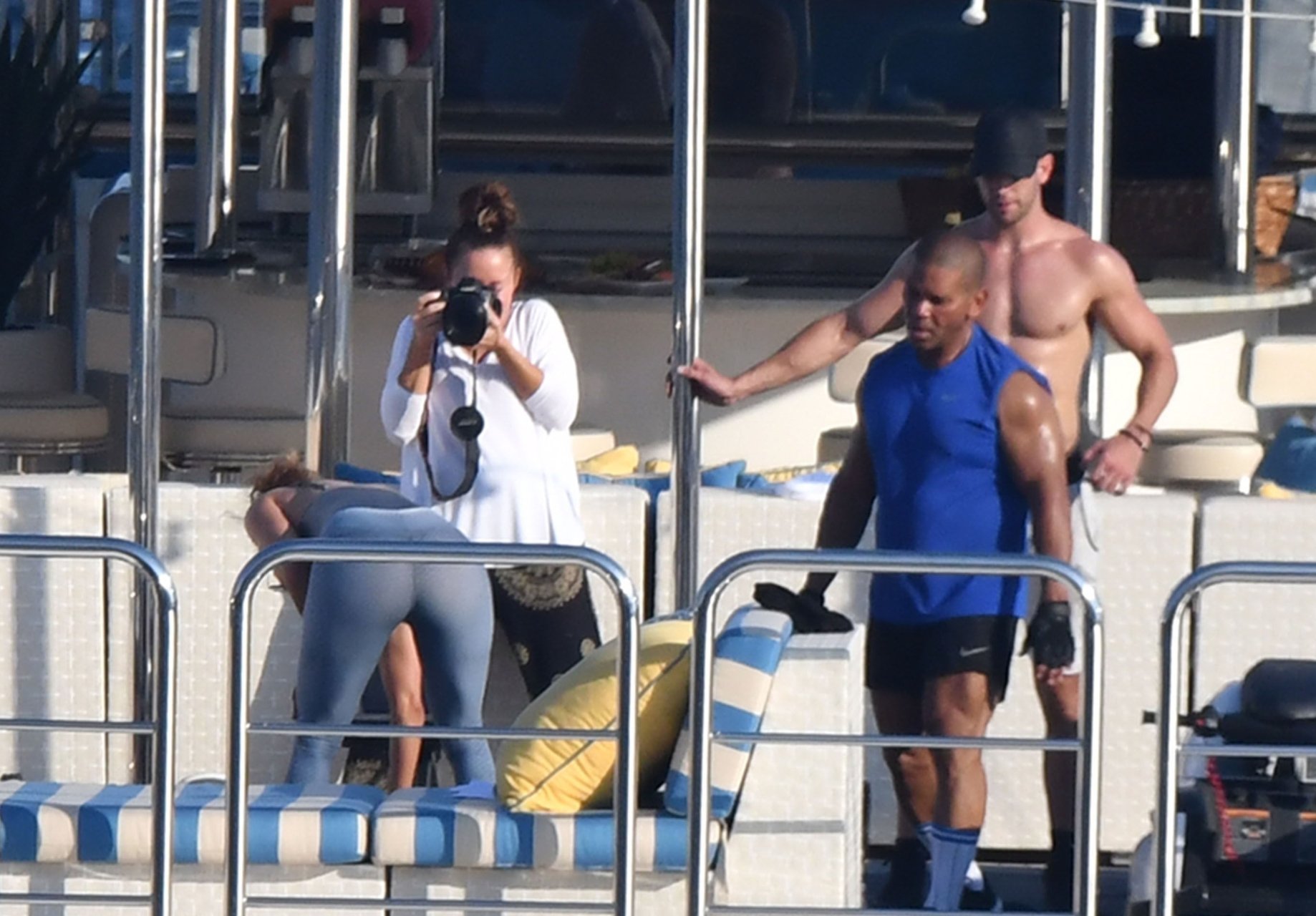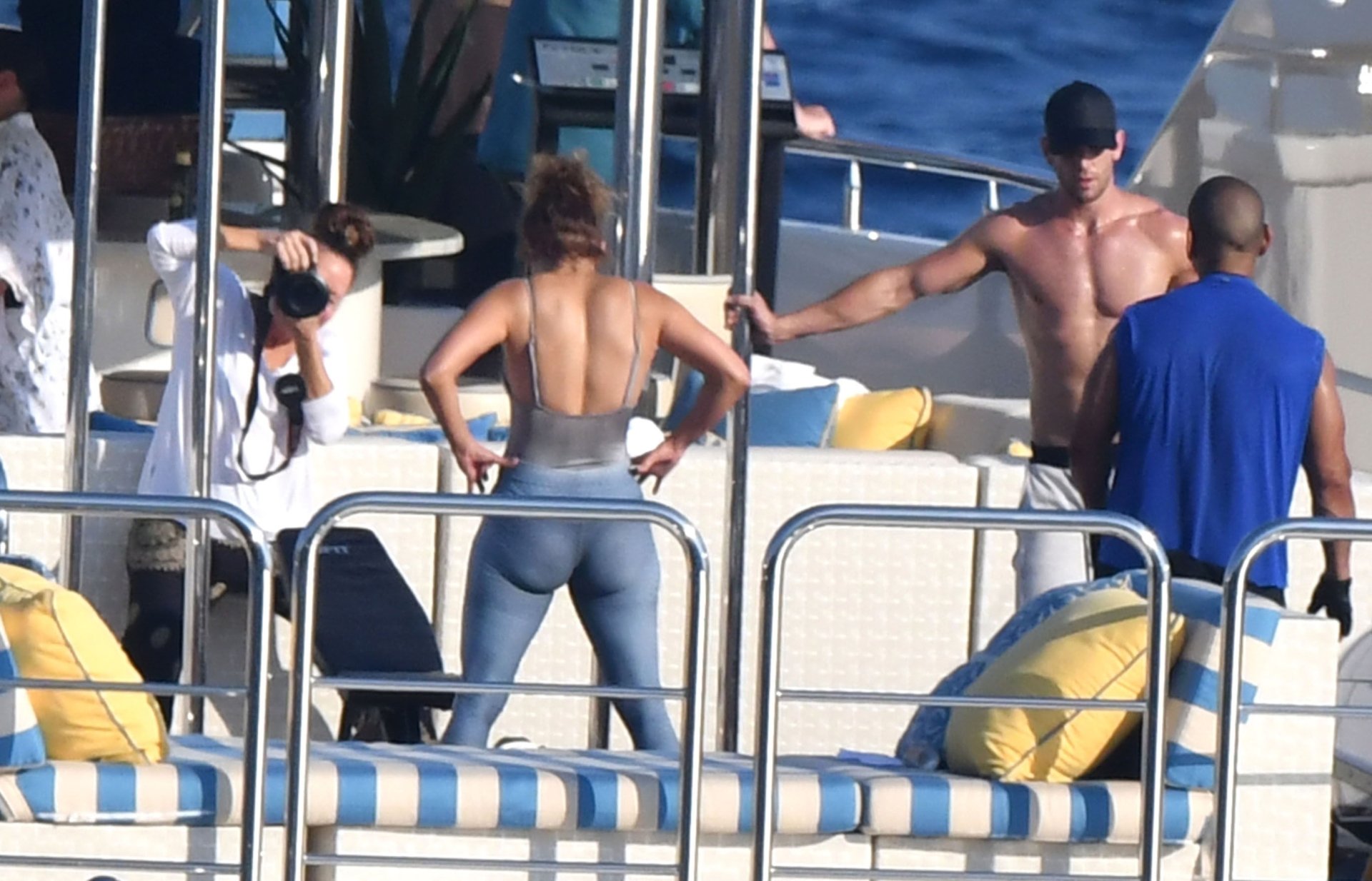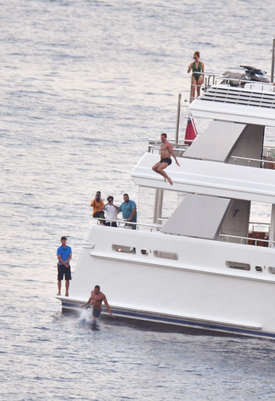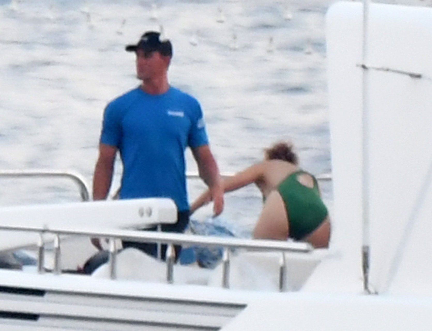 Дженнифер выглядела стильно в тёмных солнцезащитных очках и зелёном цельном купальнике, демонстрируя пышное декольте, пока занималась подтягиваниями вместе со своим менеджером и музыкальным продюсером Бенни Мединой. Алекс был замечен прыгающим с яхты и плывущим, а Джей-Ло снимала это на телефон.