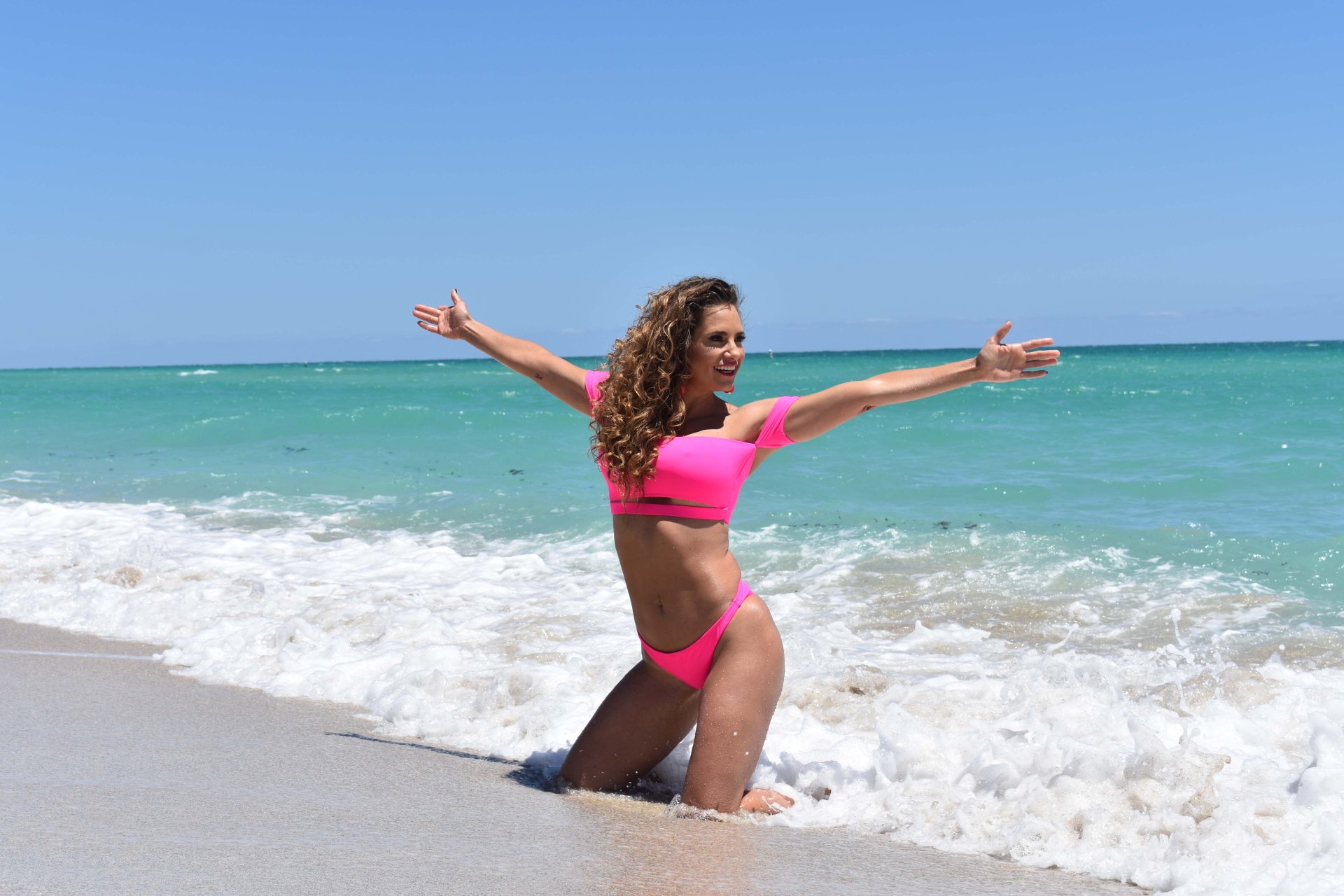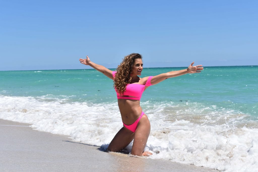 Фитнес-модель и лайф-коуч Дженнифер Никол Ли, 42 года, провела новую фотосессию в розовом бикини на пляже в Майами-Бич, 24.04.2018. МИЛФ продемонстрировала свое загорелое тело в честь нового выпуска журнала Ocean Magazine.
