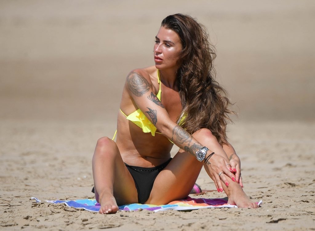 Звезда шоу “Ex On The Beach” Дженни Томпсон была замечена на пляже, позируя с намёком на топлесс, 07/08/2018. Брюнетка продемонстрировала своё загорелое тело с татуировками, надев чёрно-жёлтый бикини.
