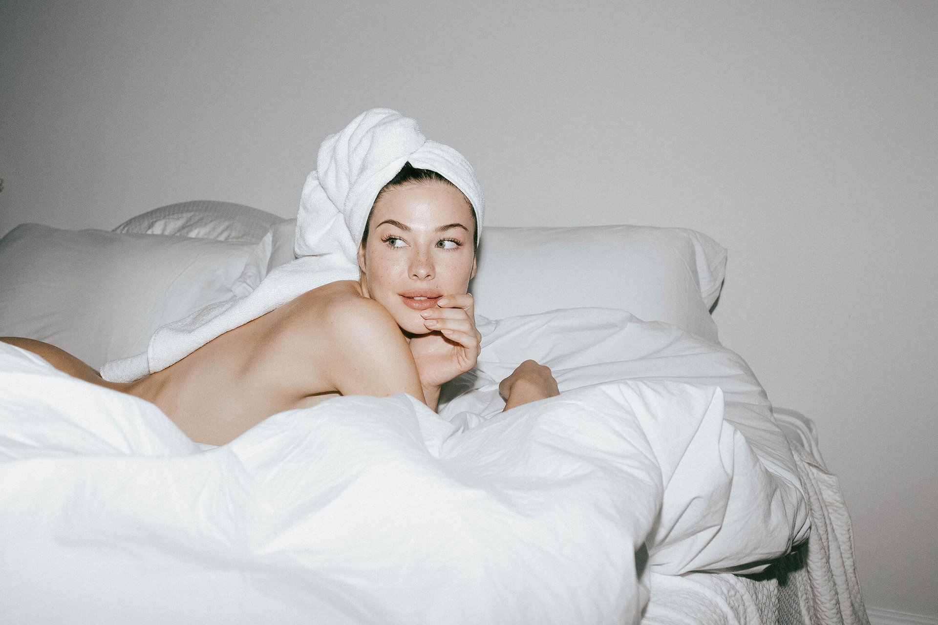 Американская модель Дженни Уотвуд в обнажённых фотографиях от Брук Ханмер (2019). 29-летняя красотка была сфотографирована лежащей в постели полностью голой с полотенцем на голове и покрытой одеялом.
