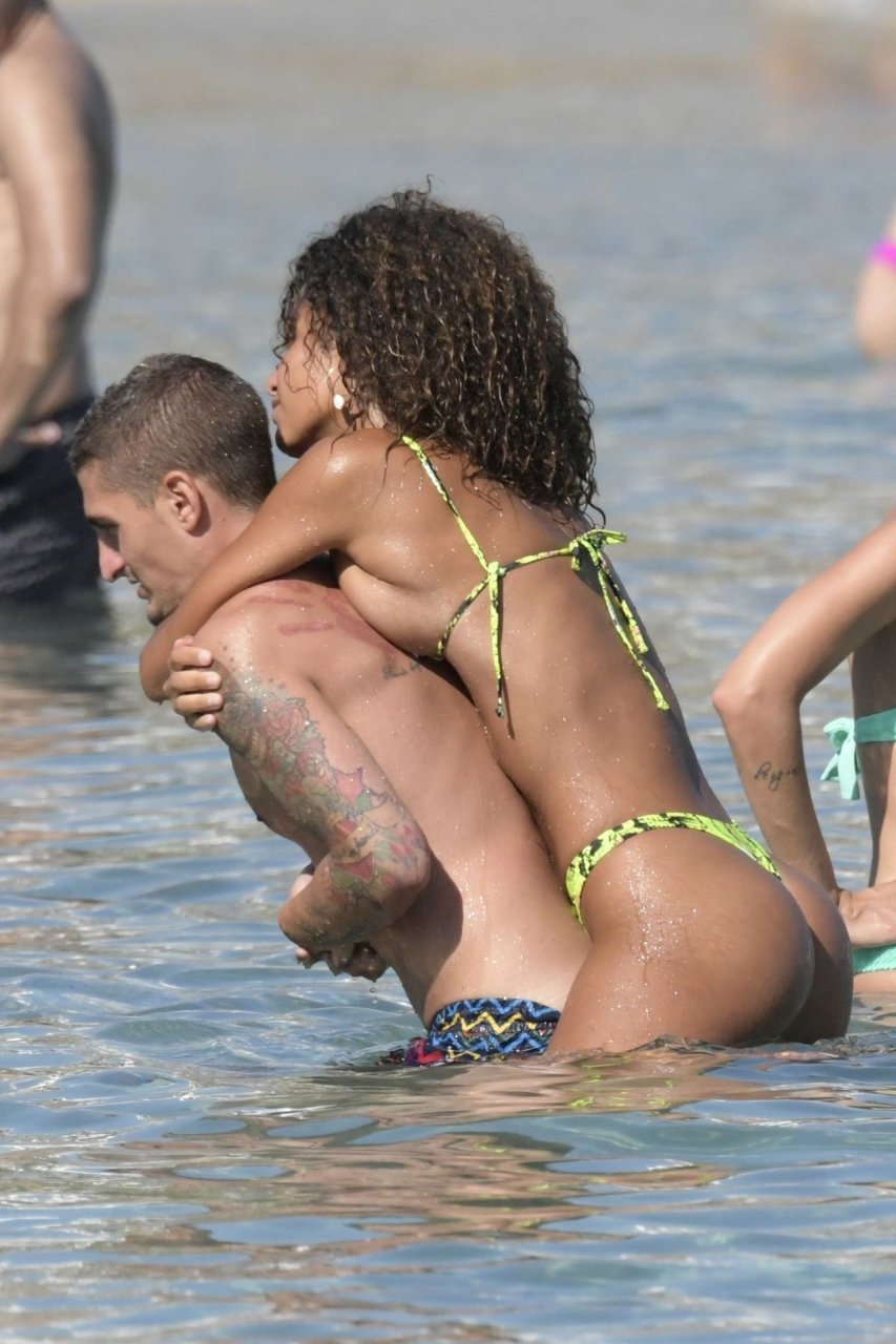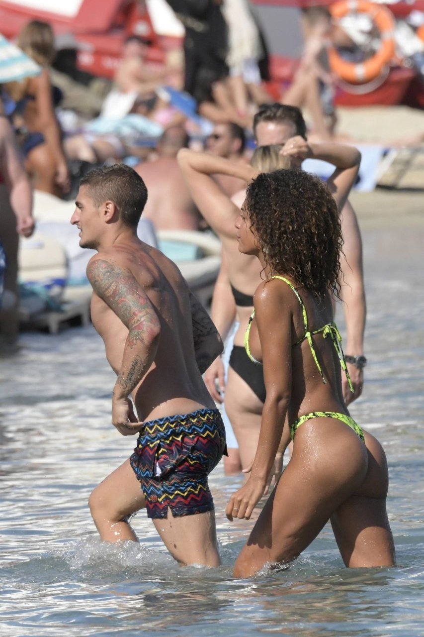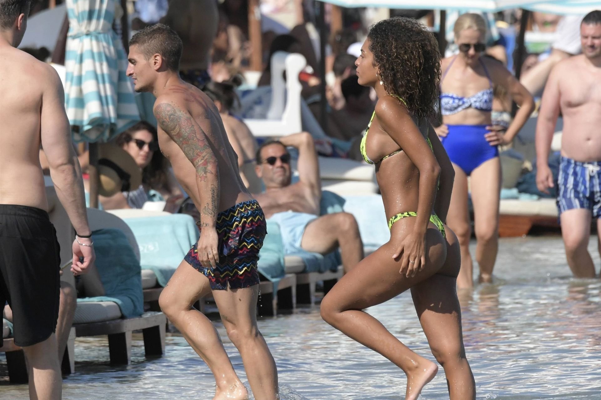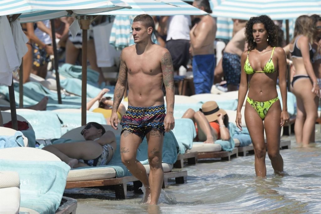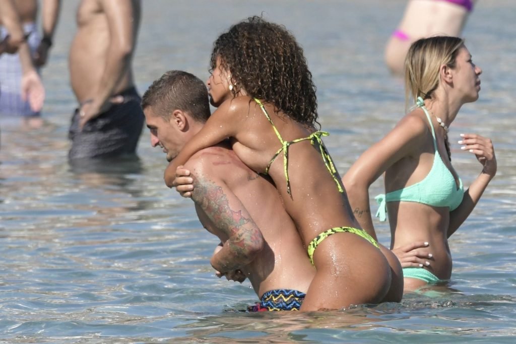 Итальянский футболист Пари Сен-Жермен Марко Верратти и Джессика Айди наслаждаются летним отпуском на острове Миконос, 07/06/2019. Они демонстрируют свою любовь, брызгаясь на пляже.