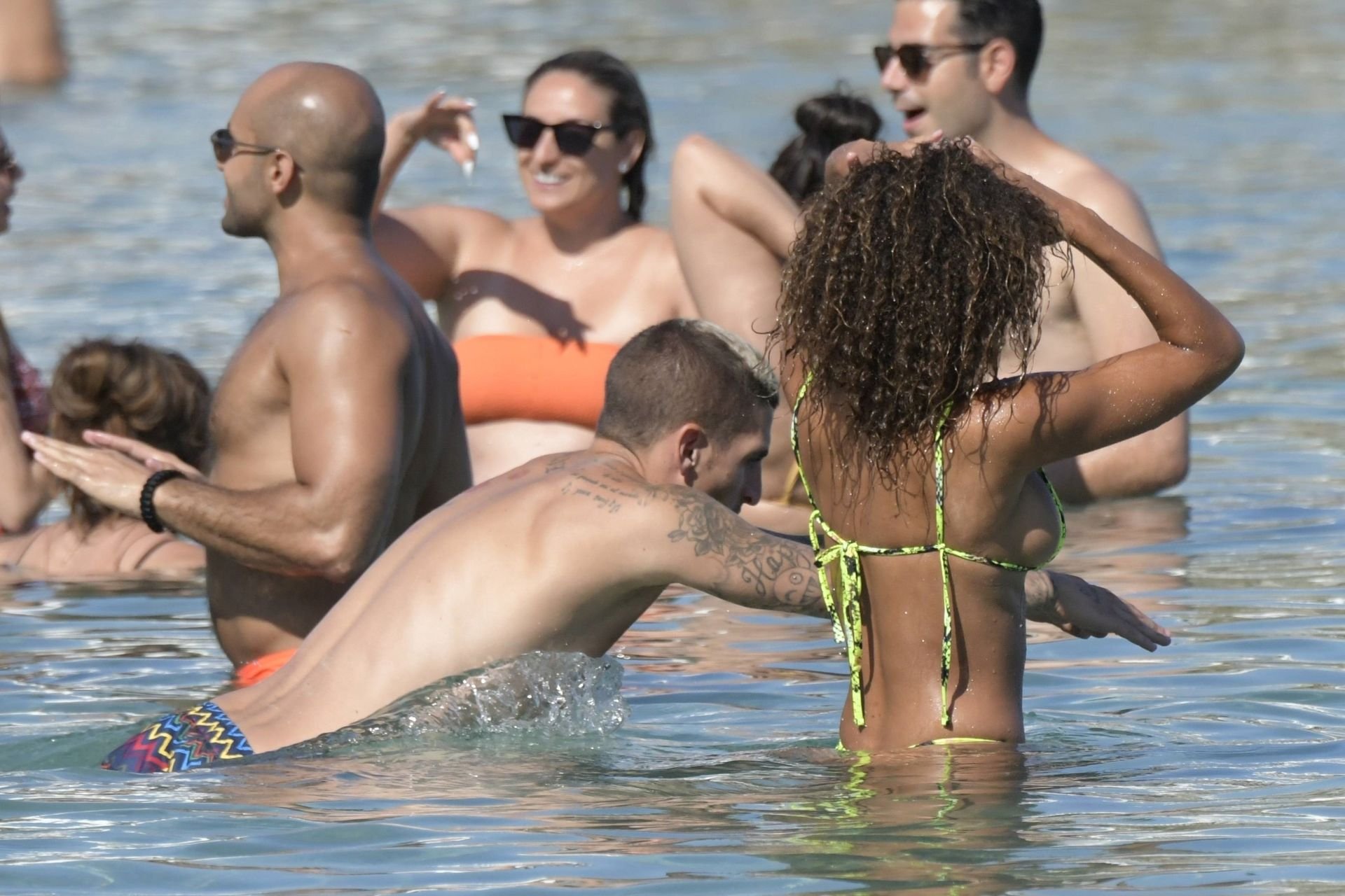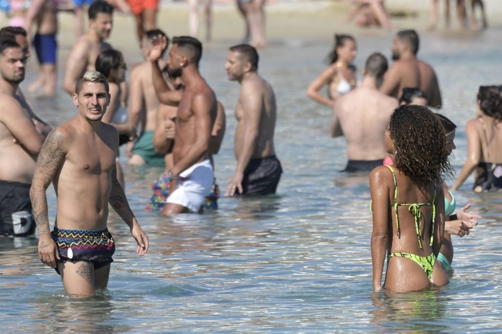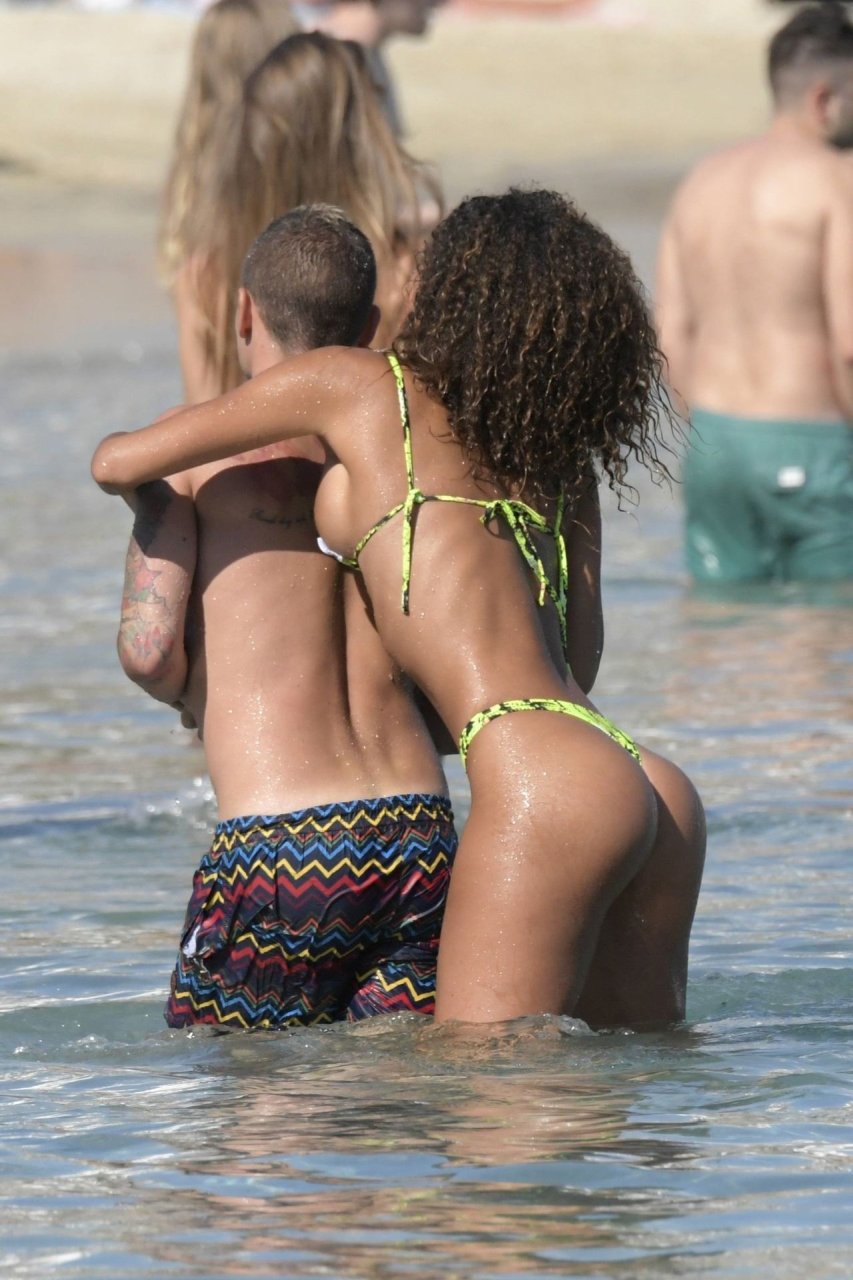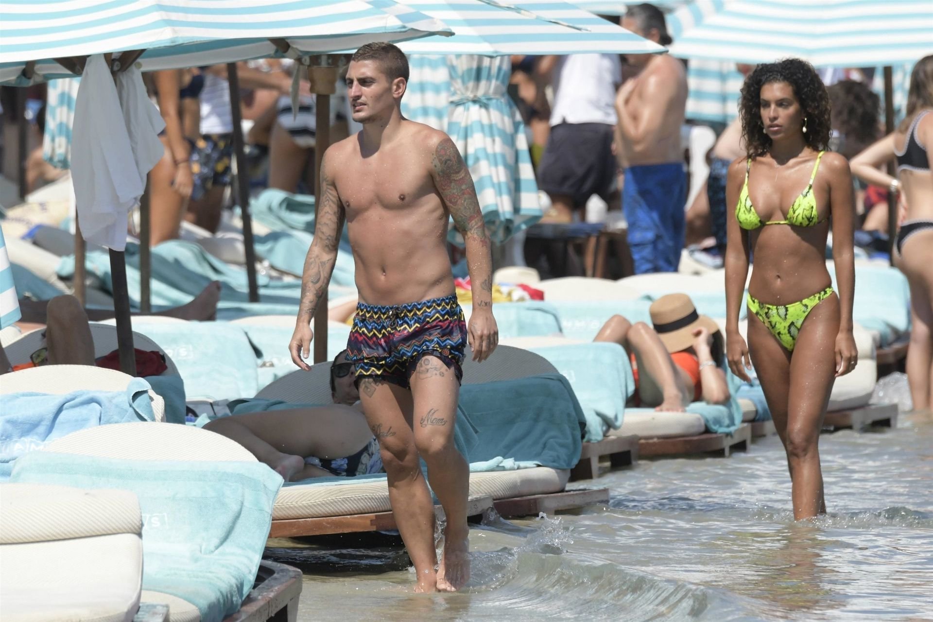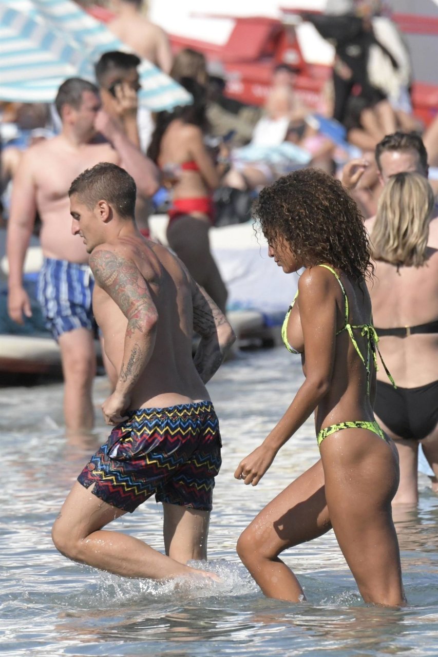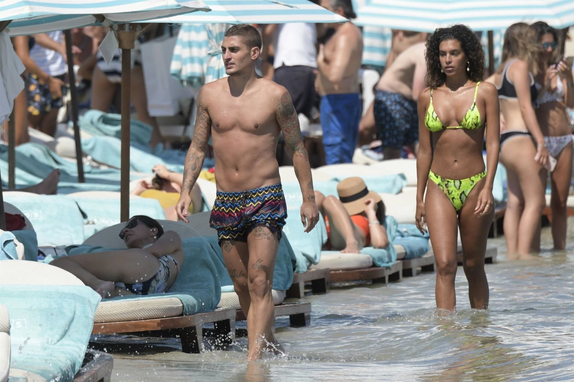 Итальянский футболист Пари Сен-Жермен Марко Верратти и Джессика Айди наслаждаются летним отпуском на острове Миконос, 07/06/2019. Они демонстрируют свою любовь, брызгаясь на пляже.