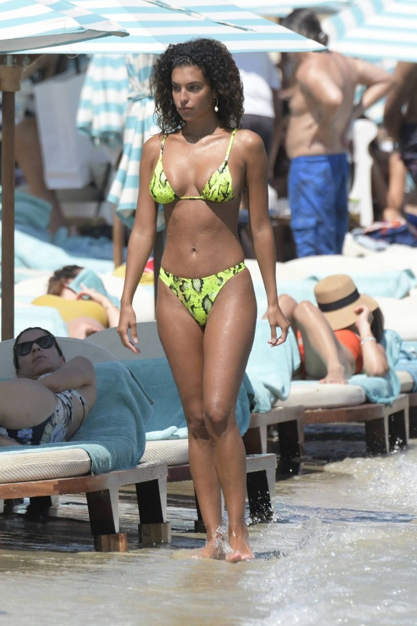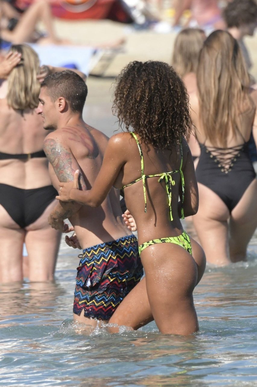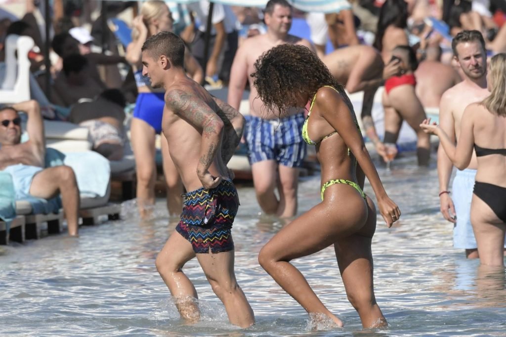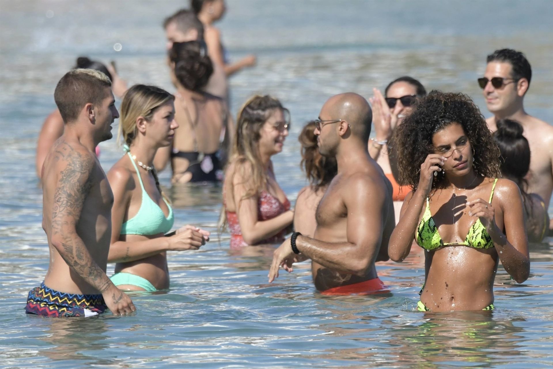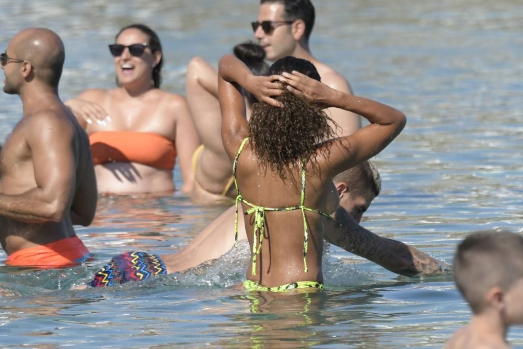 Итальянский футболист Пари Сен-Жермен Марко Верратти и Джессика Айди наслаждаются летним отпуском на острове Миконос, 07/06/2019. Они демонстрируют свою любовь, брызгаясь на пляже.