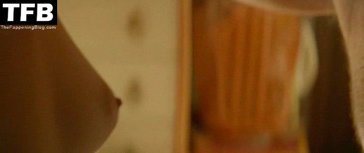 Jessica De Gouw is seen behind as she lies on her side on a bed in just a pair of panties with her bareback in view. We then see a bit of her left tit as she sits down on the edge of the bed wearing a very loose shirt.