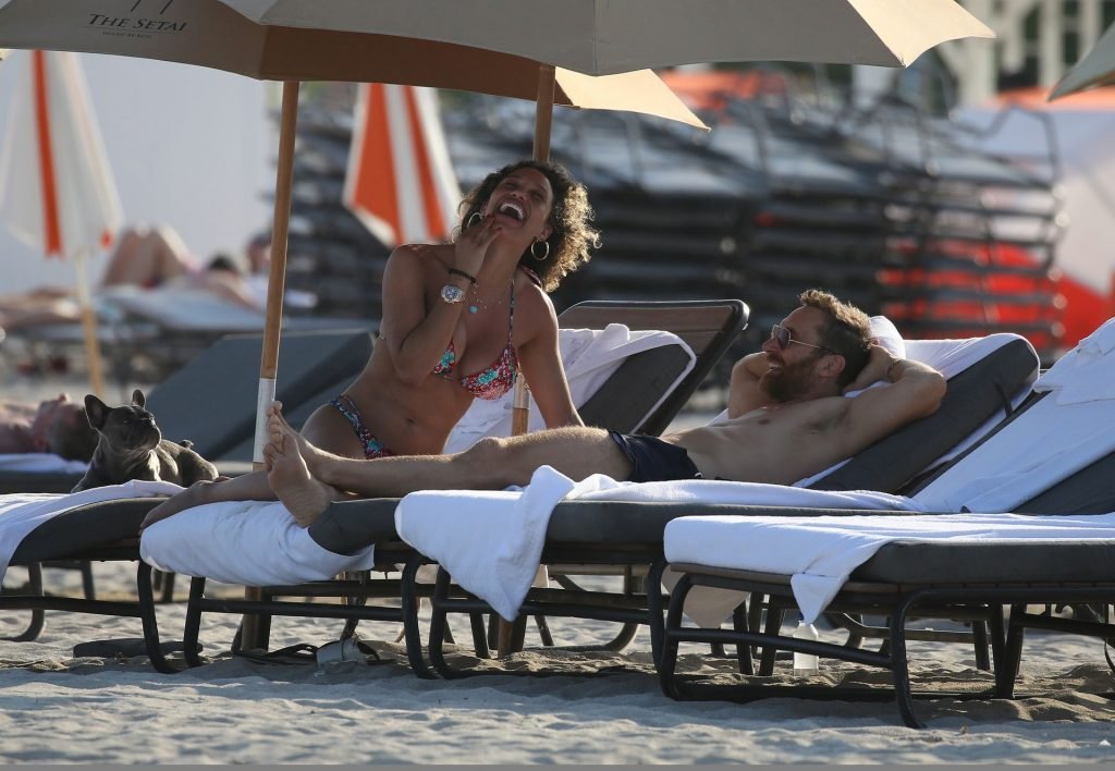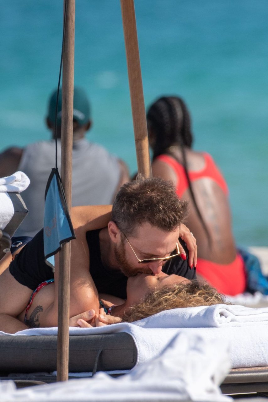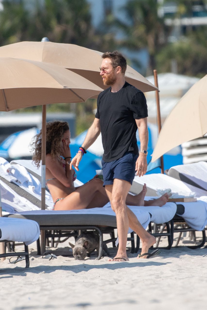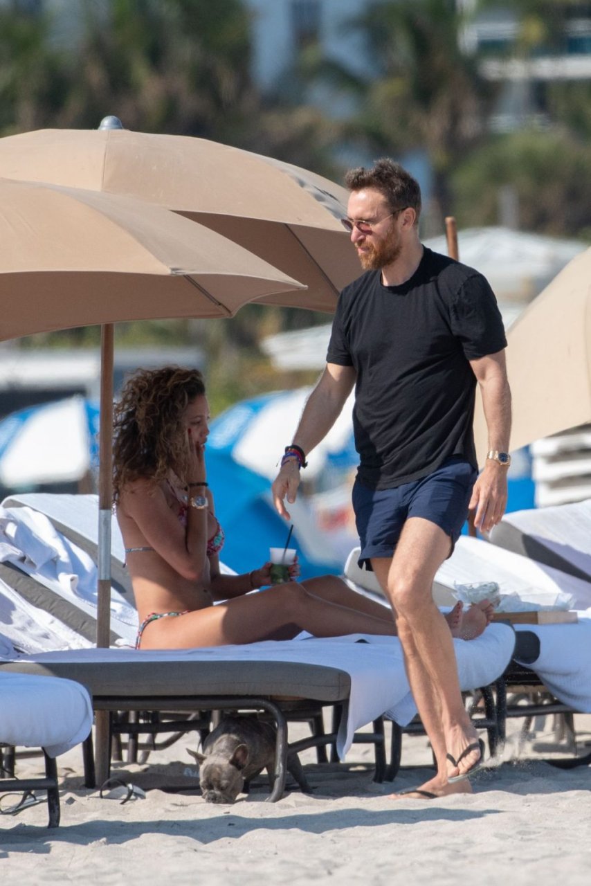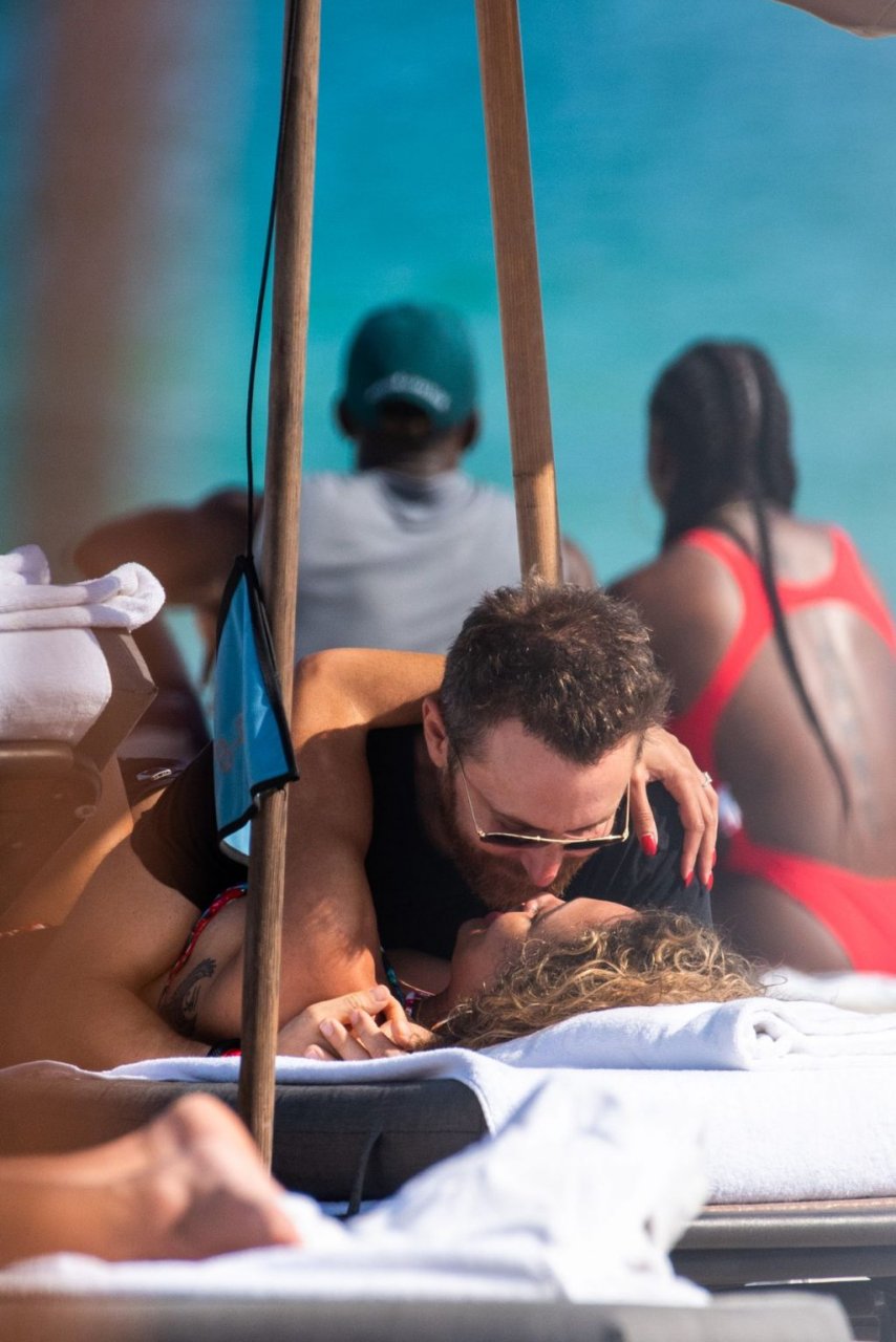 Dj David Guetta и его девушка Джессика Ледон страстно целуются на пляже в Майами-Бич, 12.03.2019. Джесс продемонстрировала свои изгибы, играя с собакой.