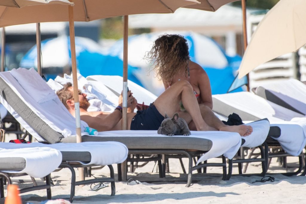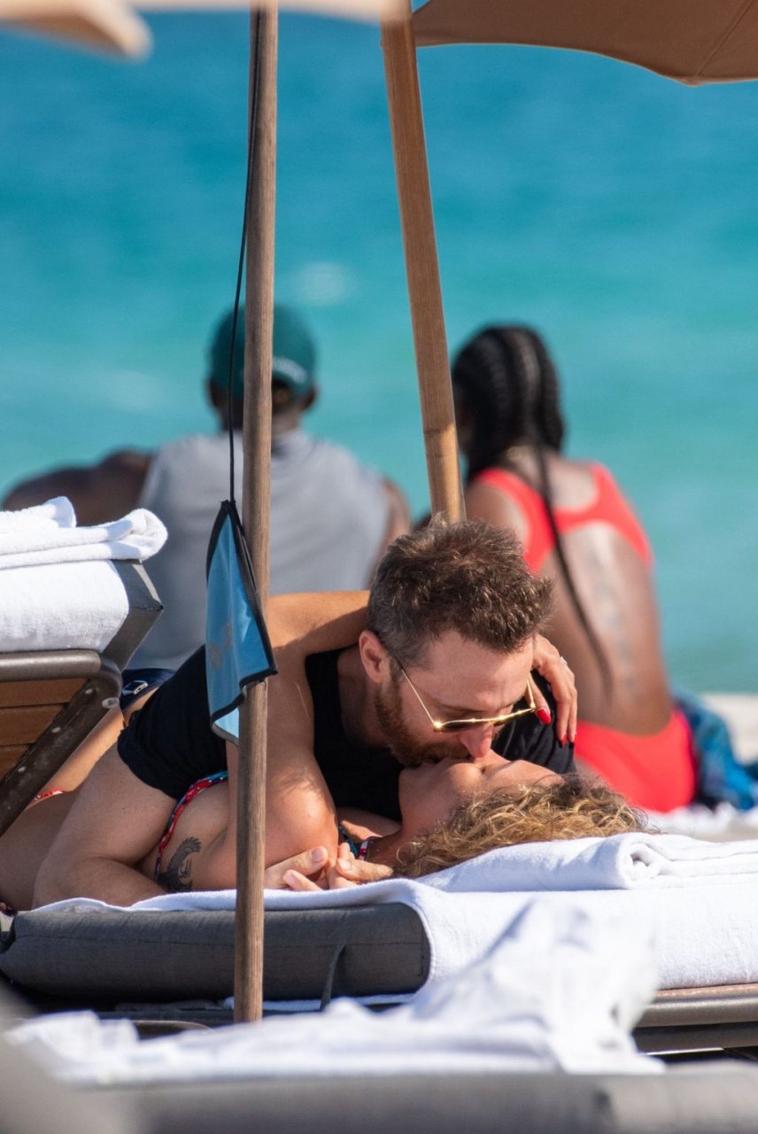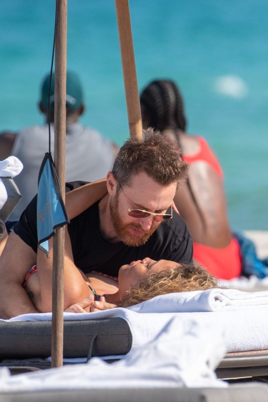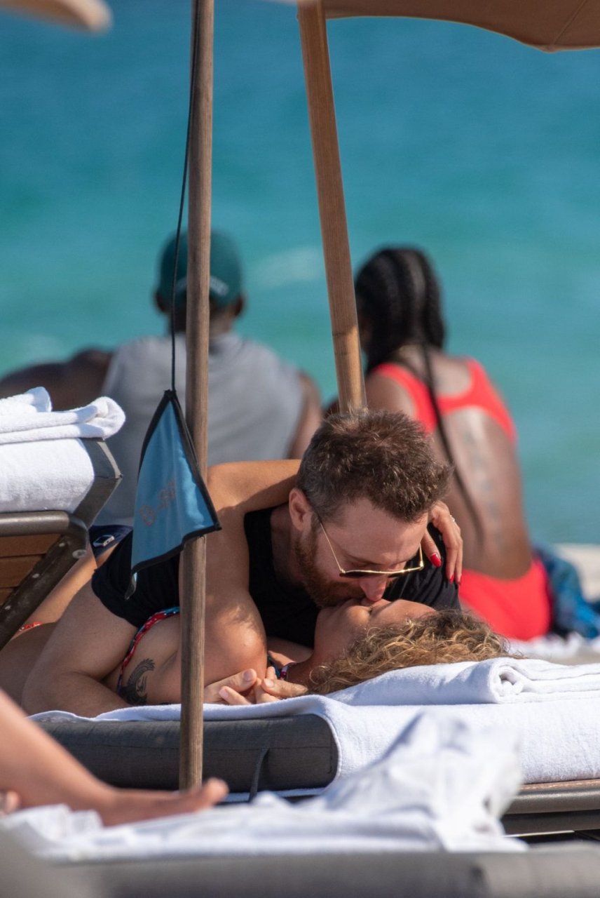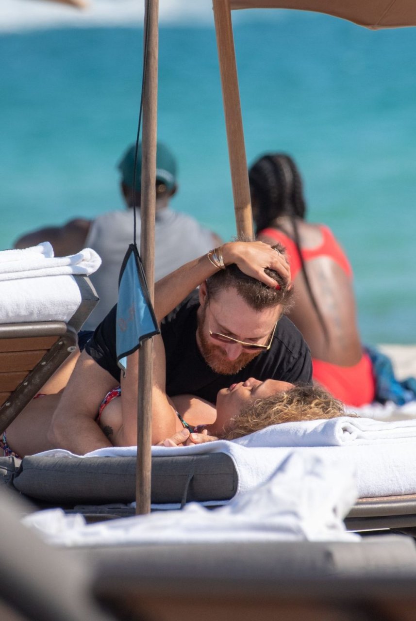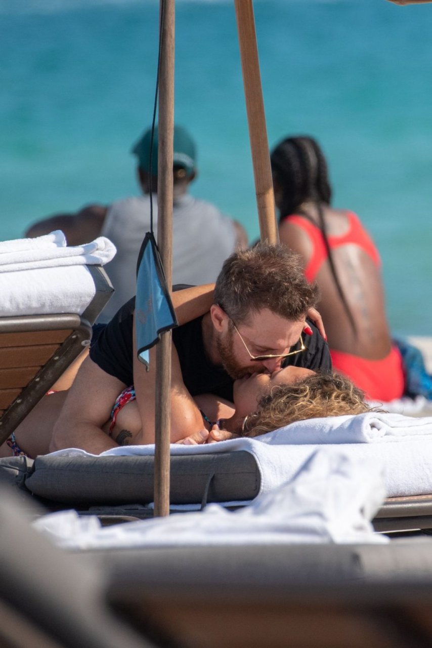 Dj David Guetta и его девушка Джессика Ледон страстно целуются на пляже в Майами-Бич, 12.03.2019. Джесс продемонстрировала свои изгибы, играя с собакой.