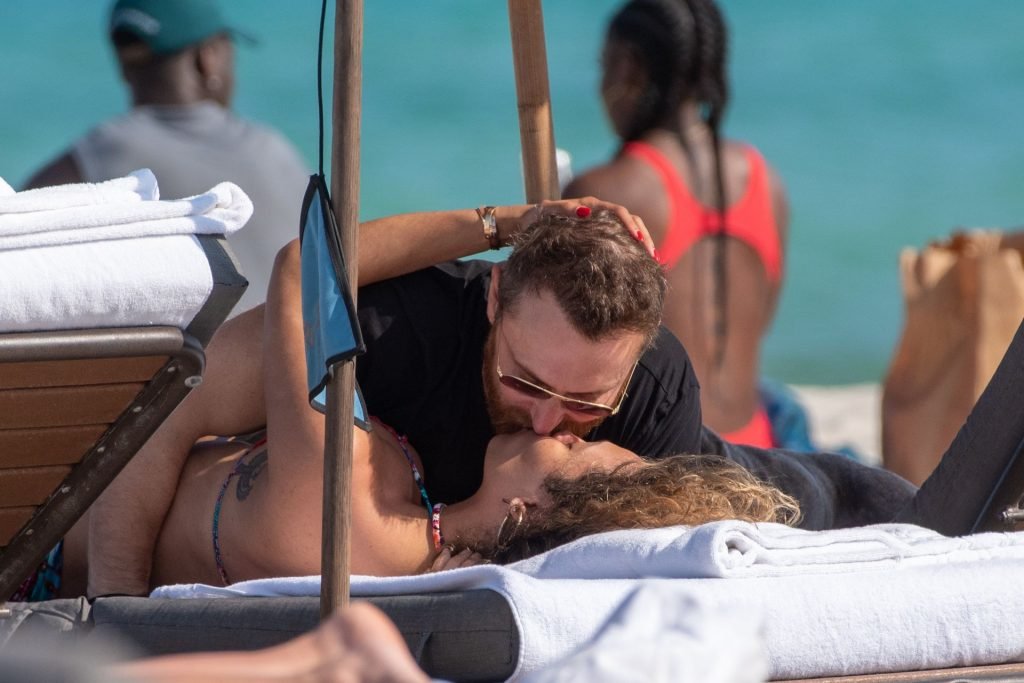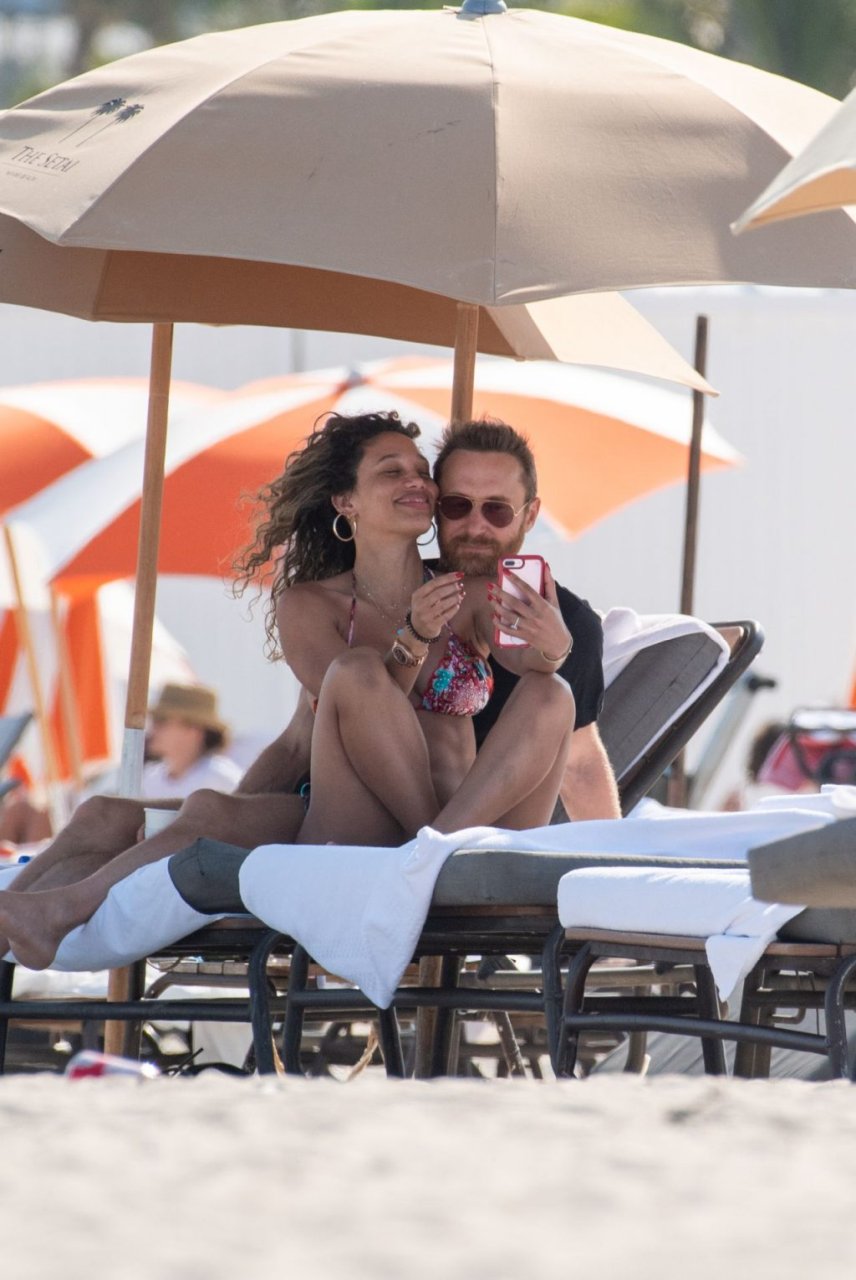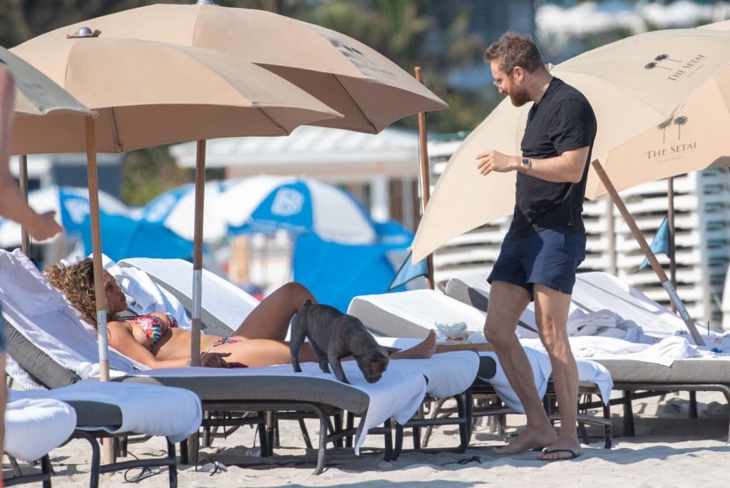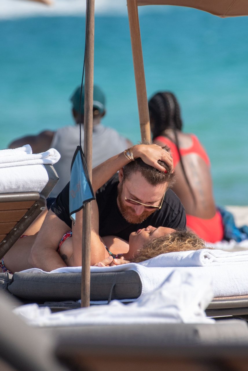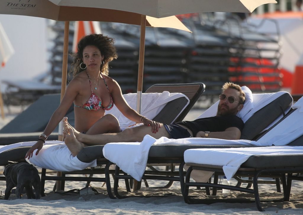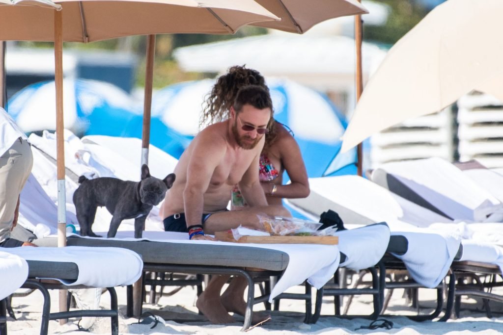 Dj David Guetta и его девушка Джессика Ледон страстно целуются на пляже в Майами-Бич, 12.03.2019. Джесс продемонстрировала свои изгибы, играя с собакой.