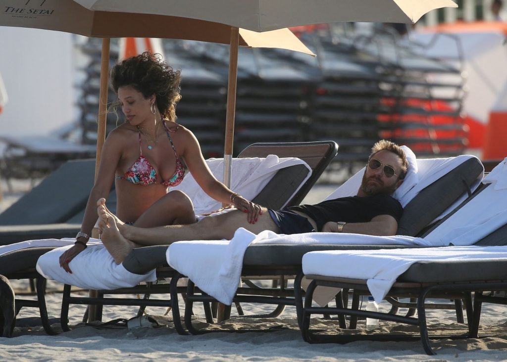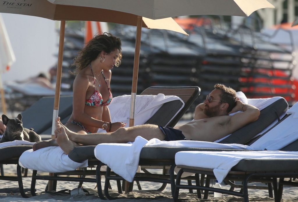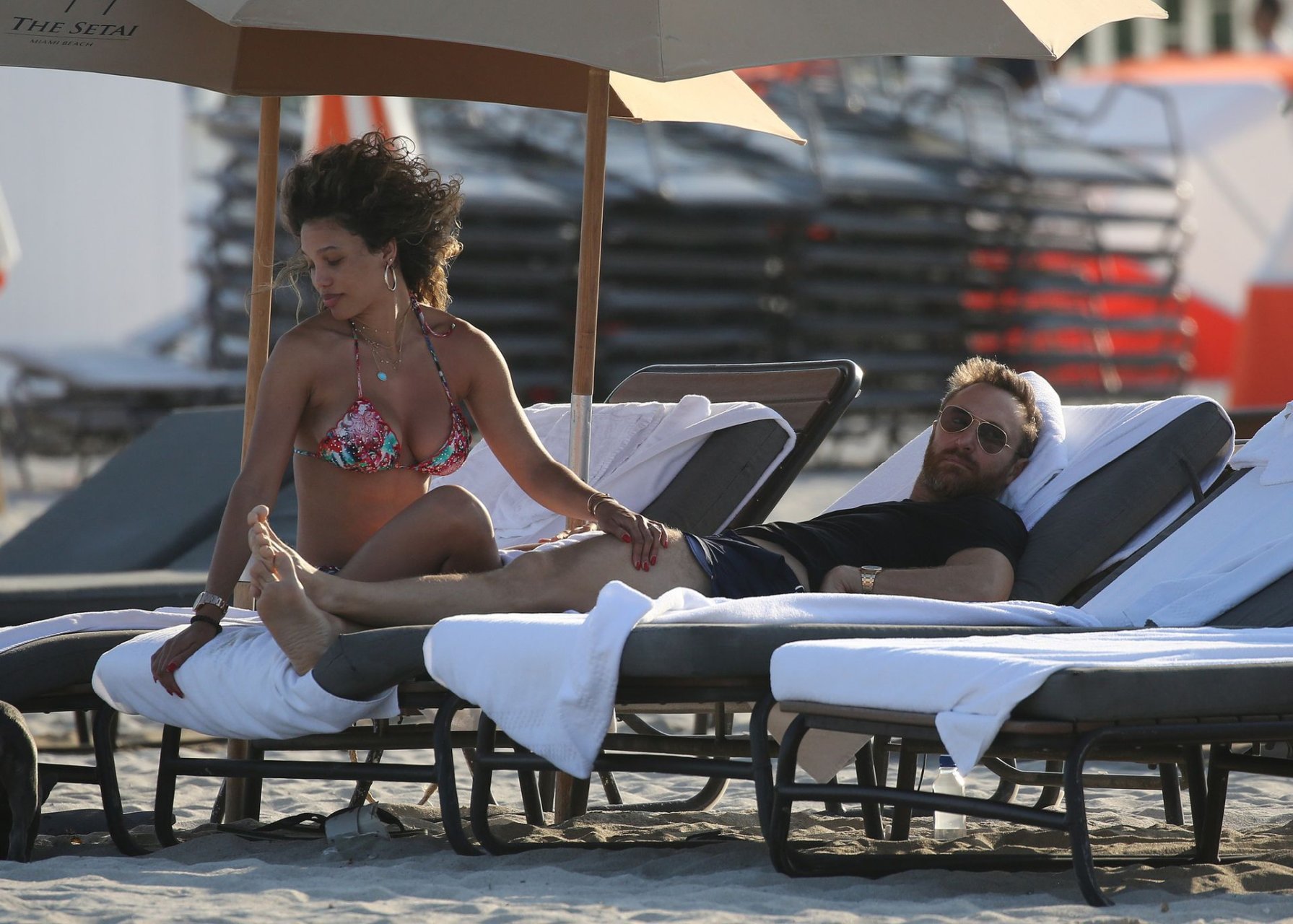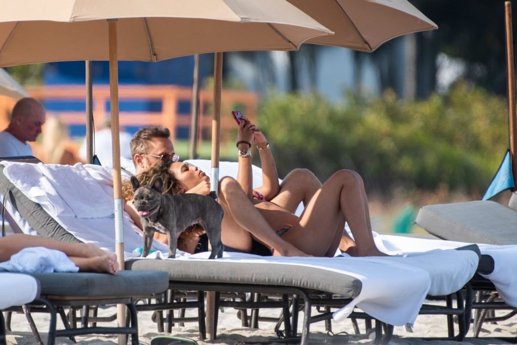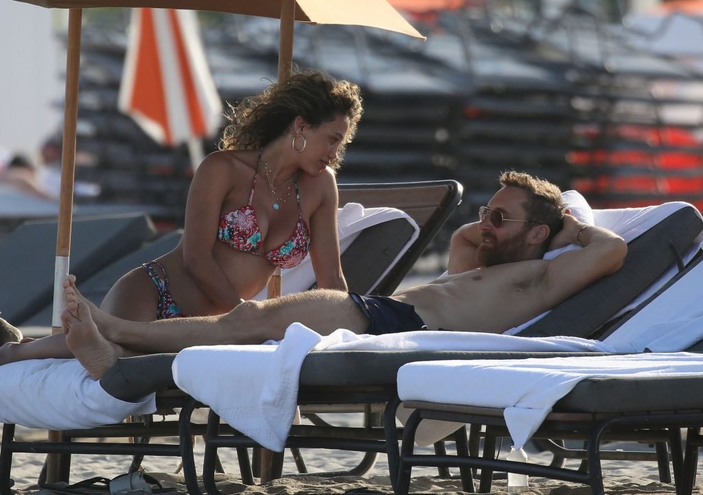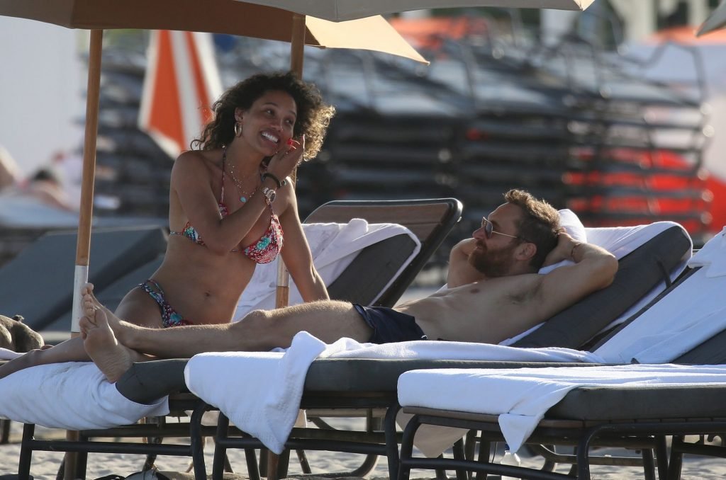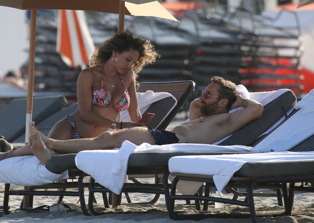 Dj David Guetta и его девушка Джессика Ледон страстно целуются на пляже в Майами-Бич, 12.03.2019. Джесс продемонстрировала свои изгибы, играя с собакой.