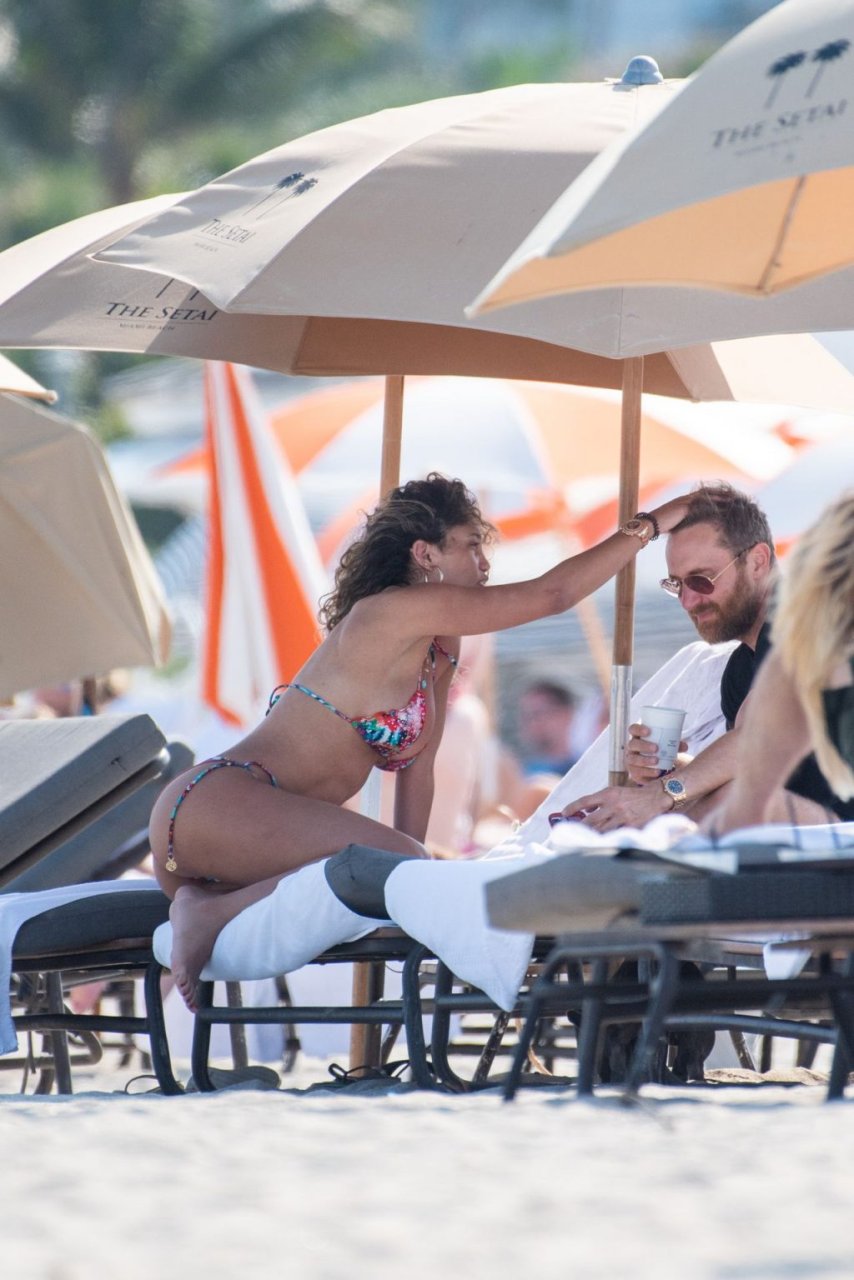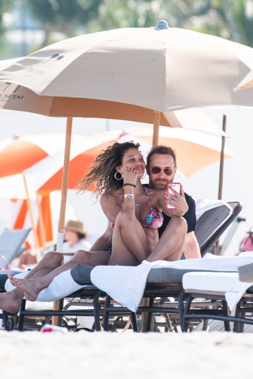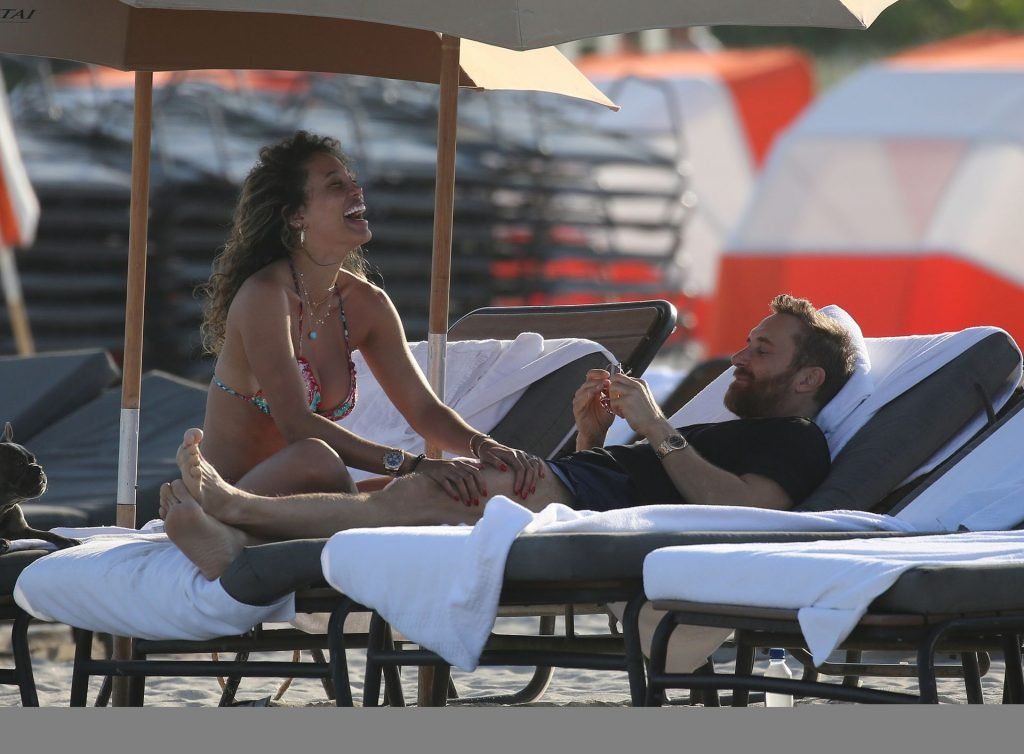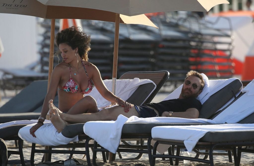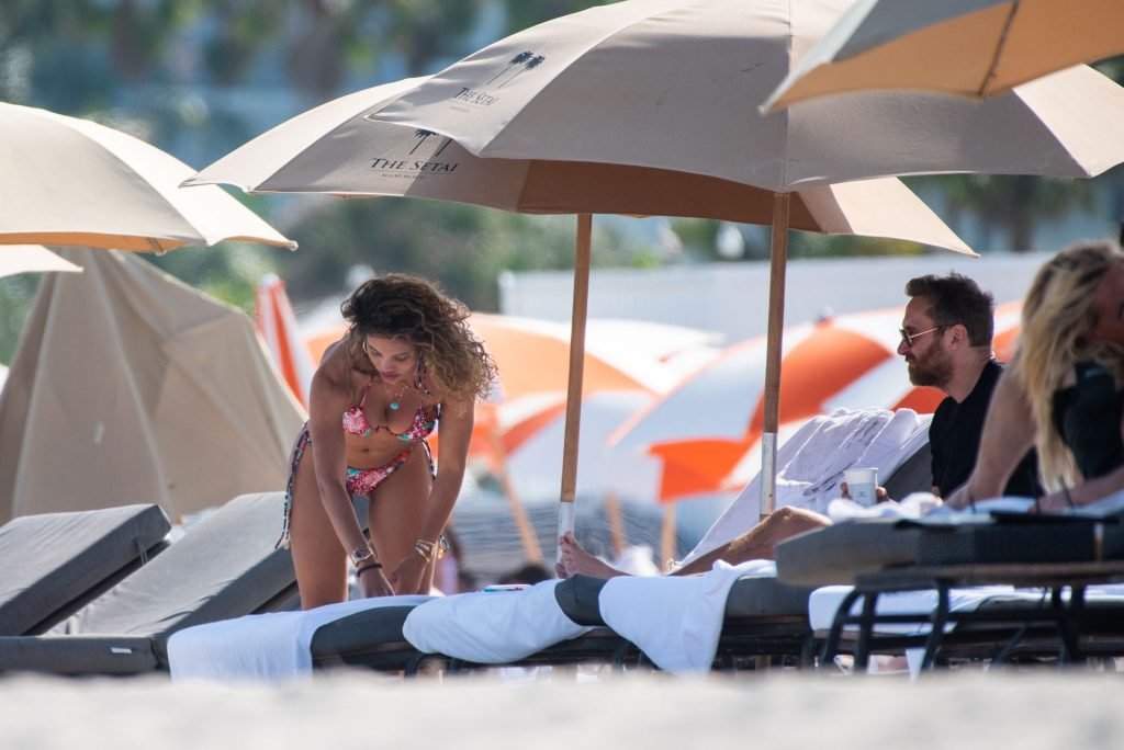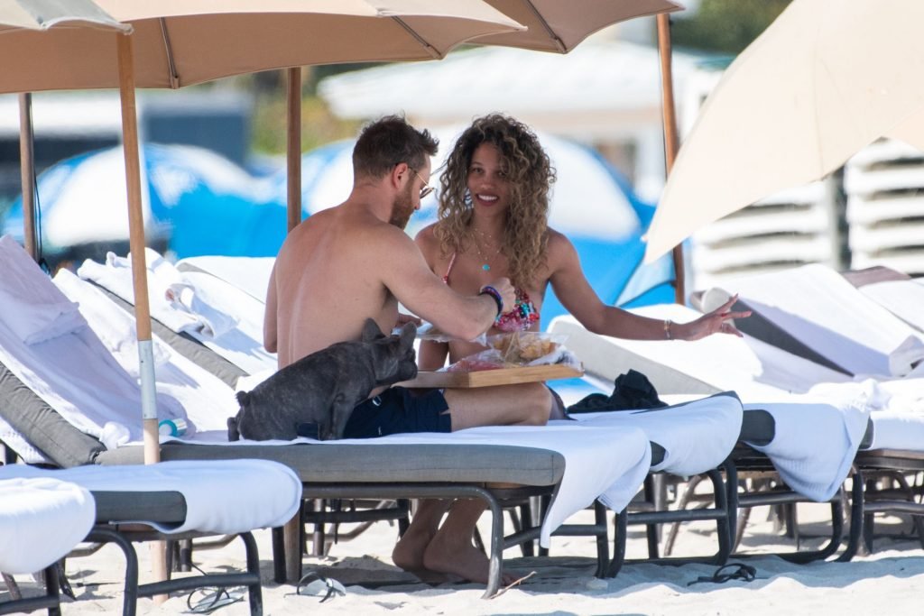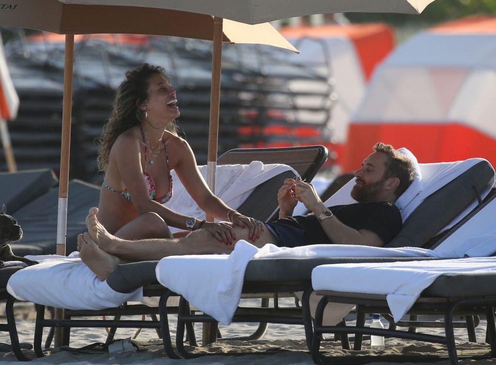 Dj David Guetta и его девушка Джессика Ледон страстно целуются на пляже в Майами-Бич, 12.03.2019. Джесс продемонстрировала свои изгибы, играя с собакой.