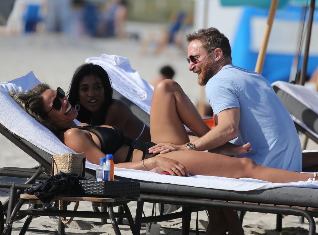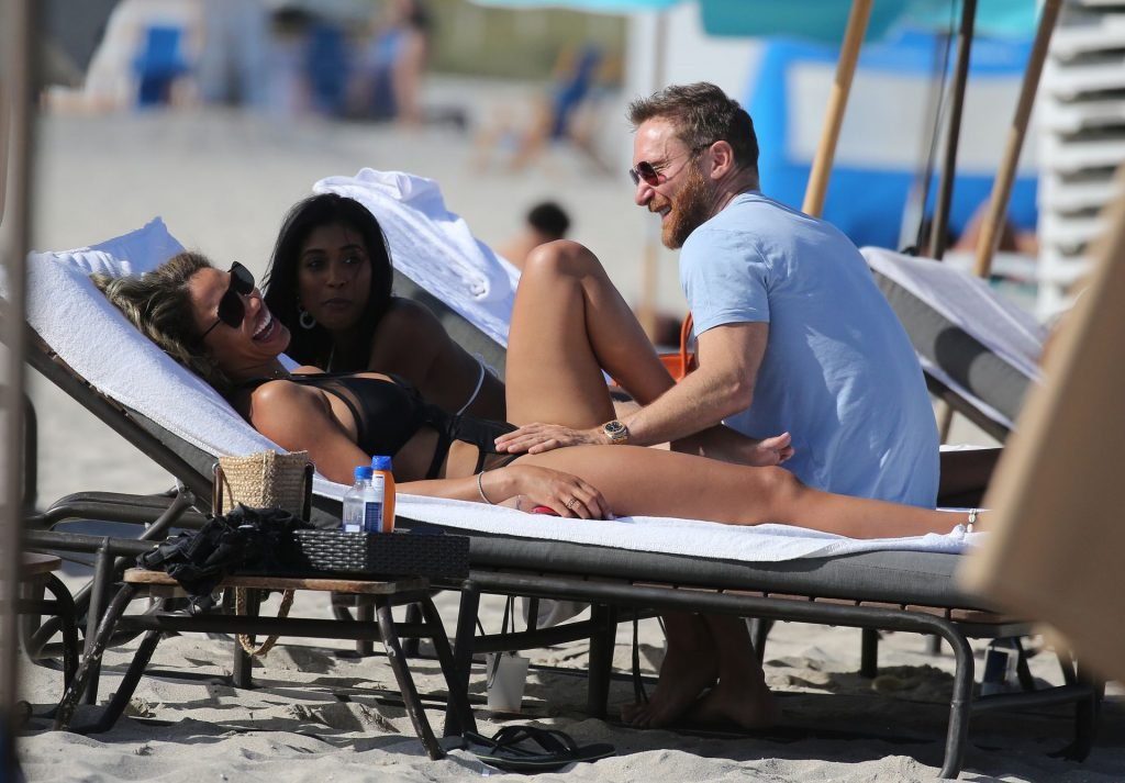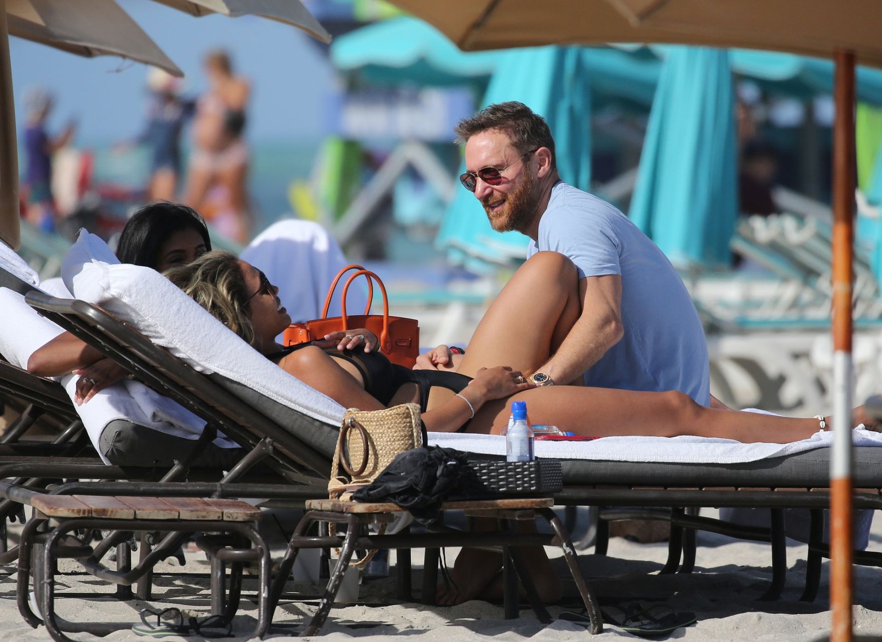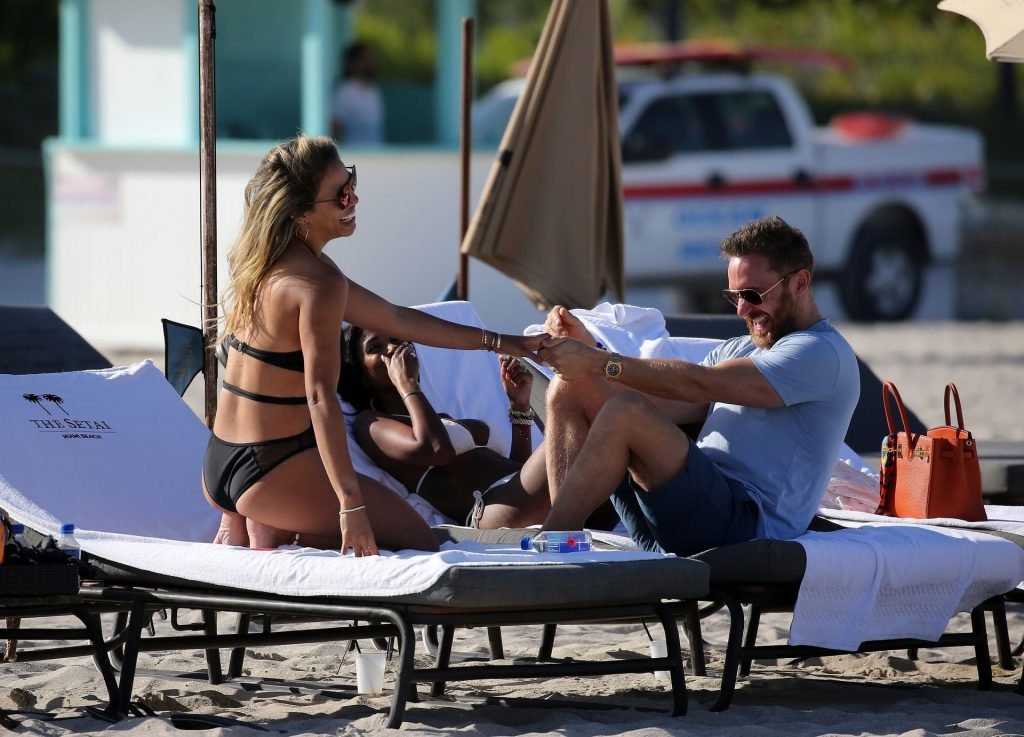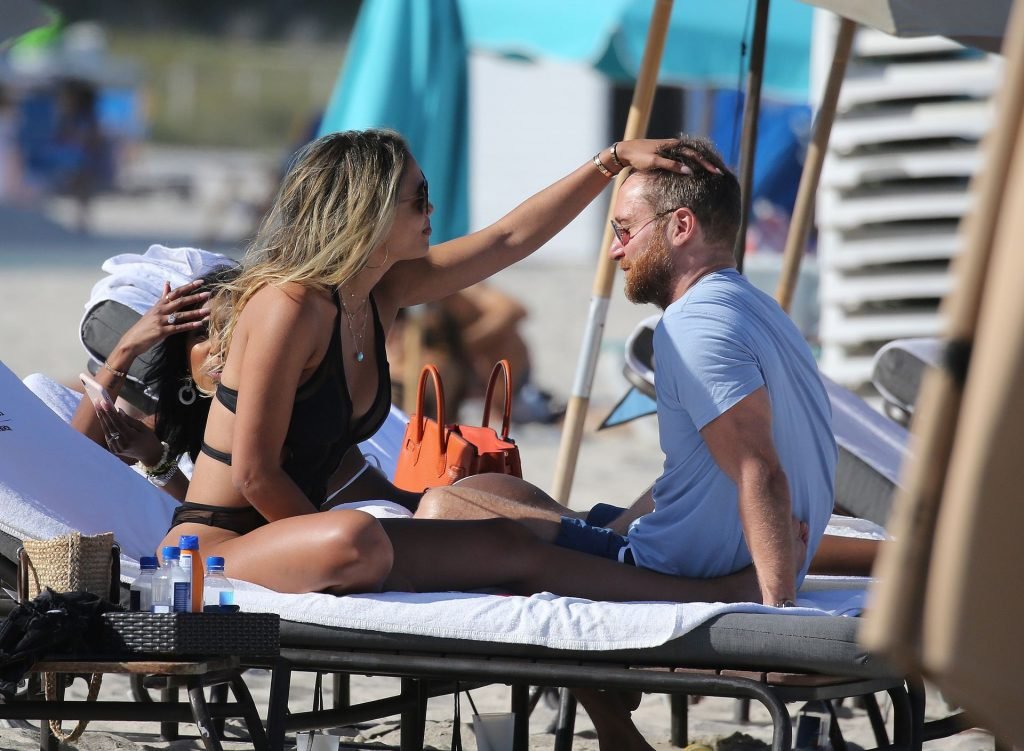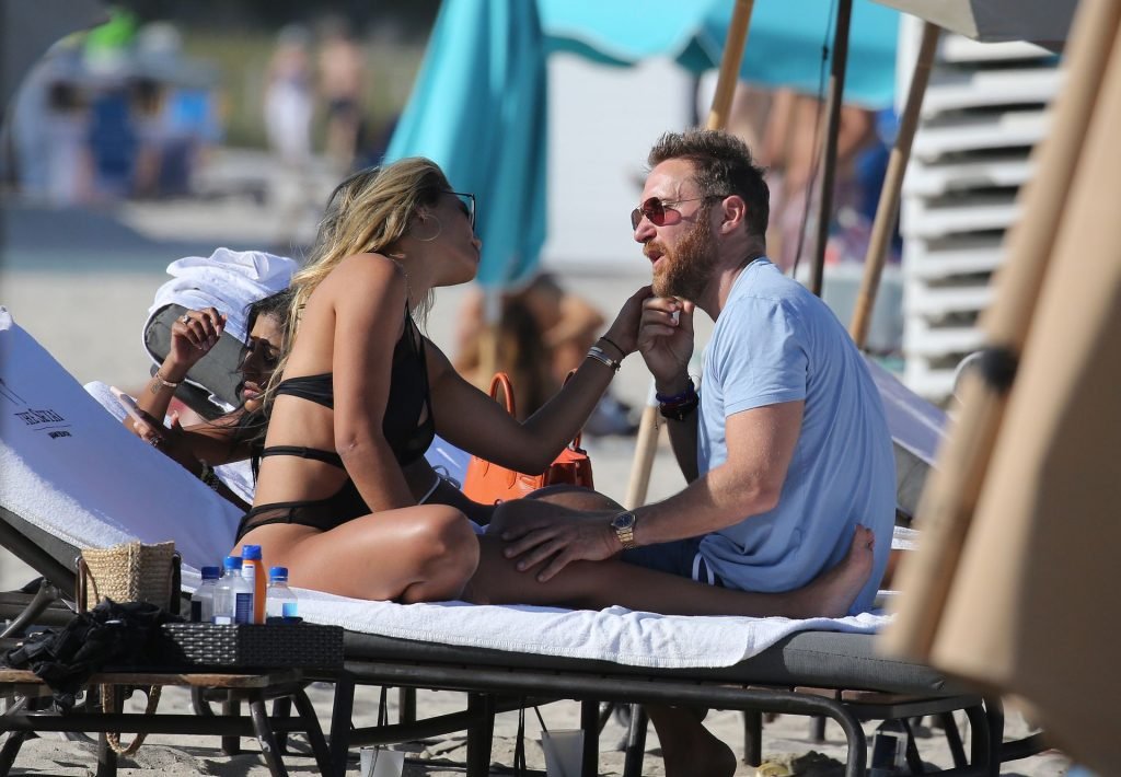 Всемирно известный диджей Дэвид Гетта не может оторвать руки от своей девушки Джессики Ледон на пляже в Майами, 30.03.2019.