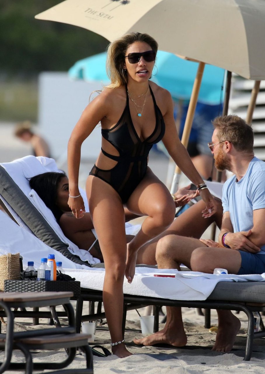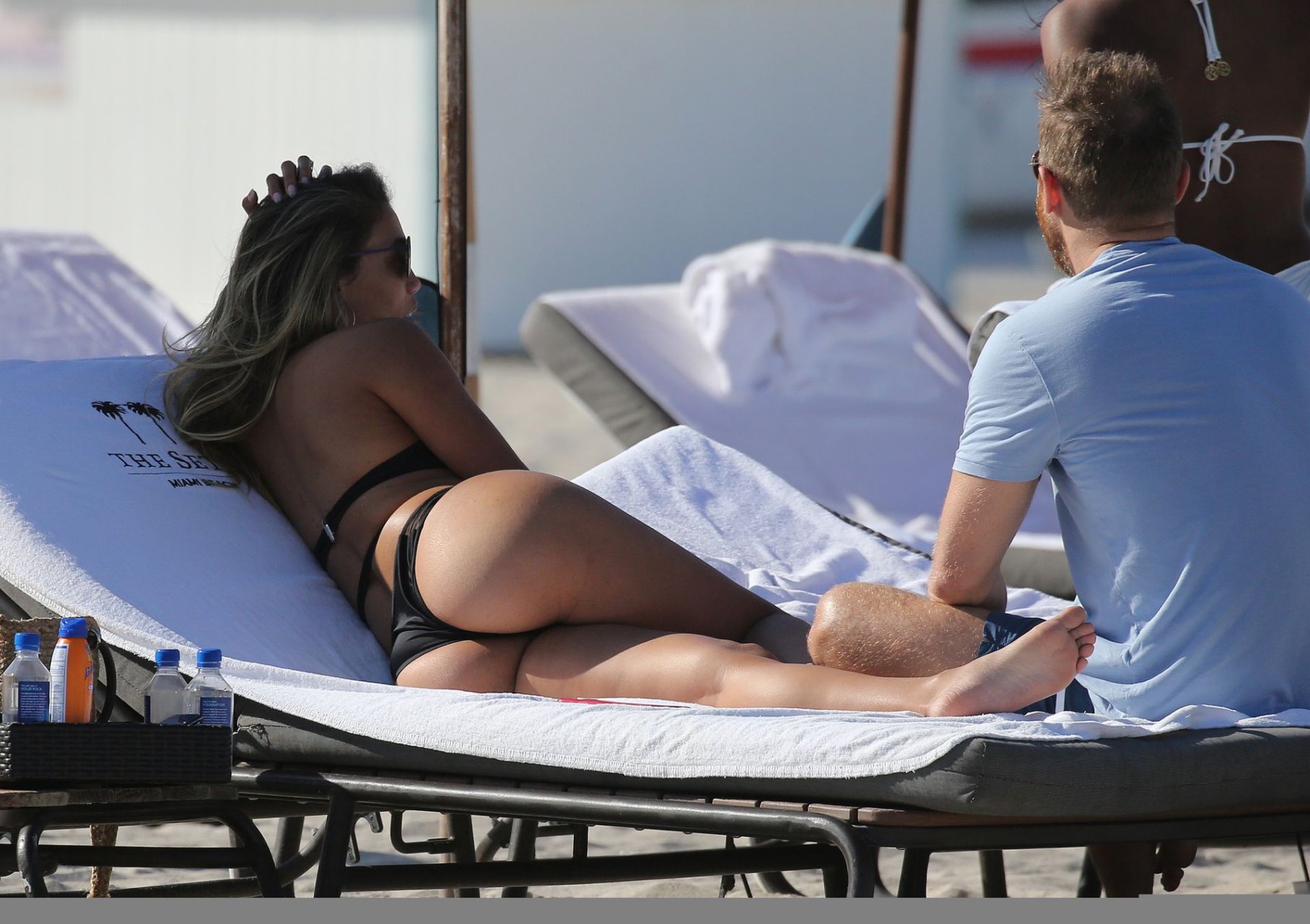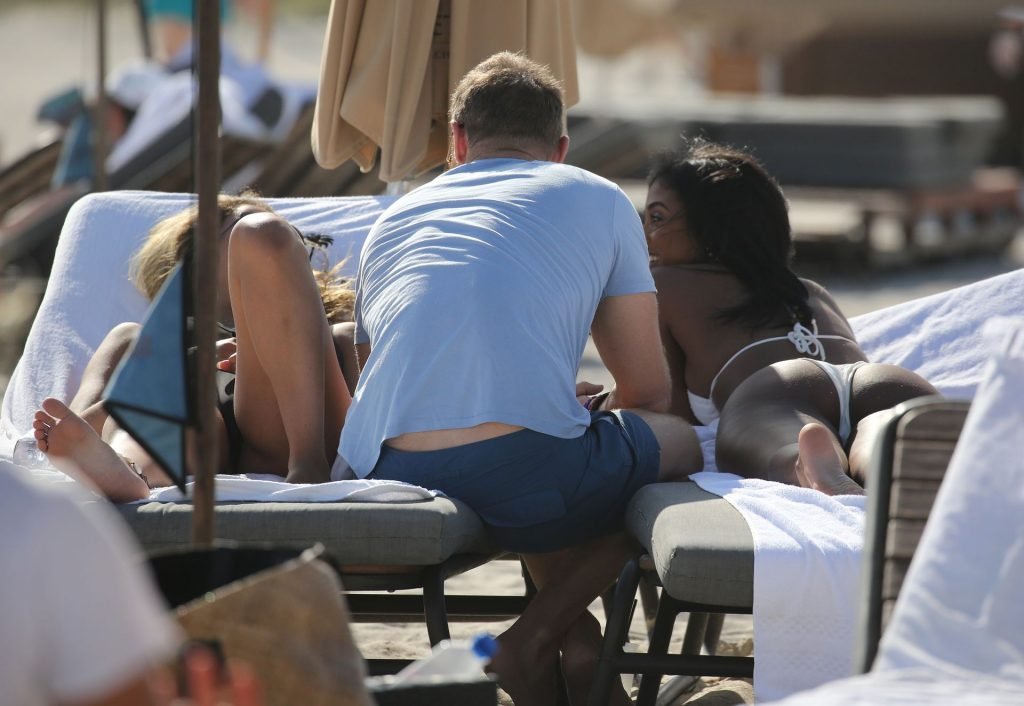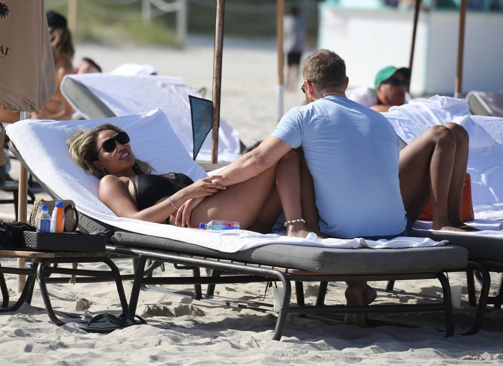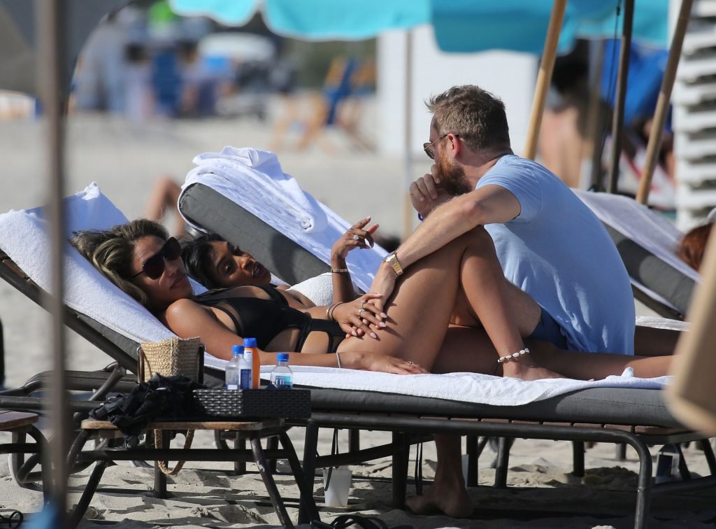 Всемирно известный диджей Дэвид Гетта не может оторвать руки от своей девушки Джессики Ледон на пляже в Майами, 30.03.2019.