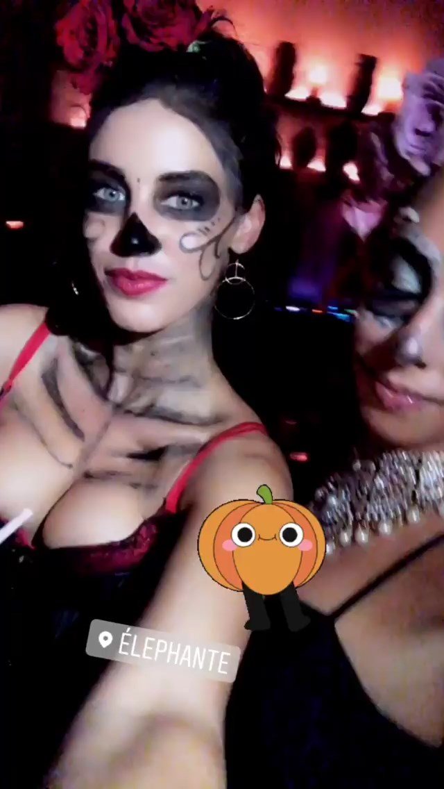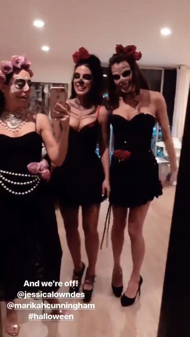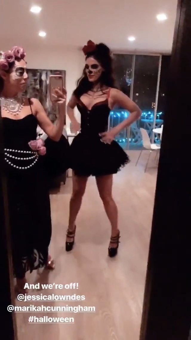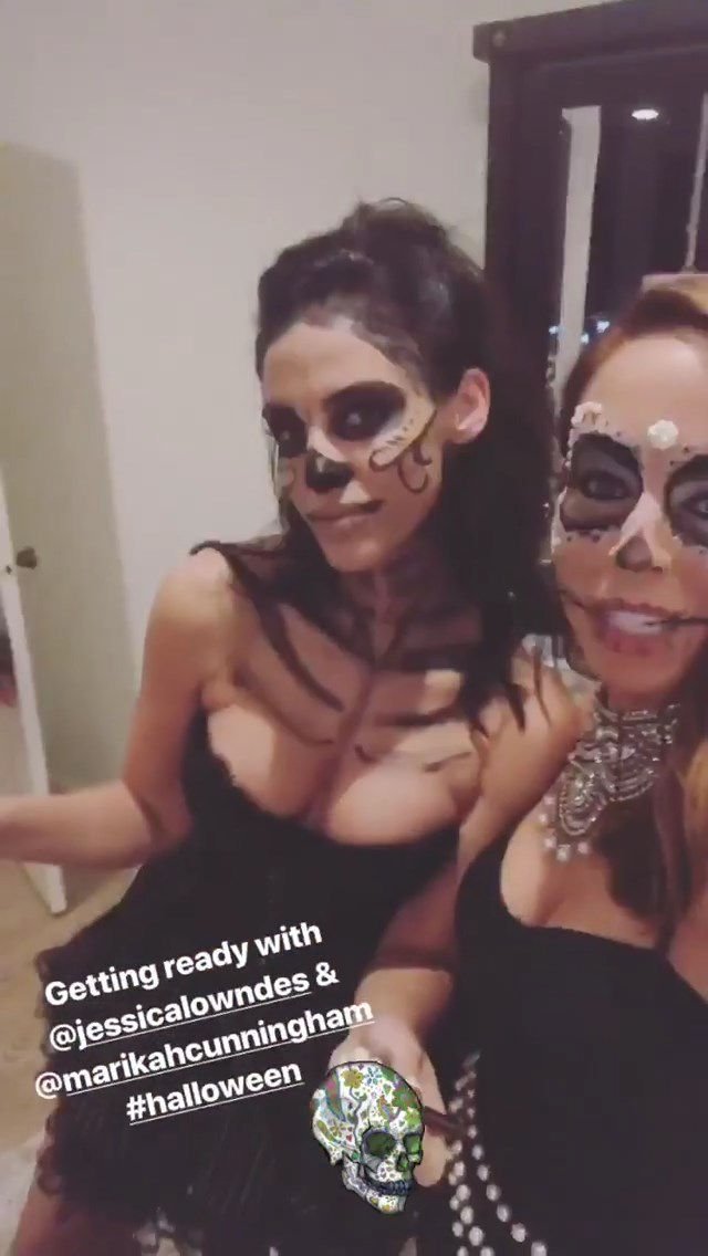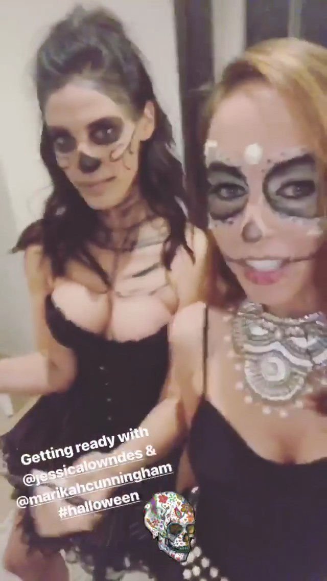 Актриса и певица Джессика Лоундс нарядилась в пышногрудого скелета вместе с друзьями на Хэллоуинскую вечеринку в Санта-Монике, 31.10.2018.