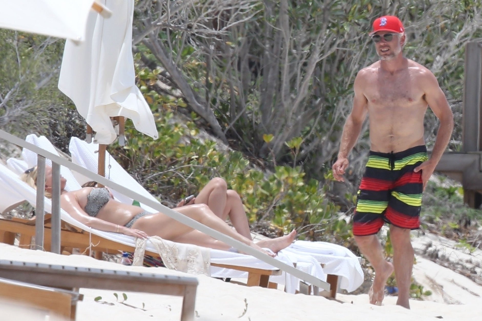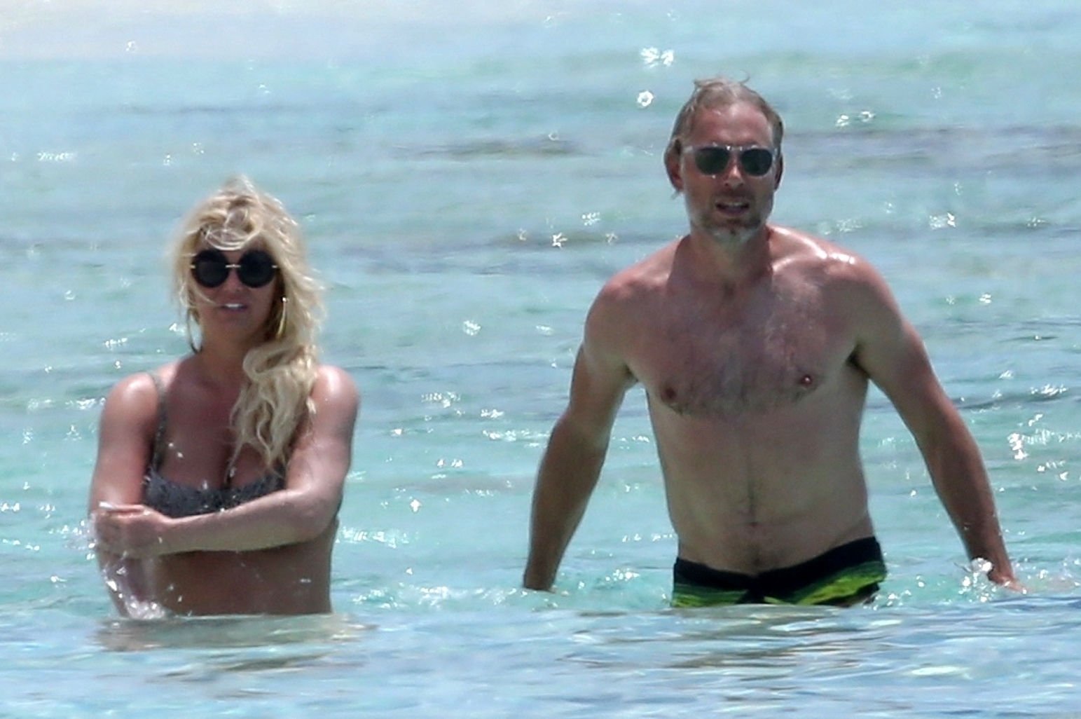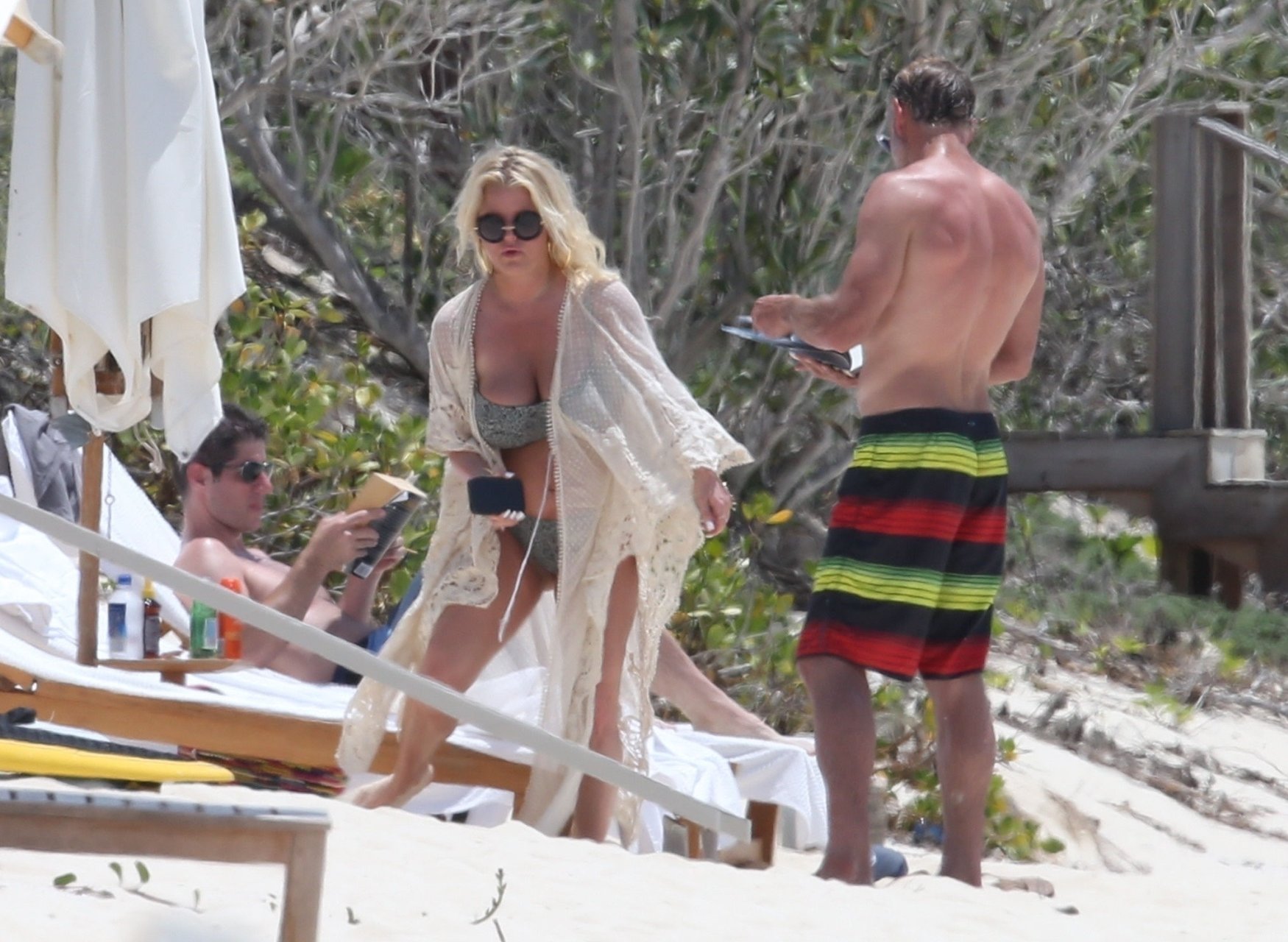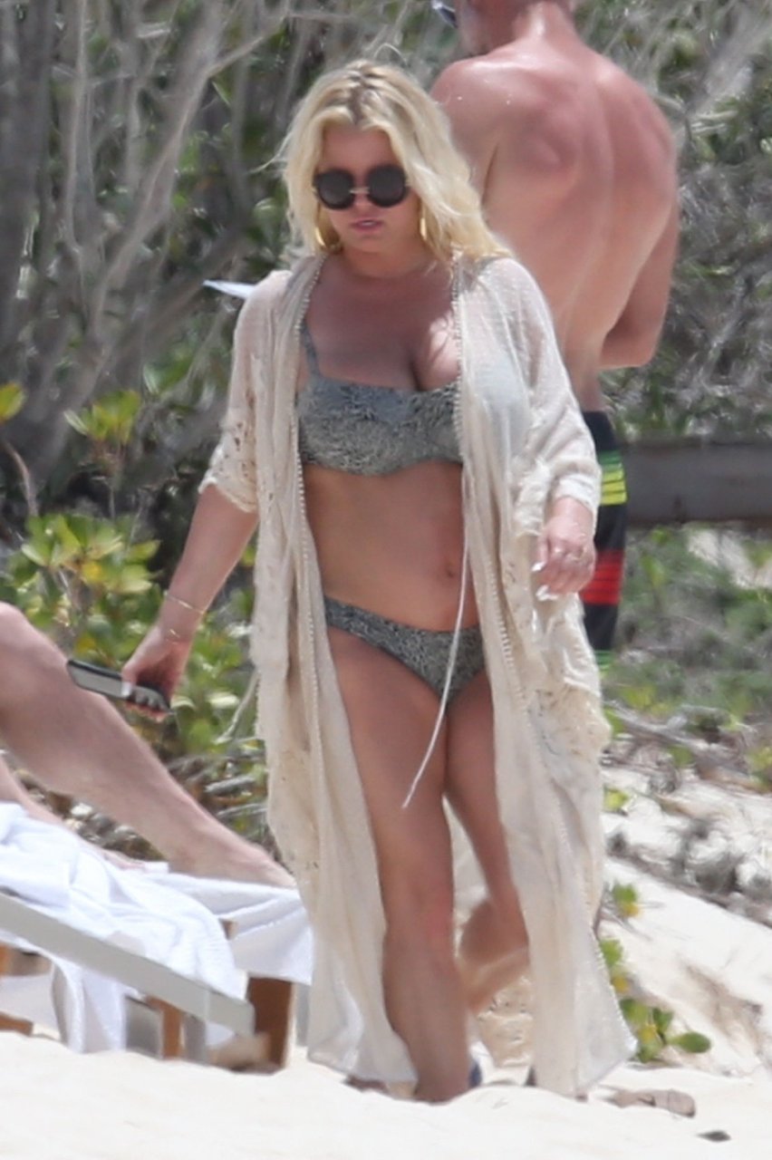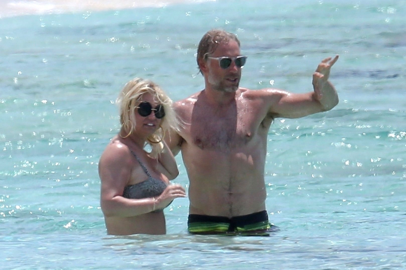Джессика Энн Симпсон и её муж Эрик Джонсон наслаждаются днем на пляже на Багамах со своим другом, 27.04.2018. 37-летняя Джессика загорает в леопардовом двухпредметном купальнике, в то время как Эрик демонстрирует свою подтянутую фигуру, занимаясь паддлбордингом.