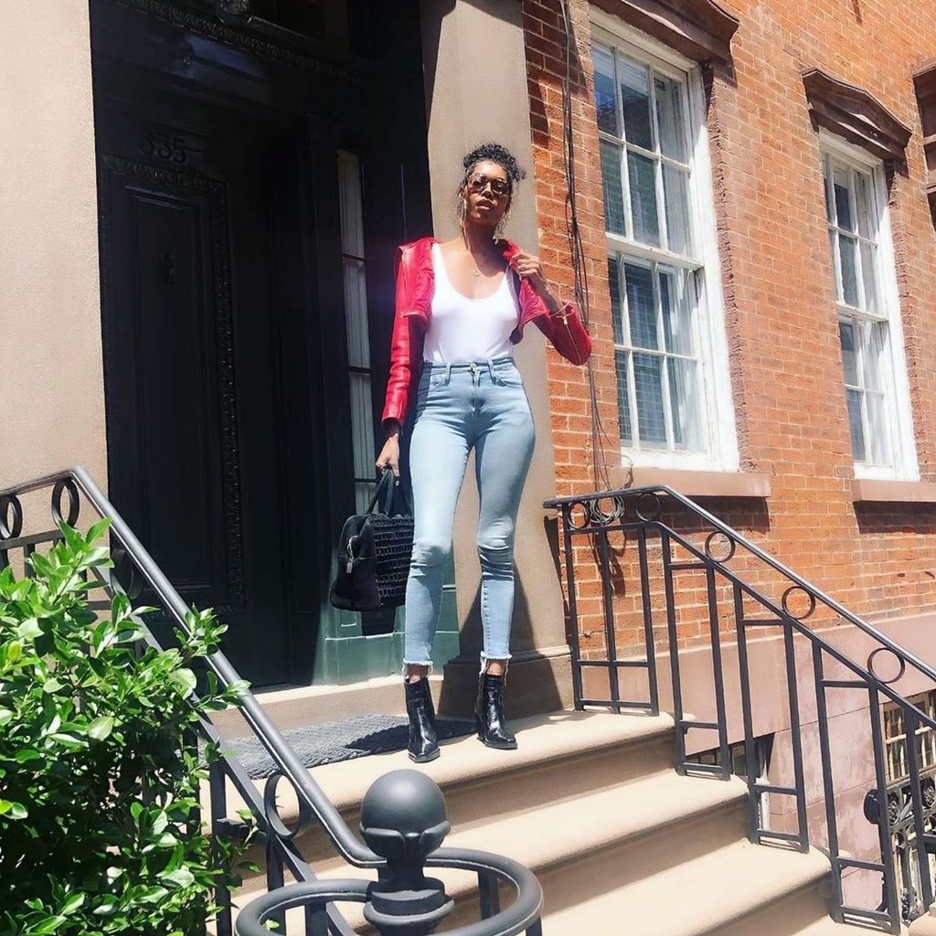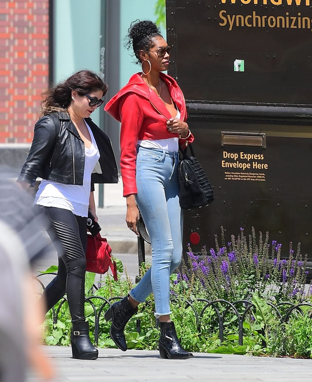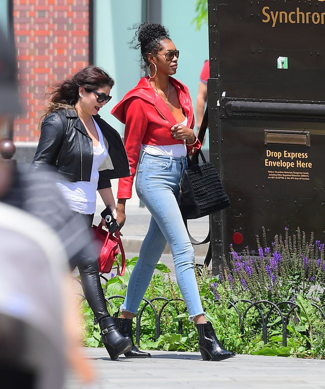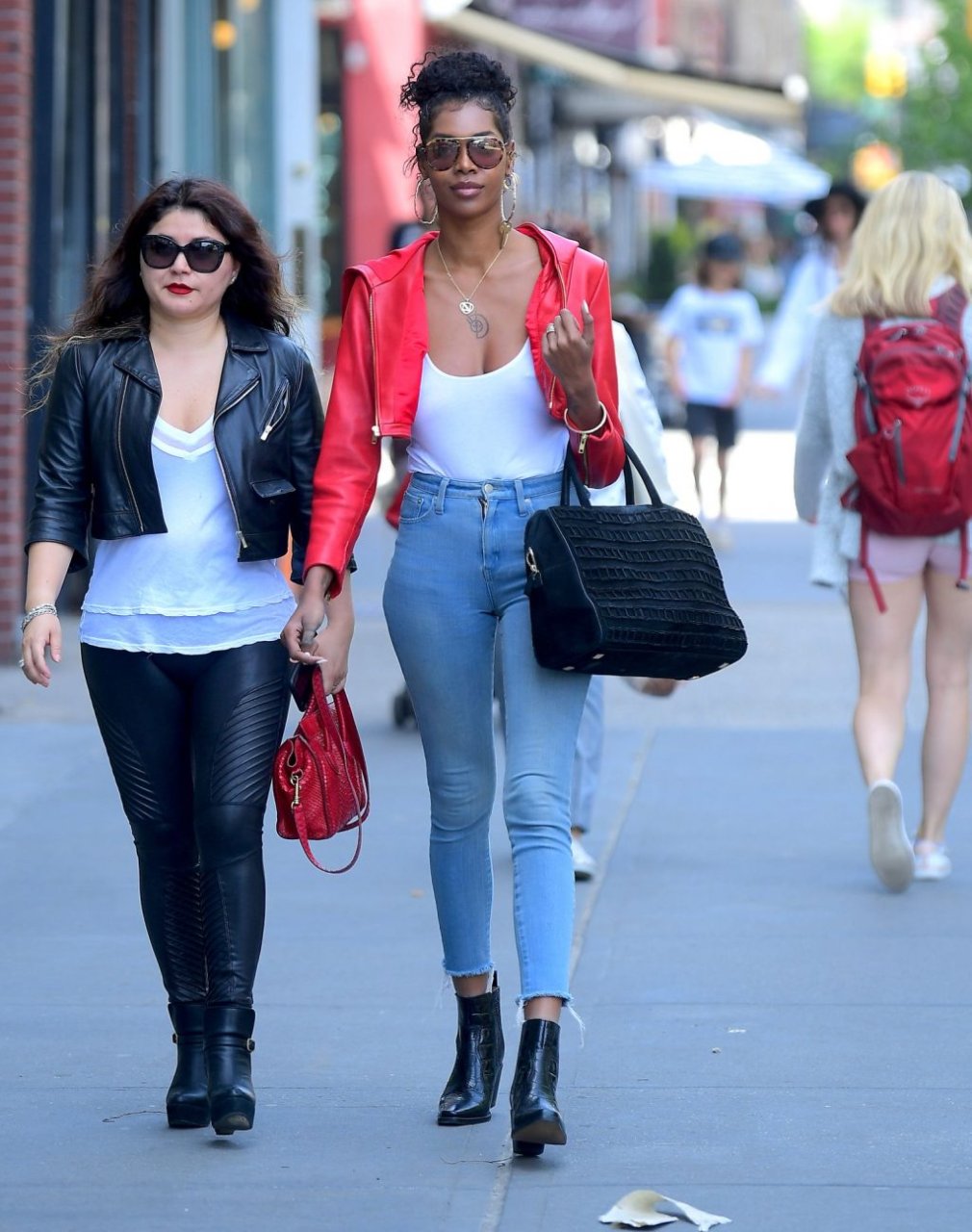 Модель Джессика Уайт демонстрирует свои пирсинги на сосках в белом топе, выходя на улицы Нью-Йорка, 04.06.2019.