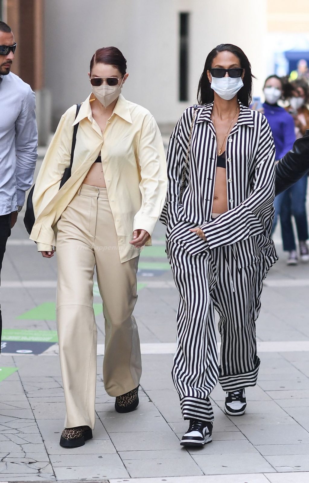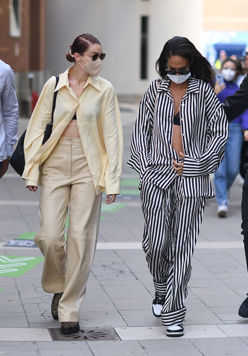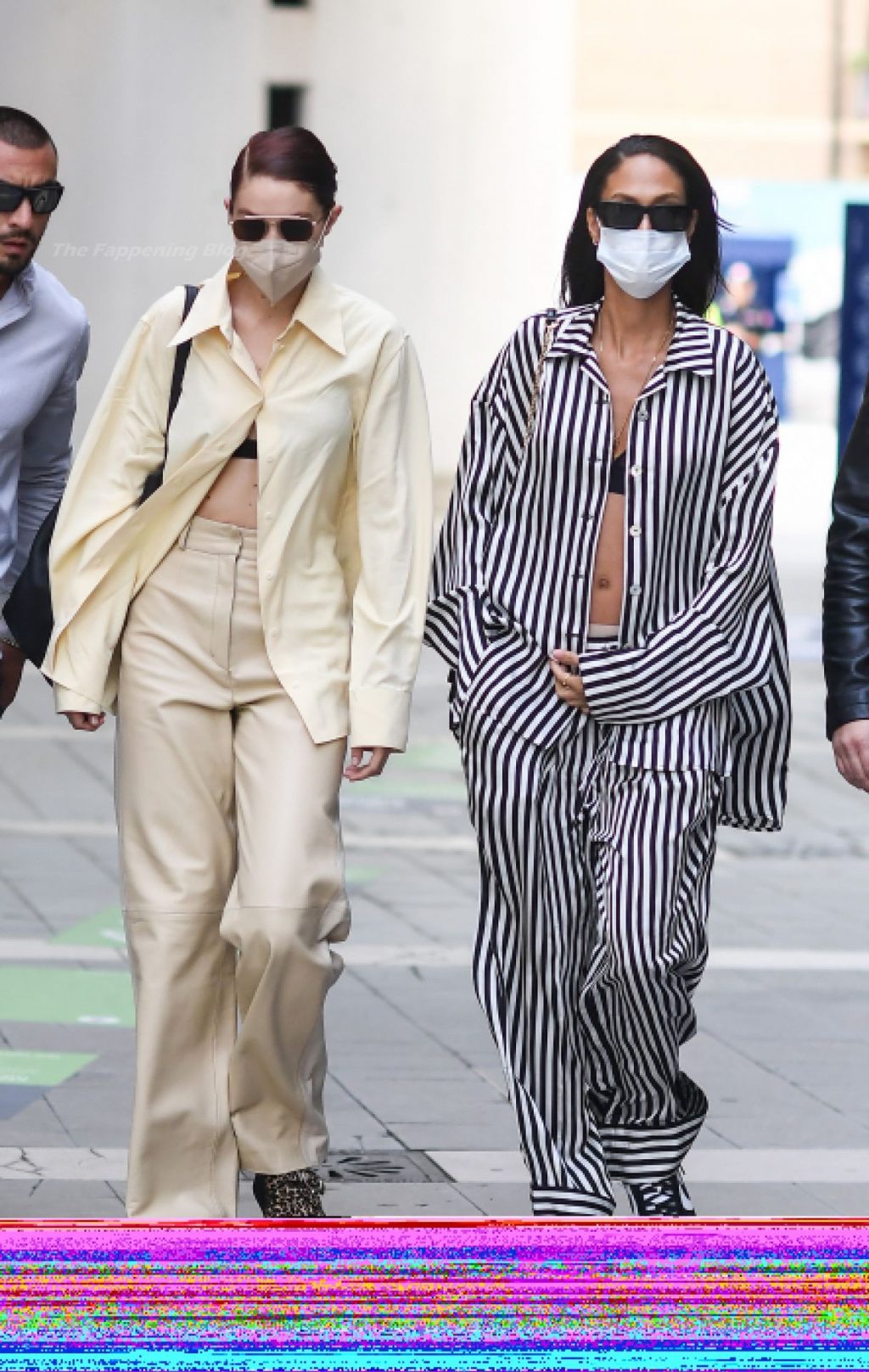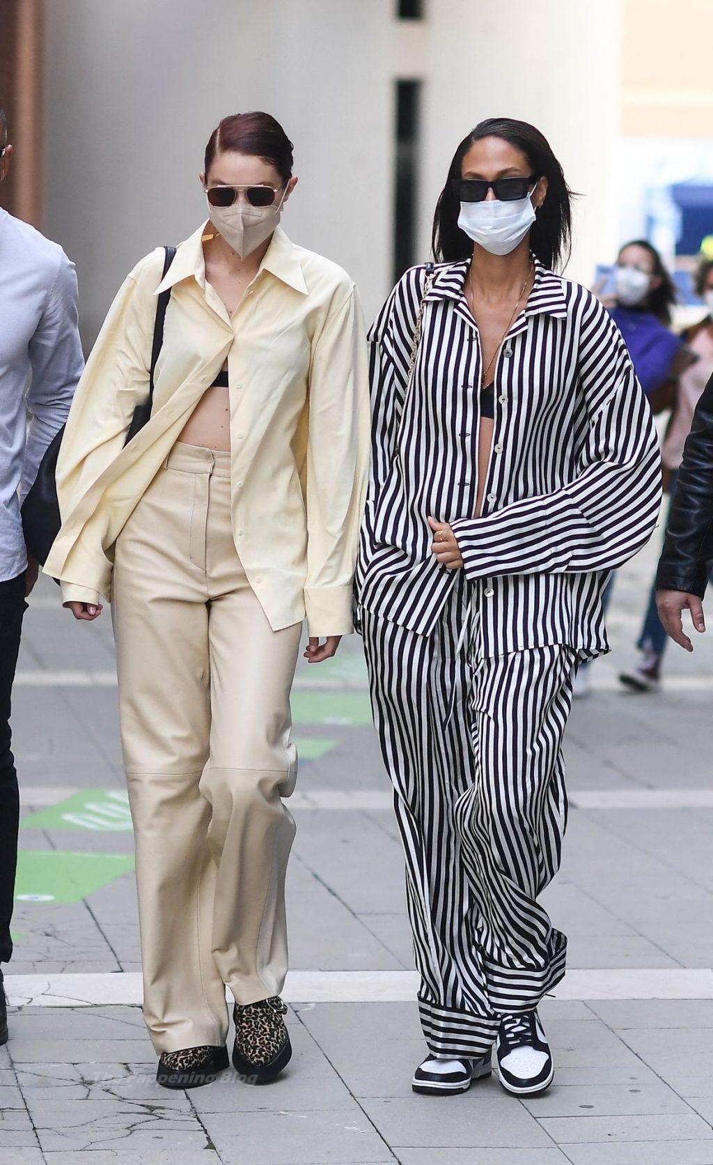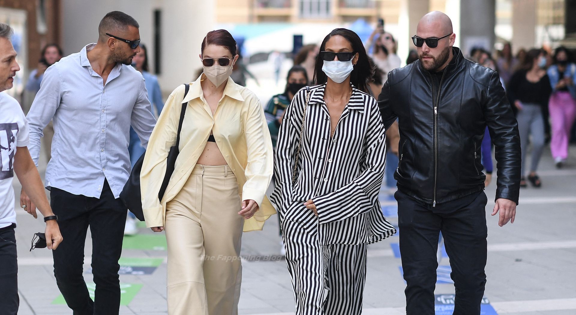 Gigi Hadid и Joan Smalls были замечены на Неделе моды в Милане, 23.09.2021. Джоан показывает сосок, надев прозрачный бюстгальтер.