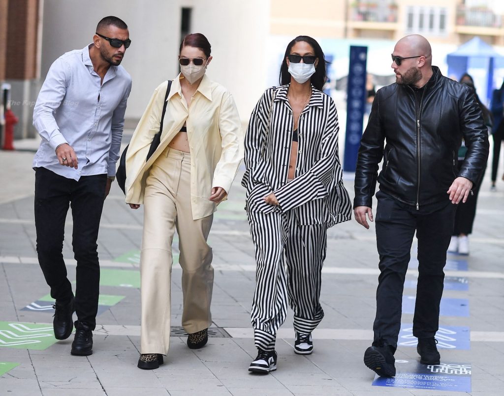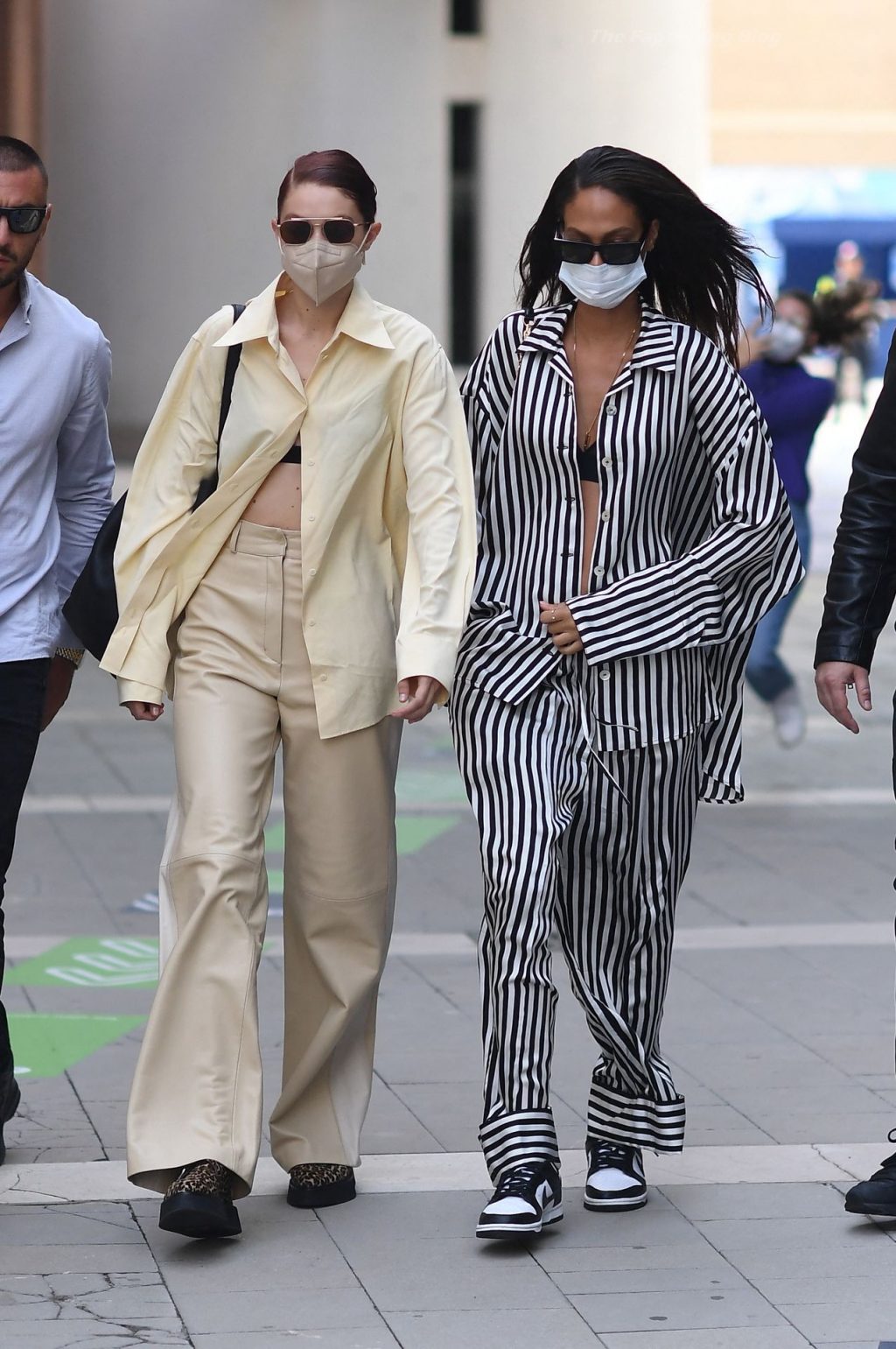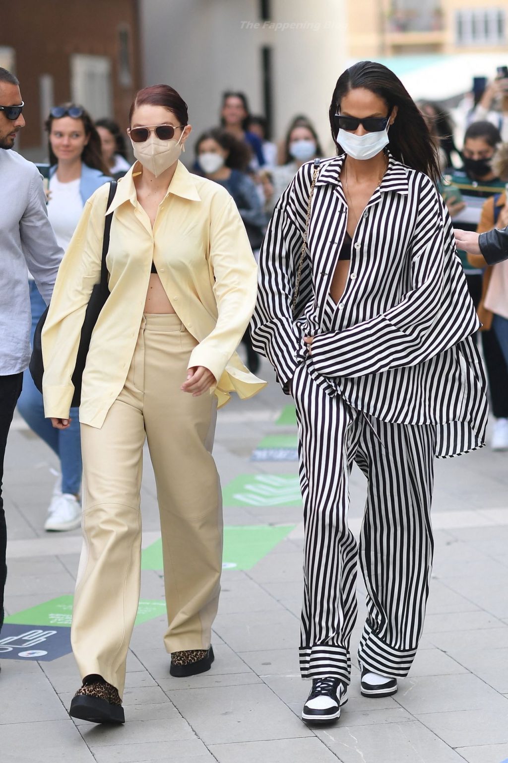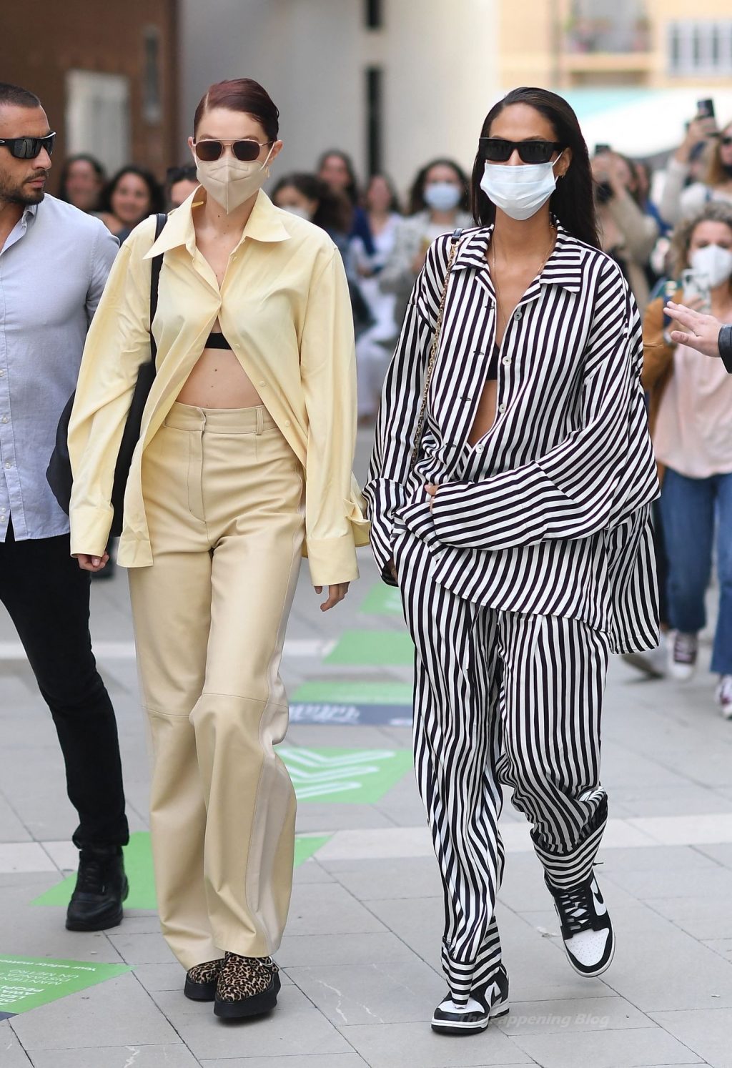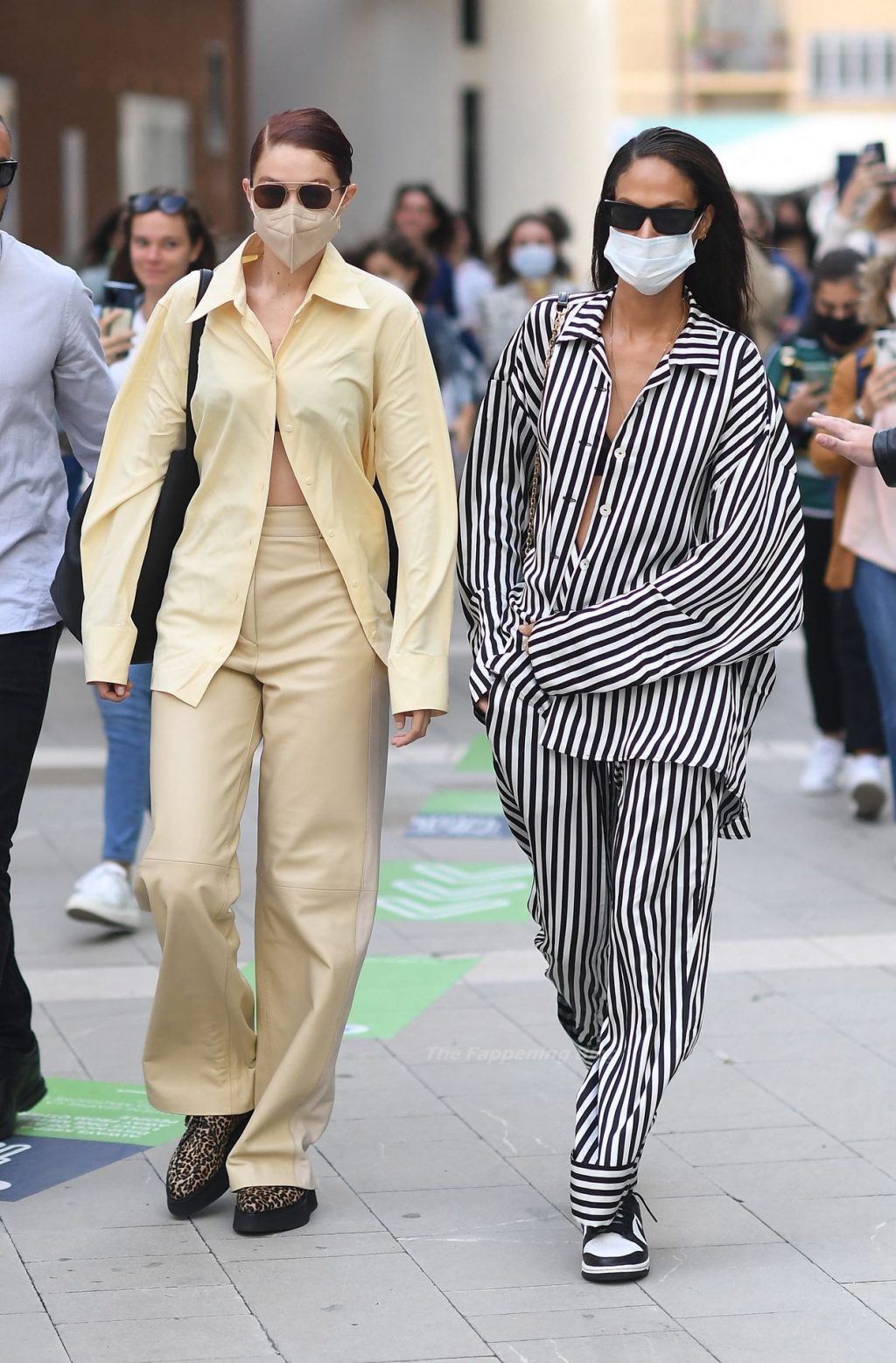 Gigi Hadid и Joan Smalls были замечены на Неделе моды в Милане, 23.09.2021. Джоан показывает сосок, надев прозрачный бюстгальтер.