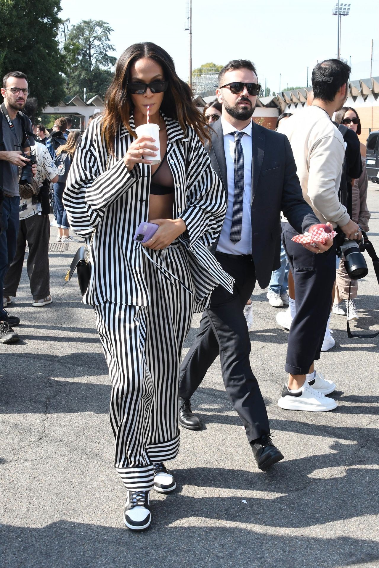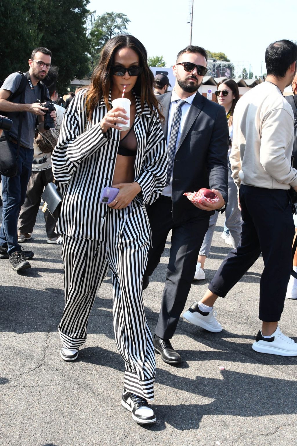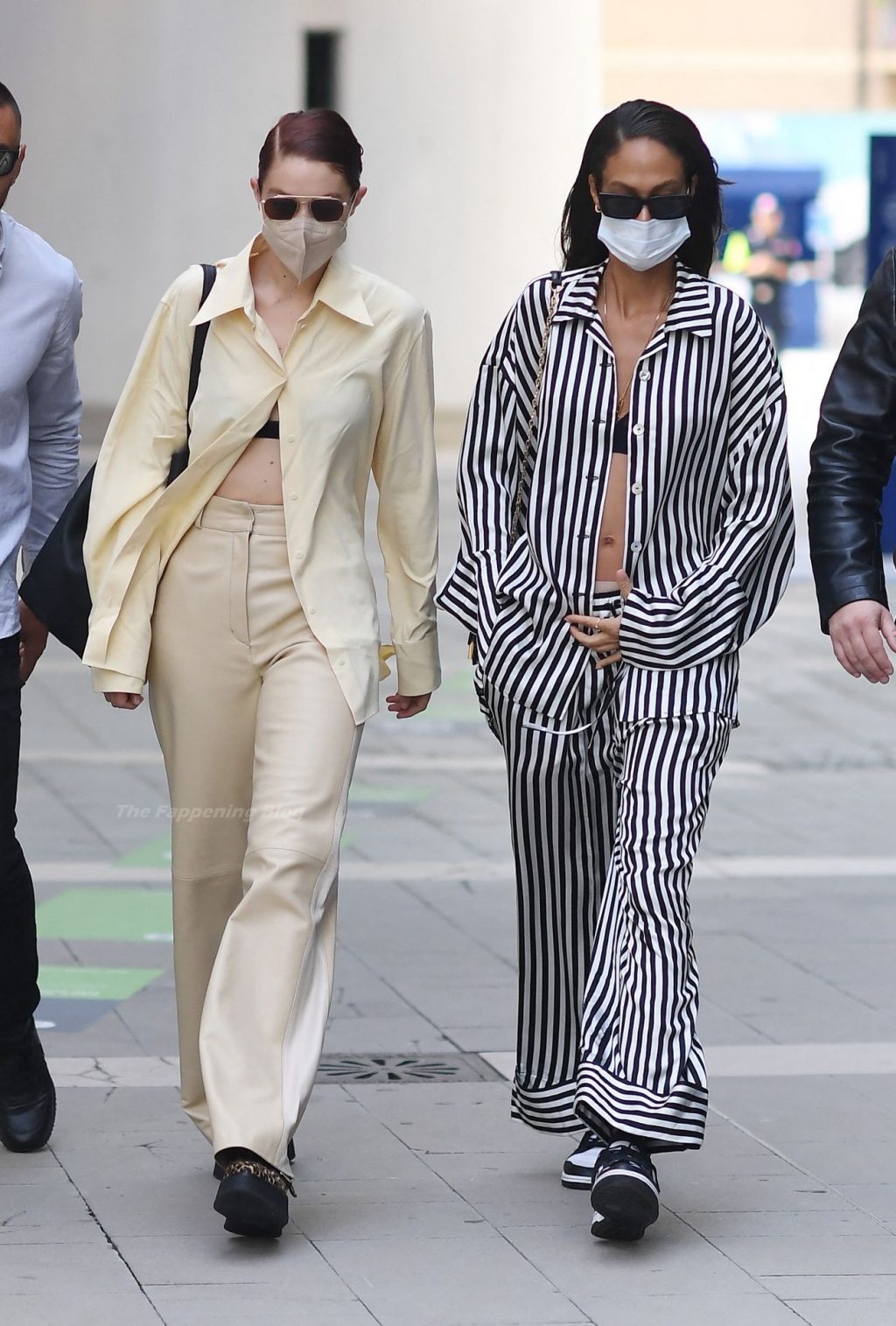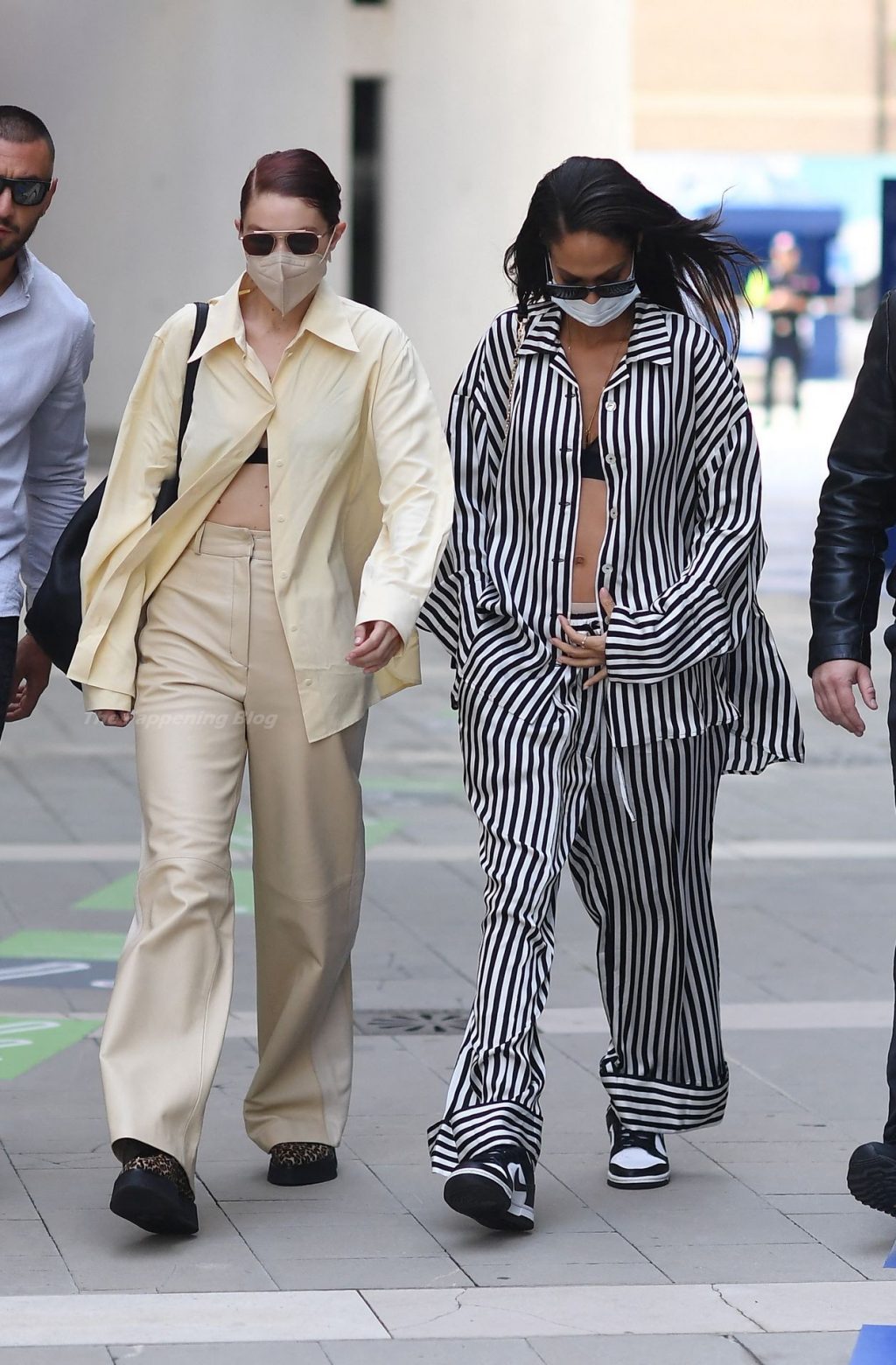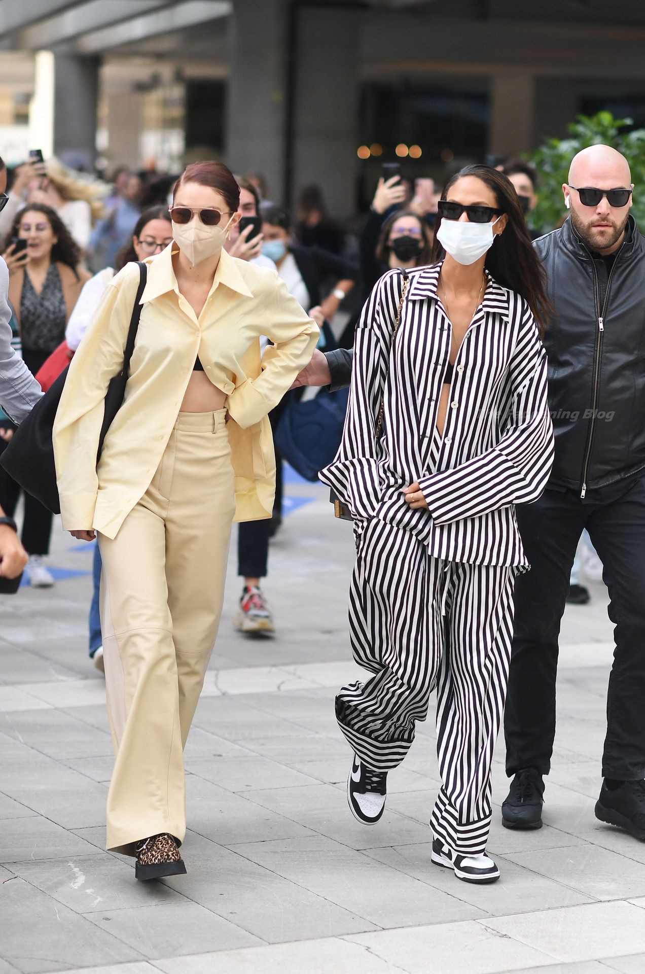Gigi Hadid и Joan Smalls были замечены на Неделе моды в Милане, 23.09.2021. Джоан показывает сосок, надев прозрачный бюстгальтер.