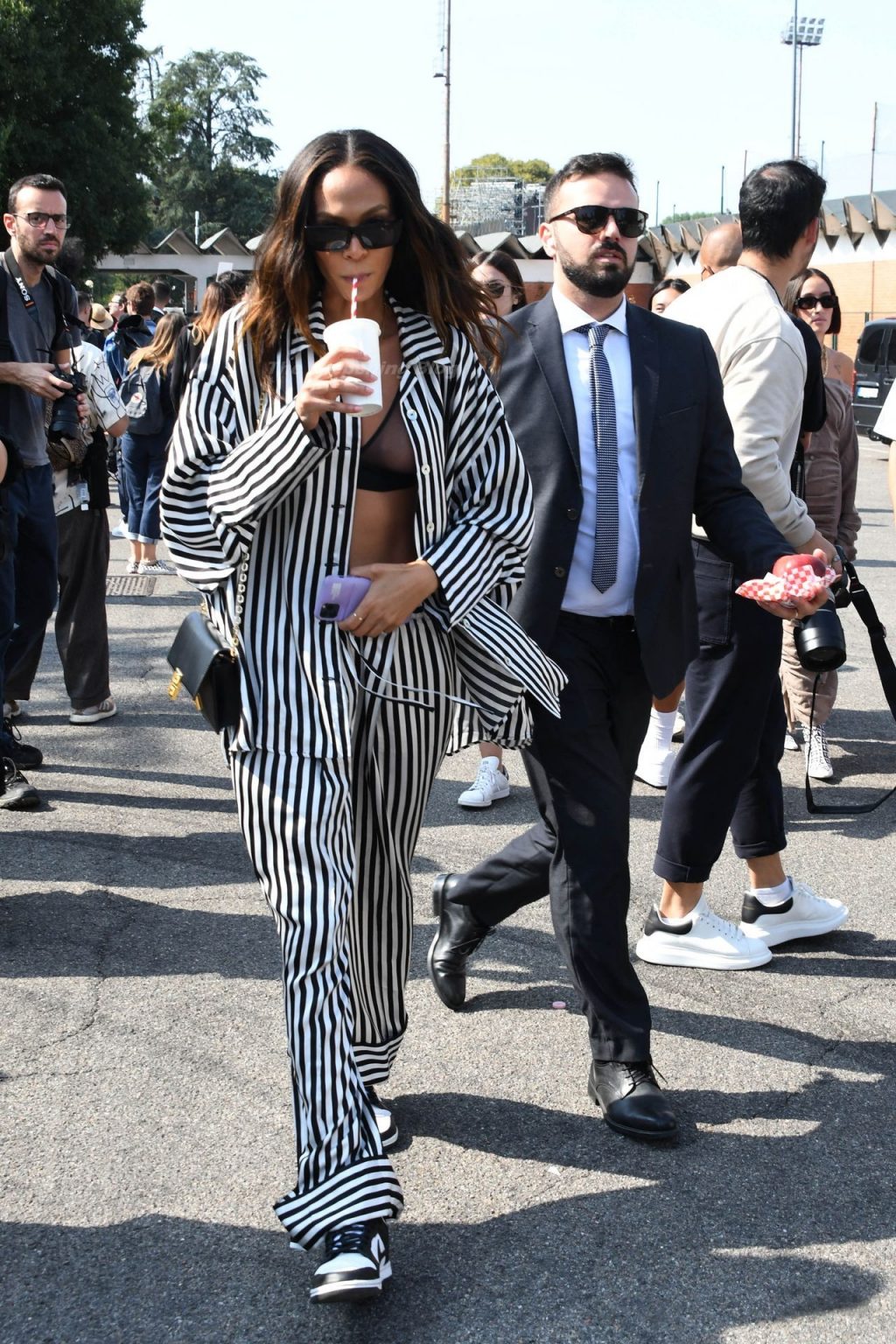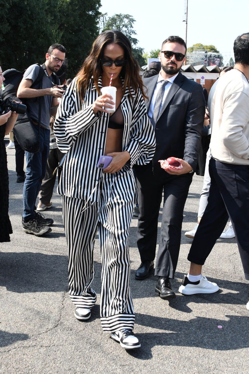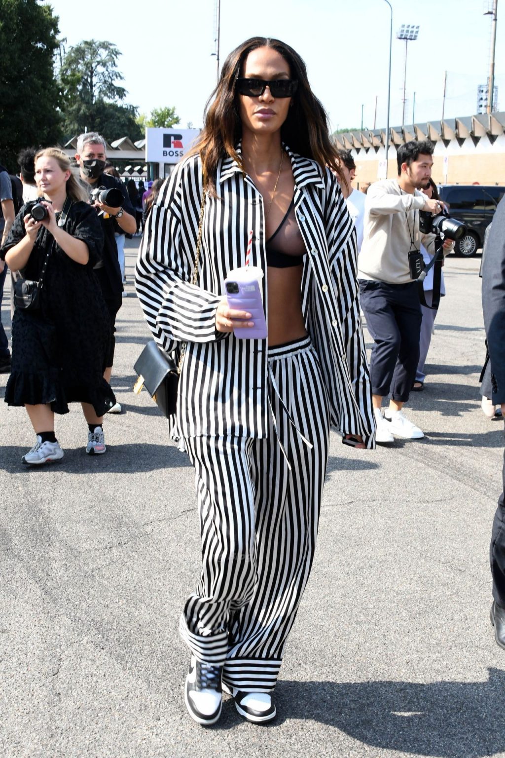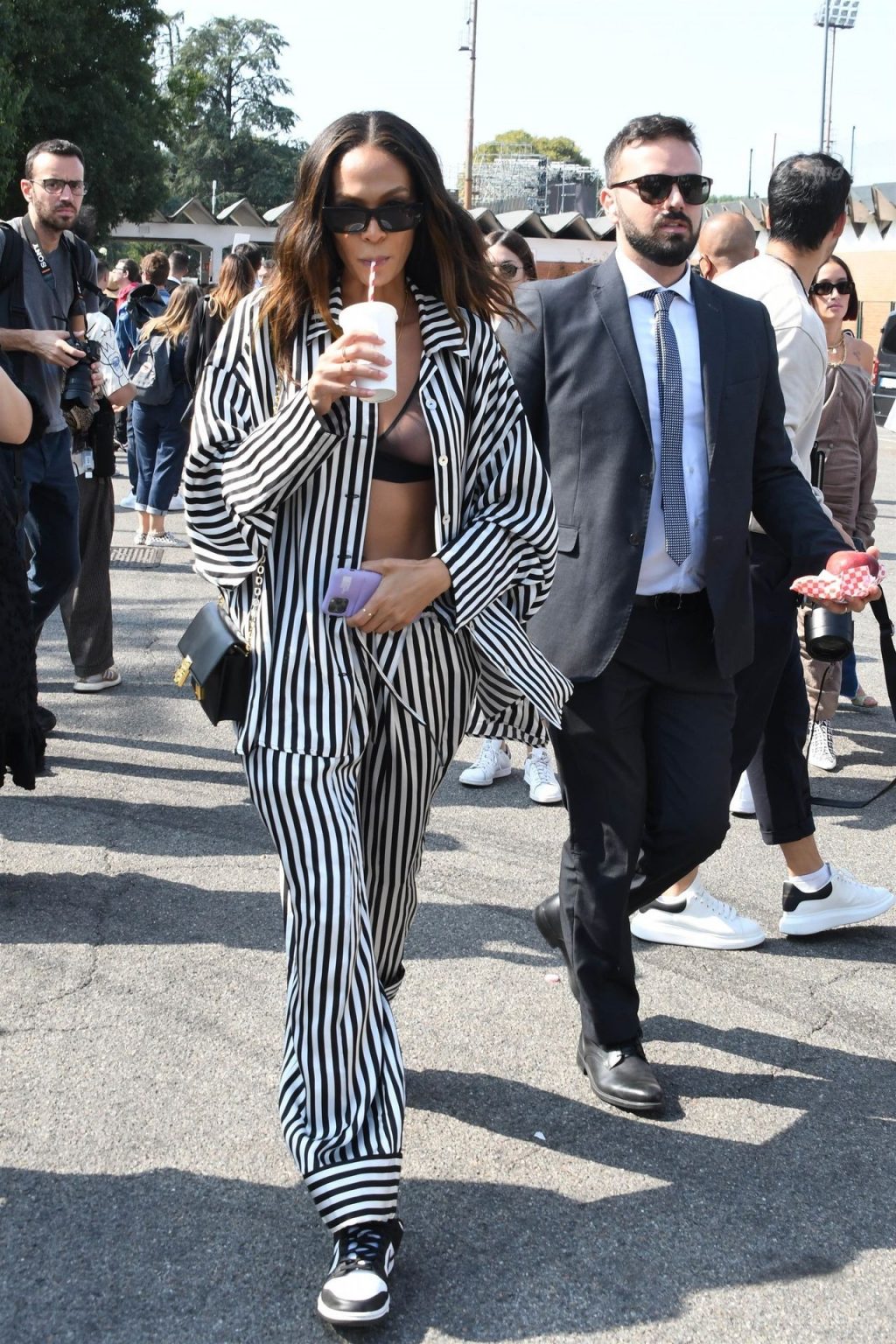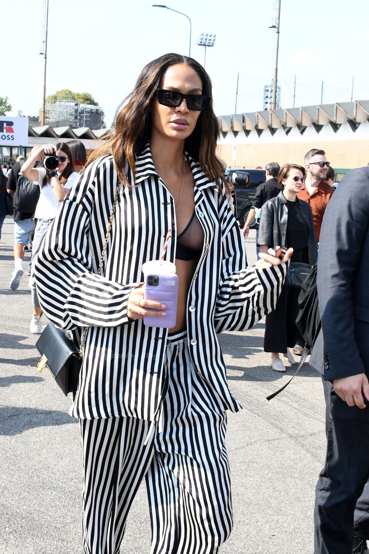 Gigi Hadid и Joan Smalls были замечены на Неделе моды в Милане, 23.09.2021. Джоан показывает сосок, надев прозрачный бюстгальтер.