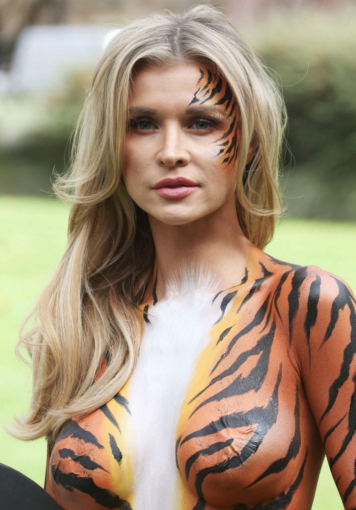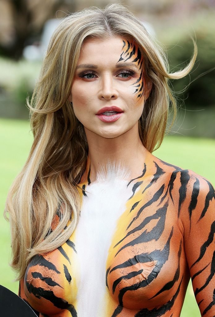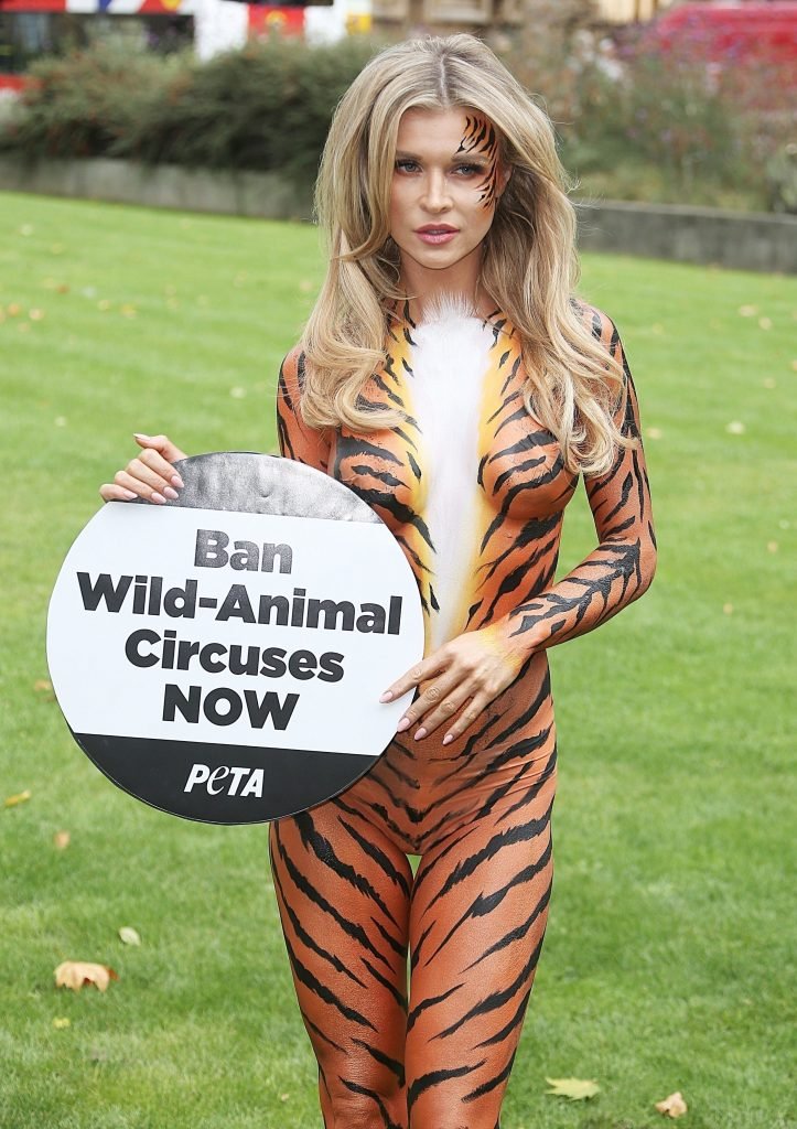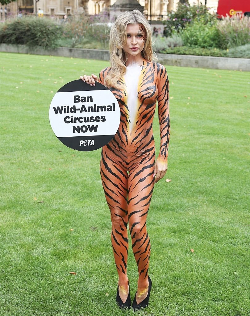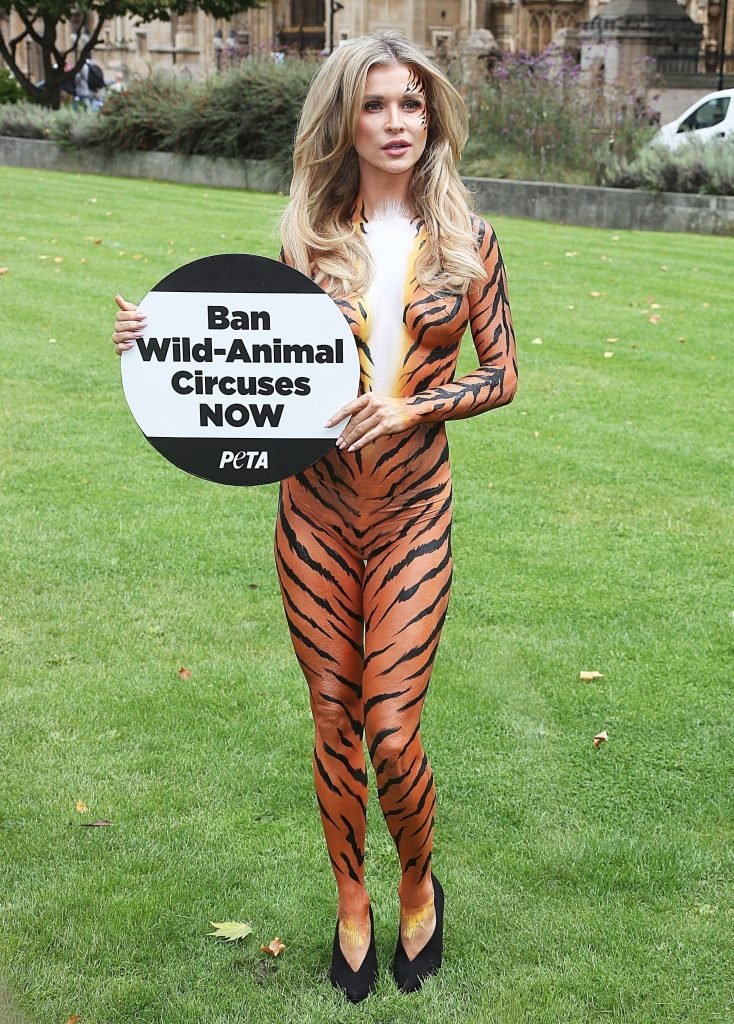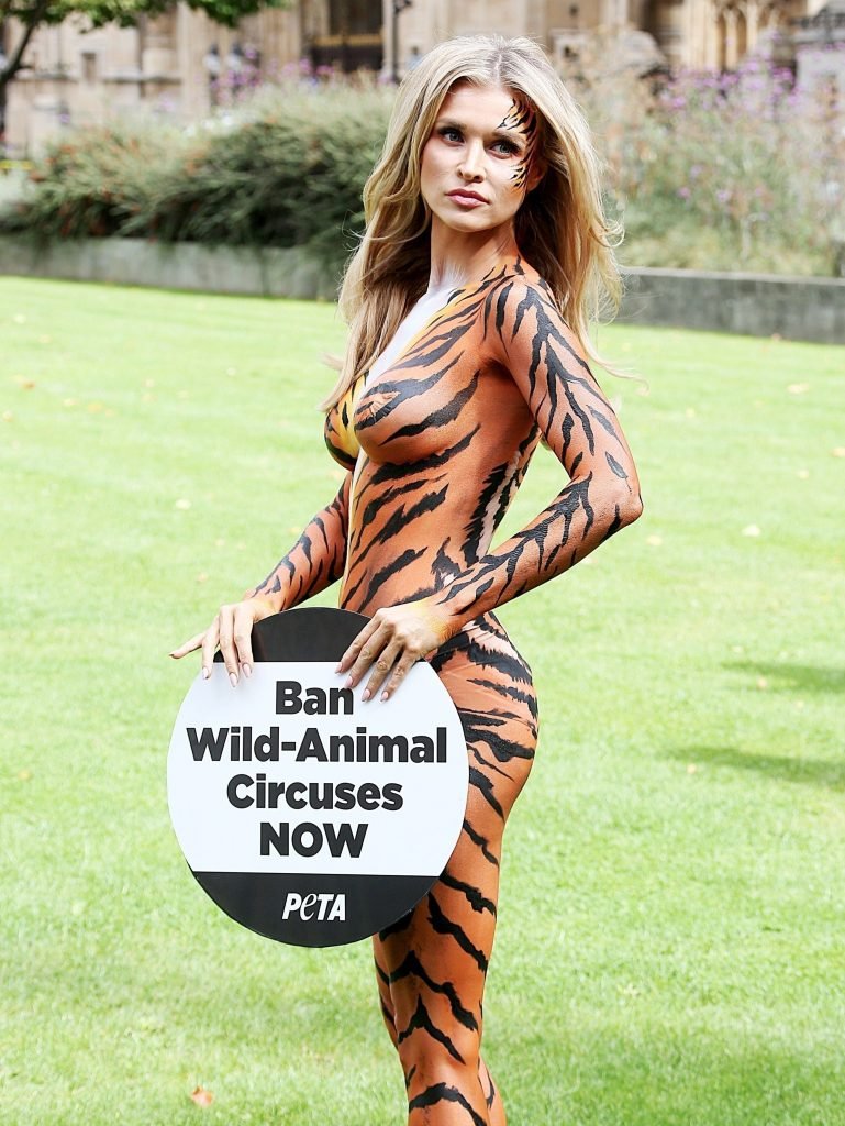 Раскрашенная как тигр, супермодель Джоанна Крупа, 38 лет, присоединилась к PETA возле Вестминстера, Лондон, 11.09.2017.