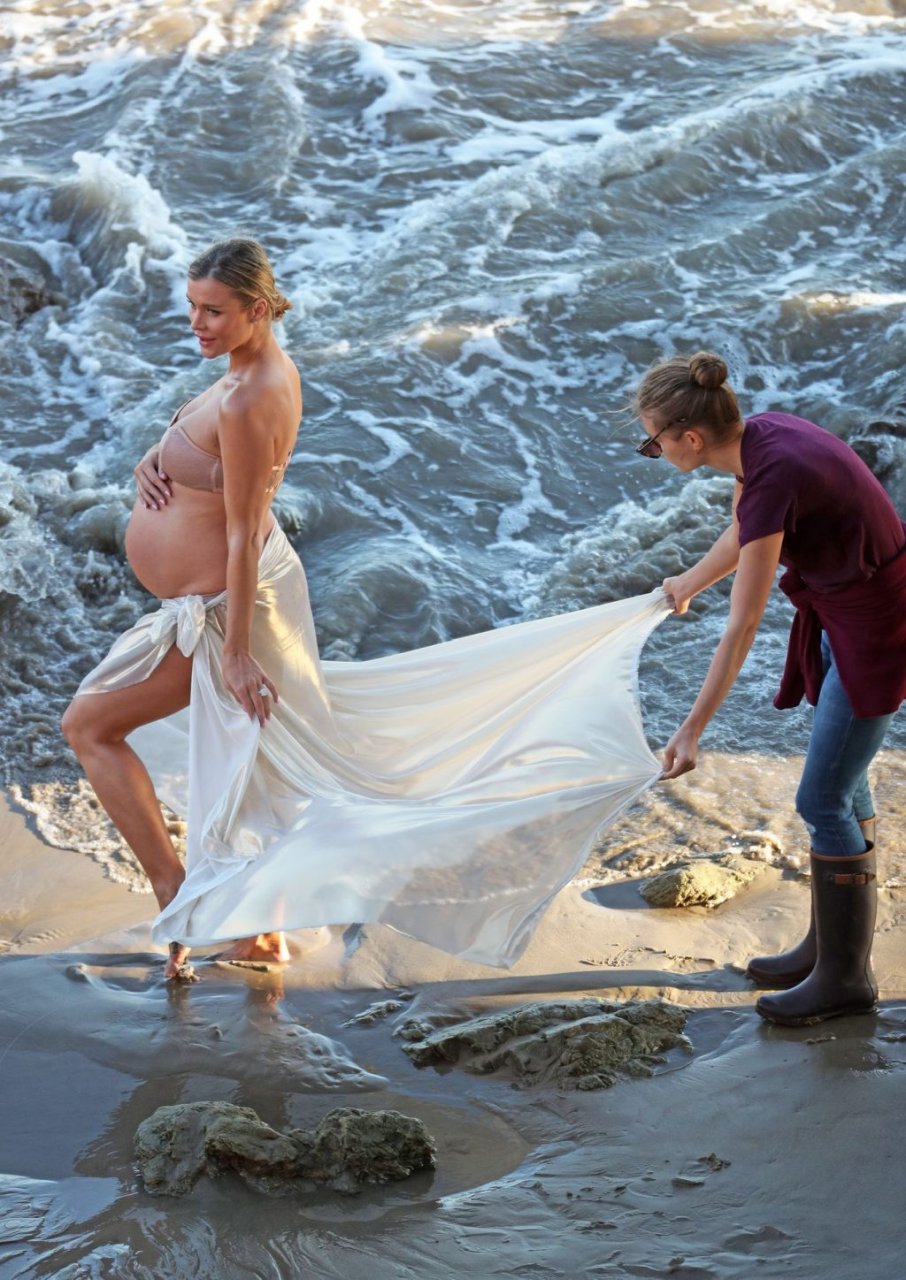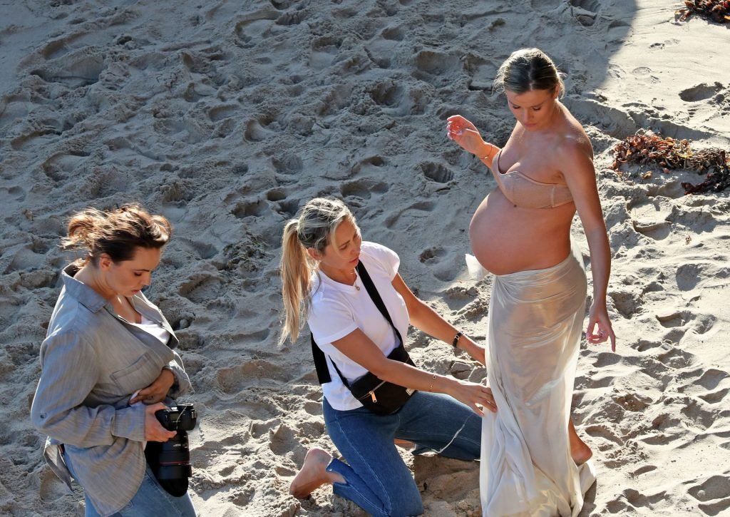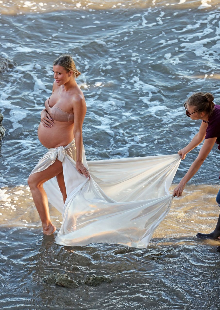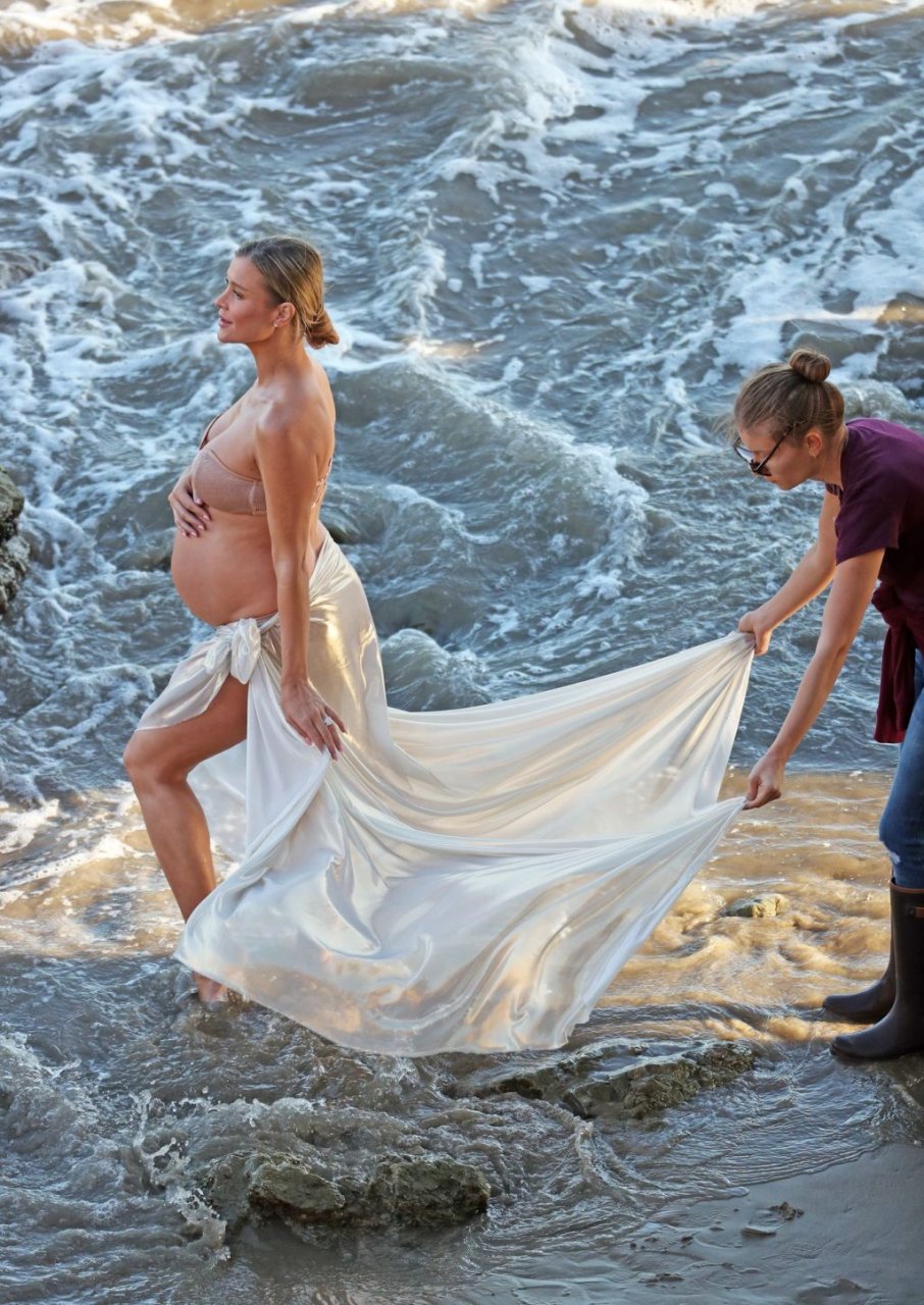 Польская телеведущая, которая ждет своего первого ребенка, дочь, от нового мужа Дага Нунеса, позировала в блестящем шампанском бикини без бретелек и шелковом накидке для знаковой съемки в Малибу.