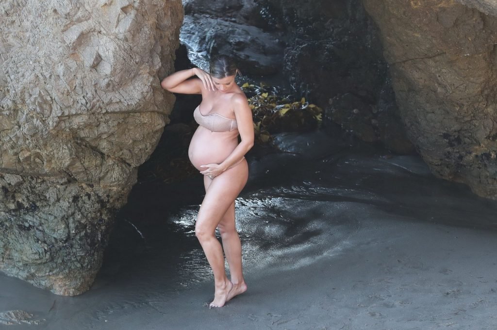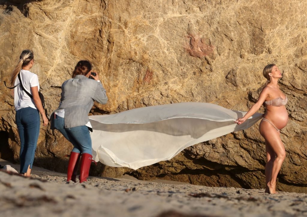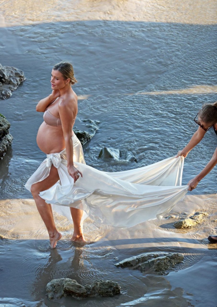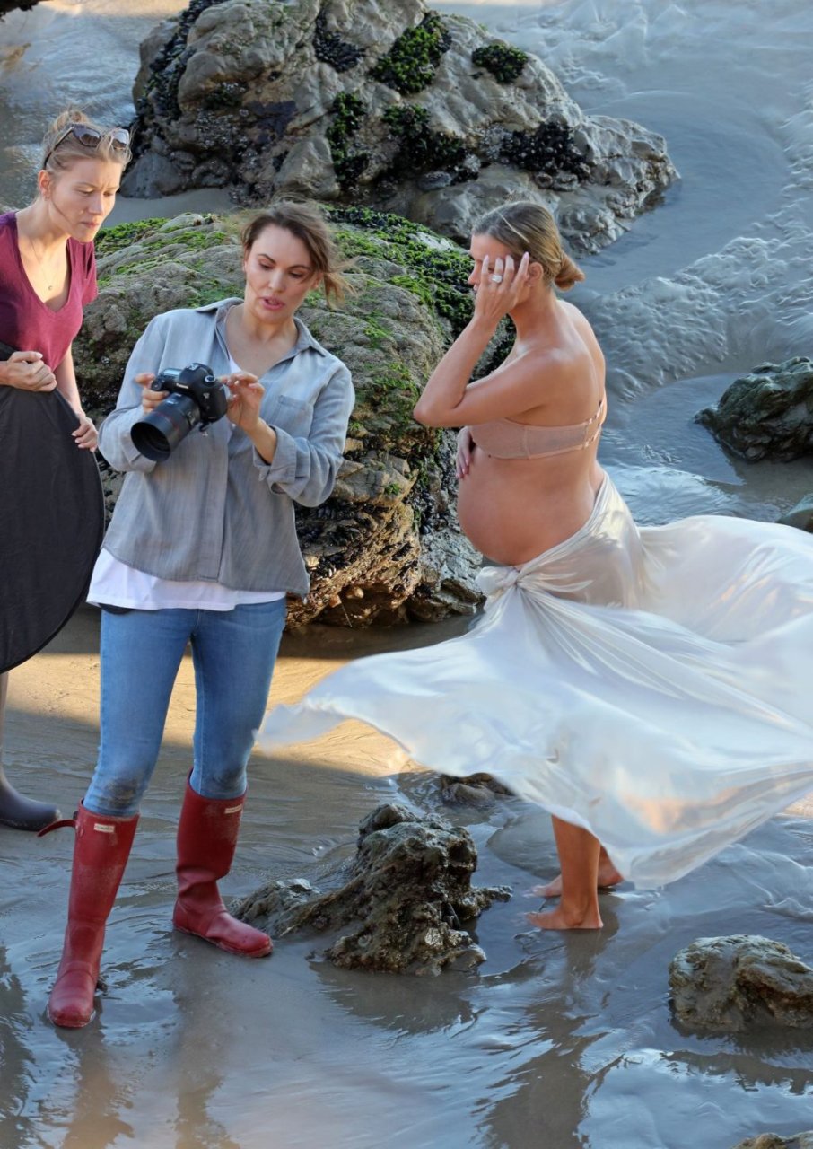 Польская телеведущая, которая ждет своего первого ребенка, дочь, от нового мужа Дага Нунеса, позировала в блестящем шампанском бикини без бретелек и шелковом накидке для знаковой съемки в Малибу.