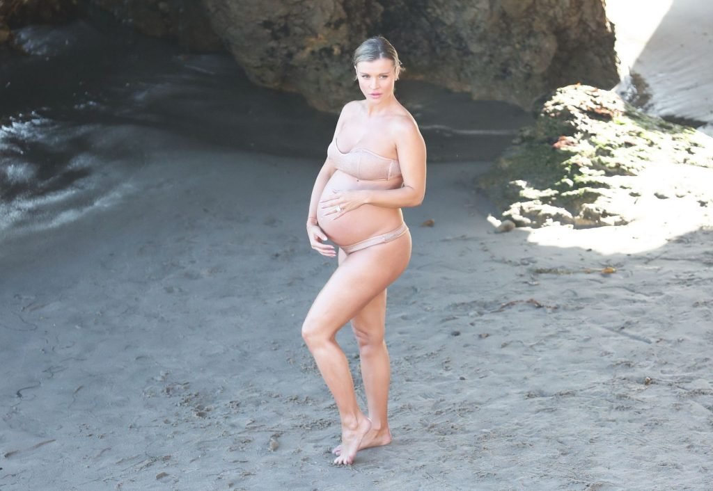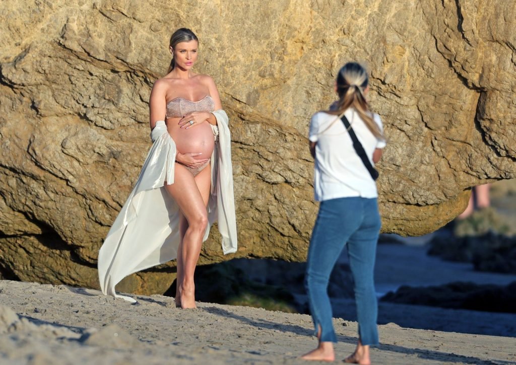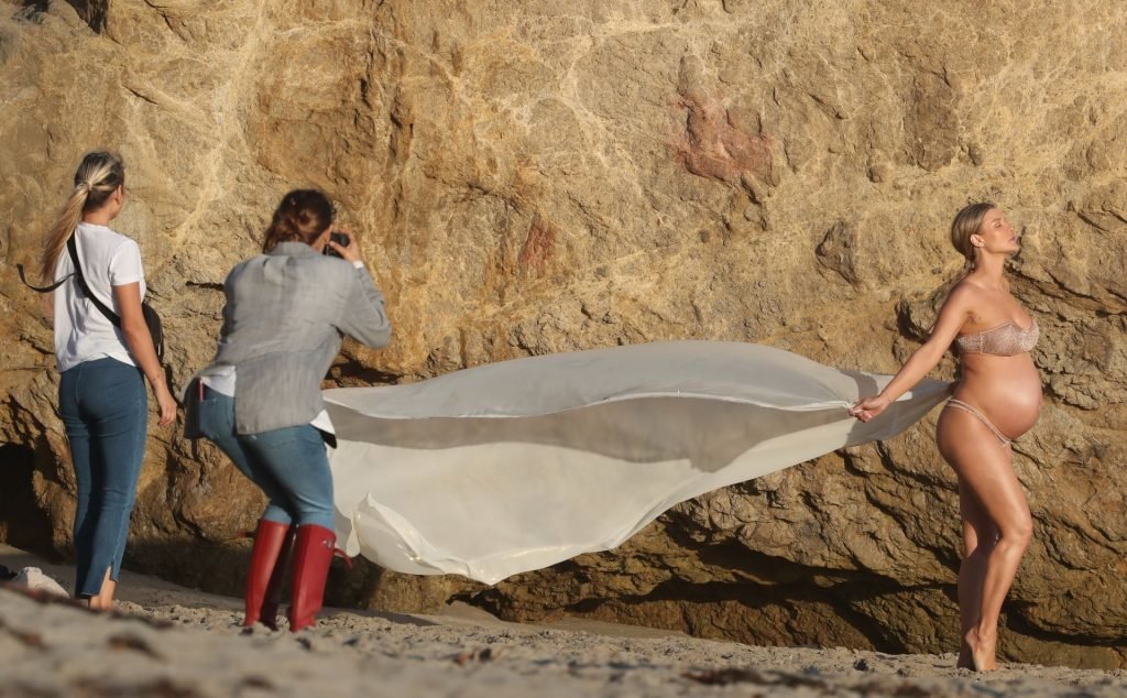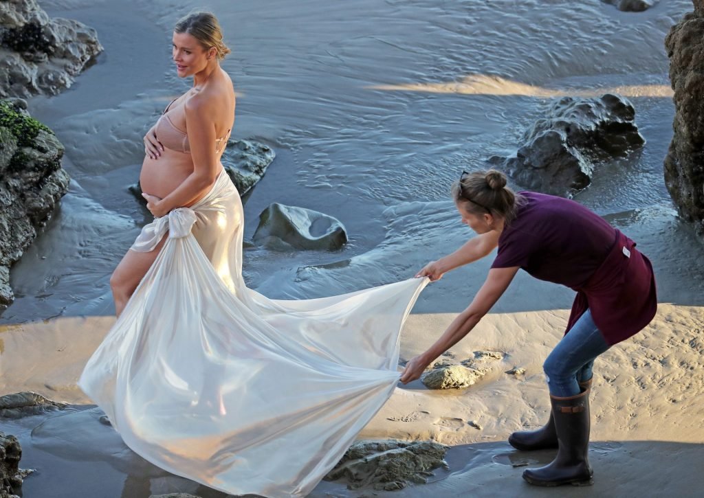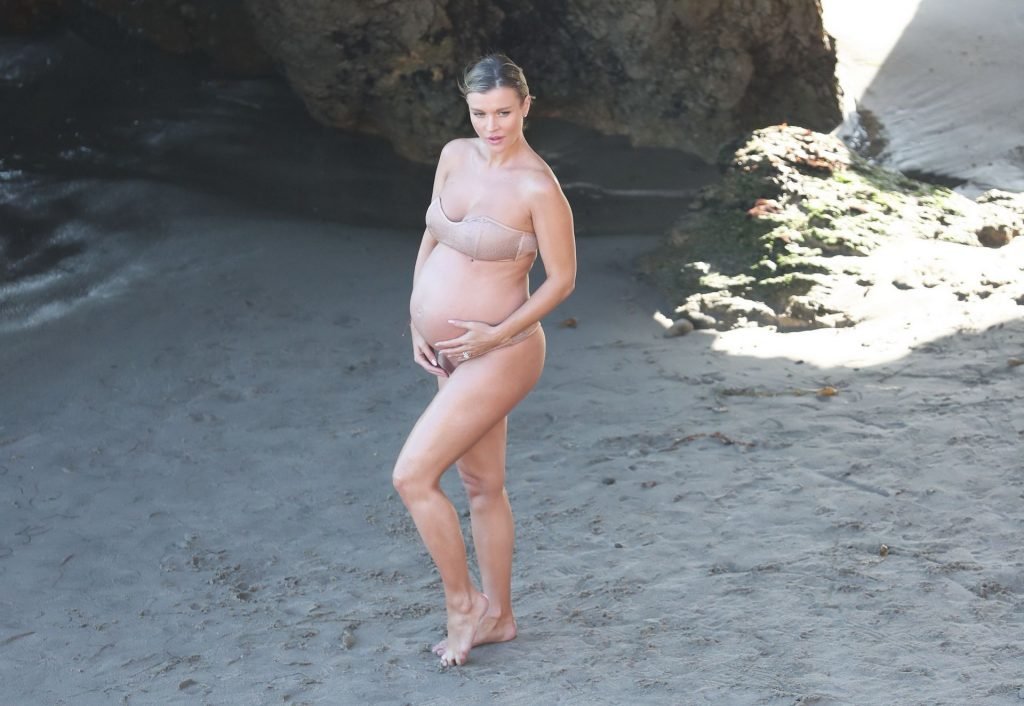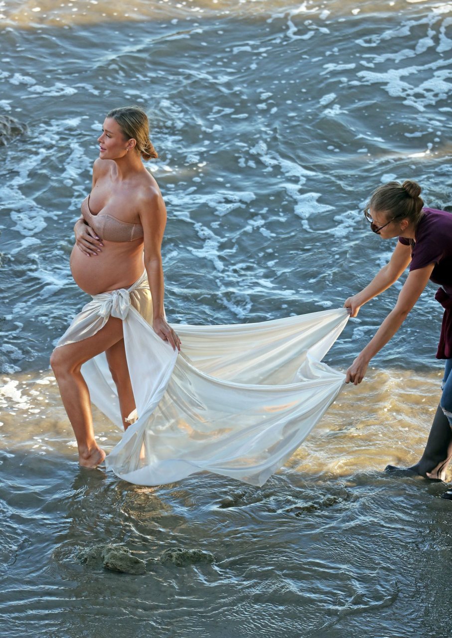 Польская телеведущая, которая ждет своего первого ребенка, дочь, от нового мужа Дага Нунеса, позировала в блестящем шампанском бикини без бретелек и шелковом накидке для знаковой съемки в Малибу.