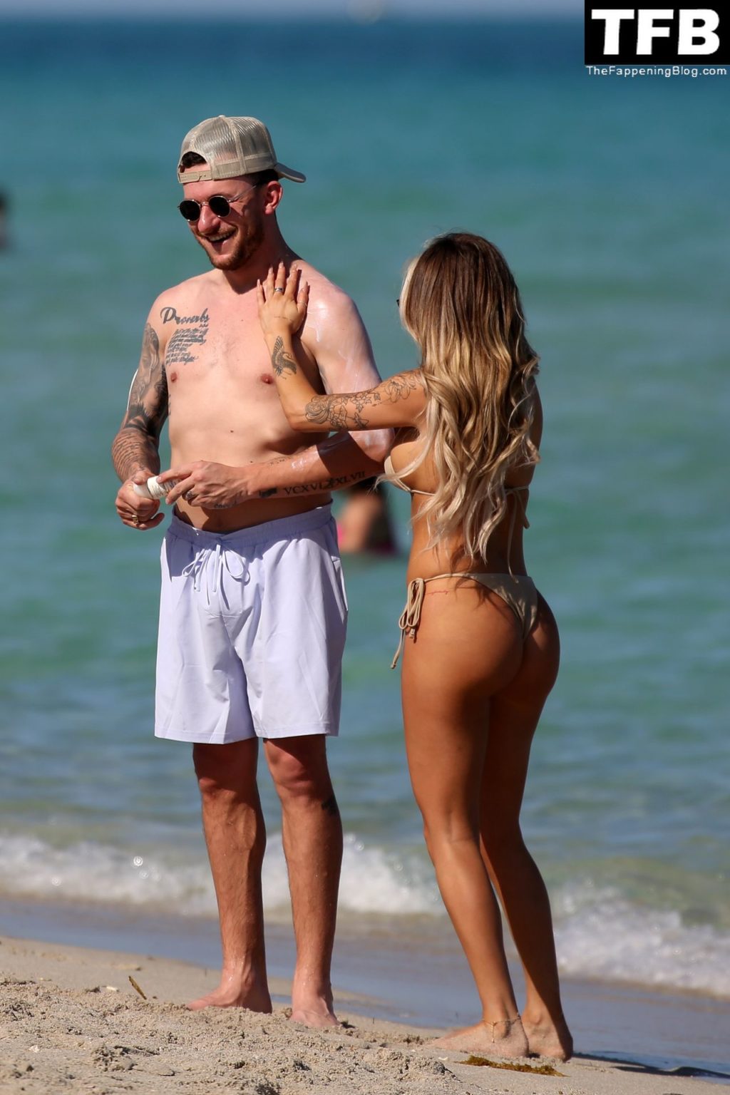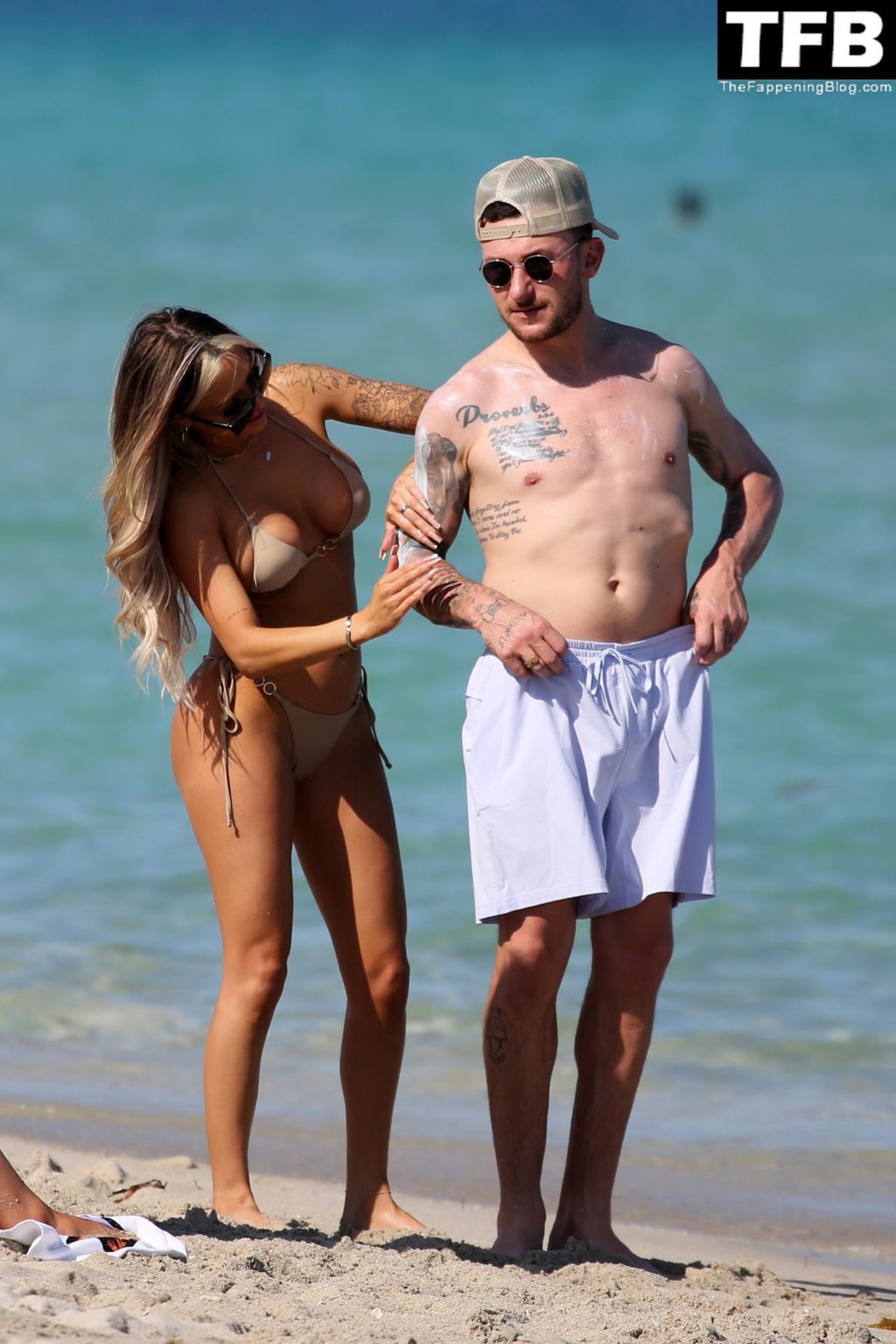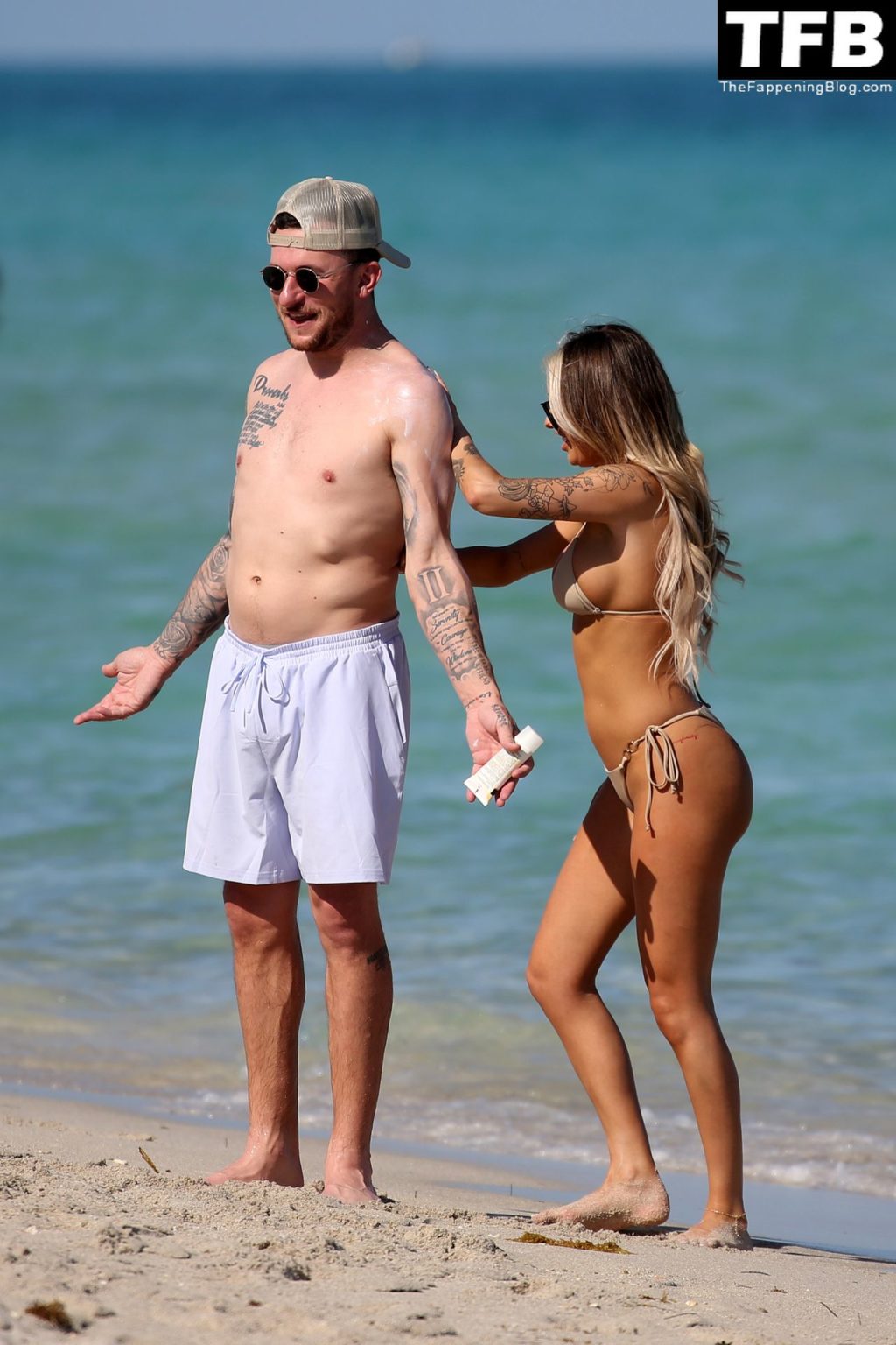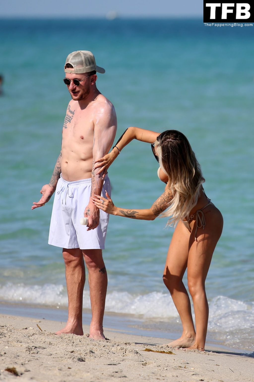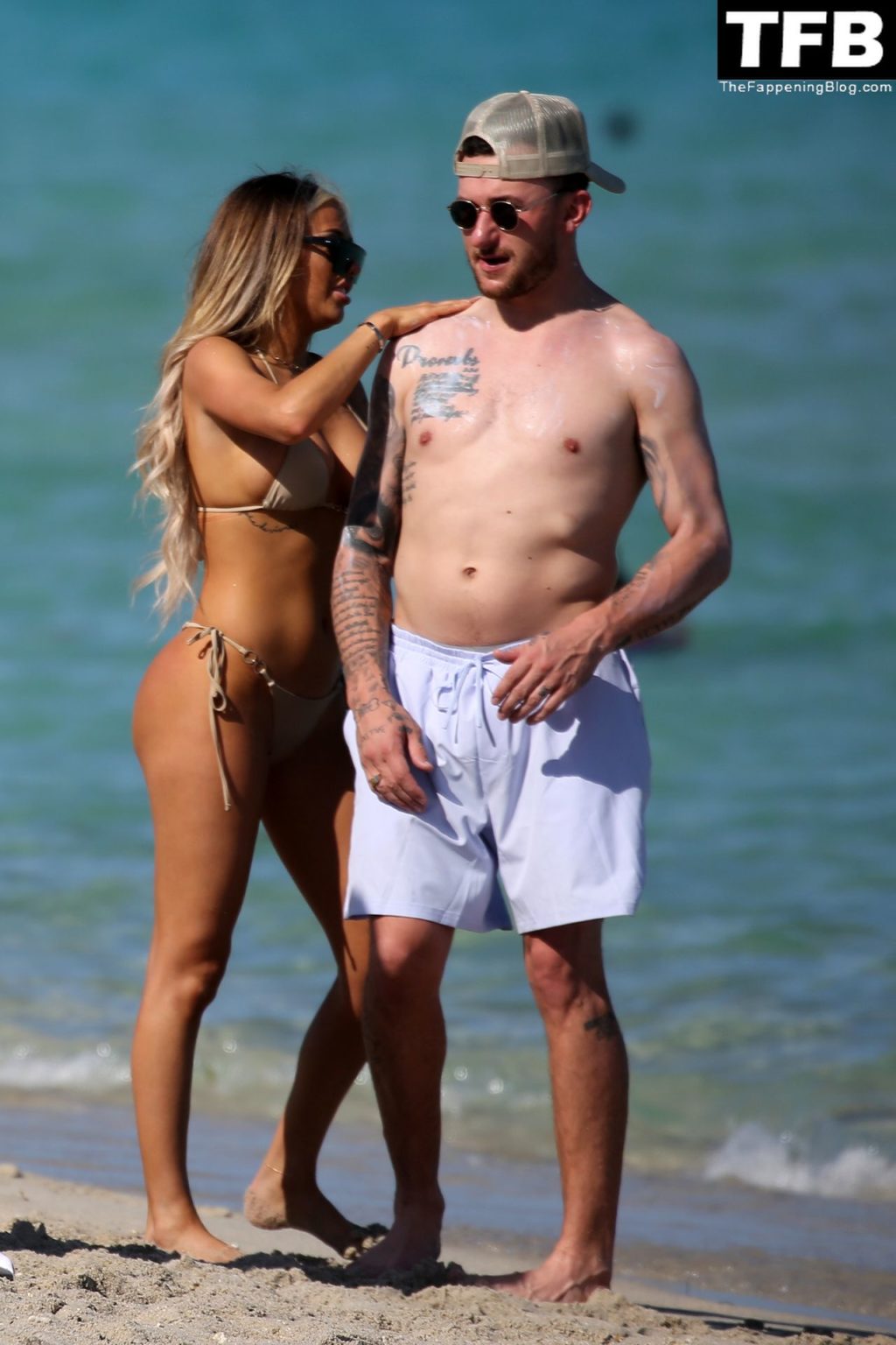 Опозоренная звезда НФЛ Джонни Манзиль, похоже, ни о чем не заботится, отдыхая на пляже с блондинкой в бикини, футбольным мячом и кейсом White Claw в Майами, 29.03.2022.