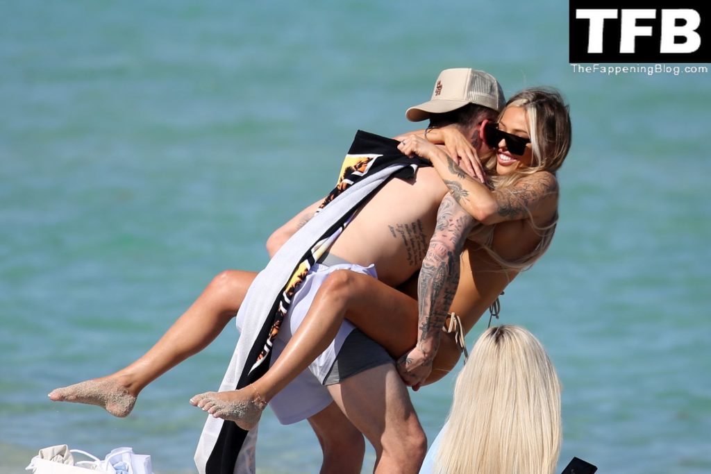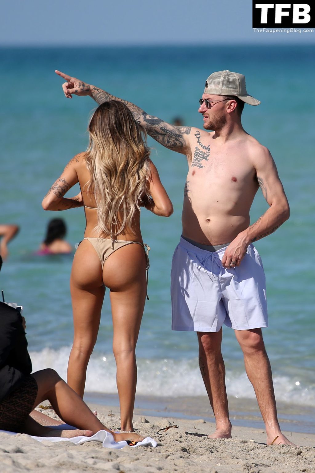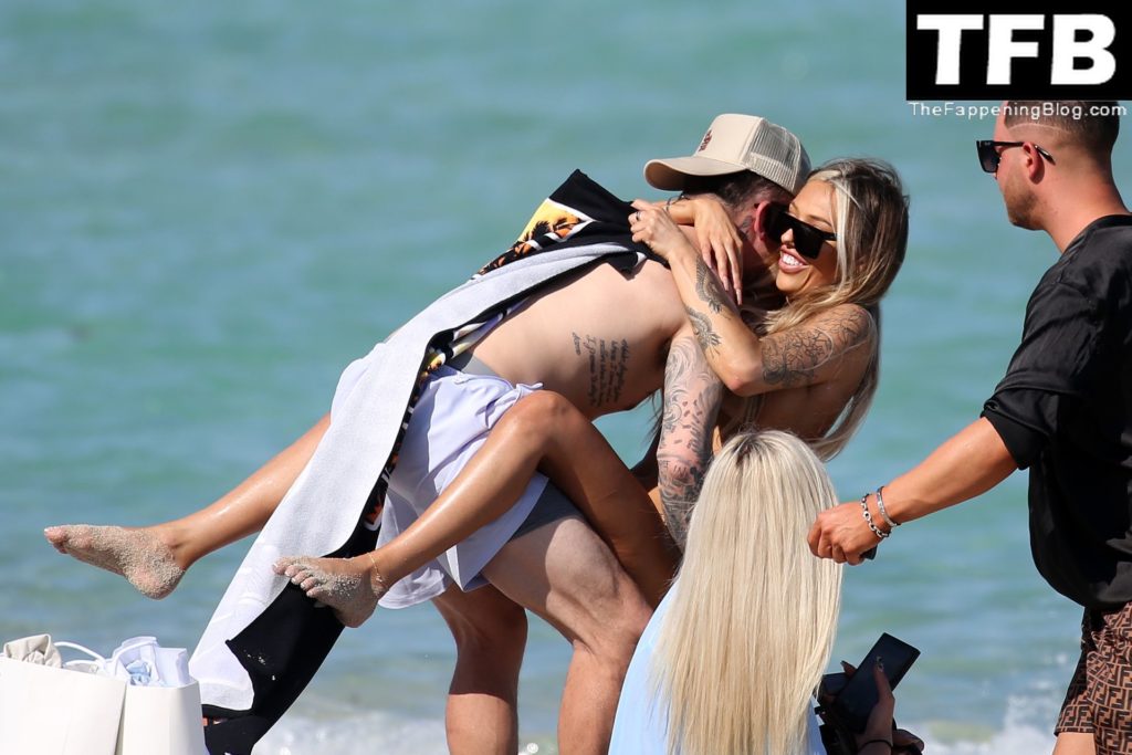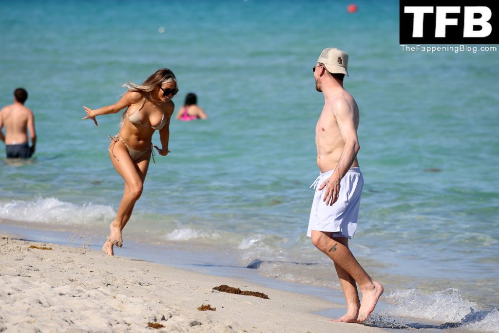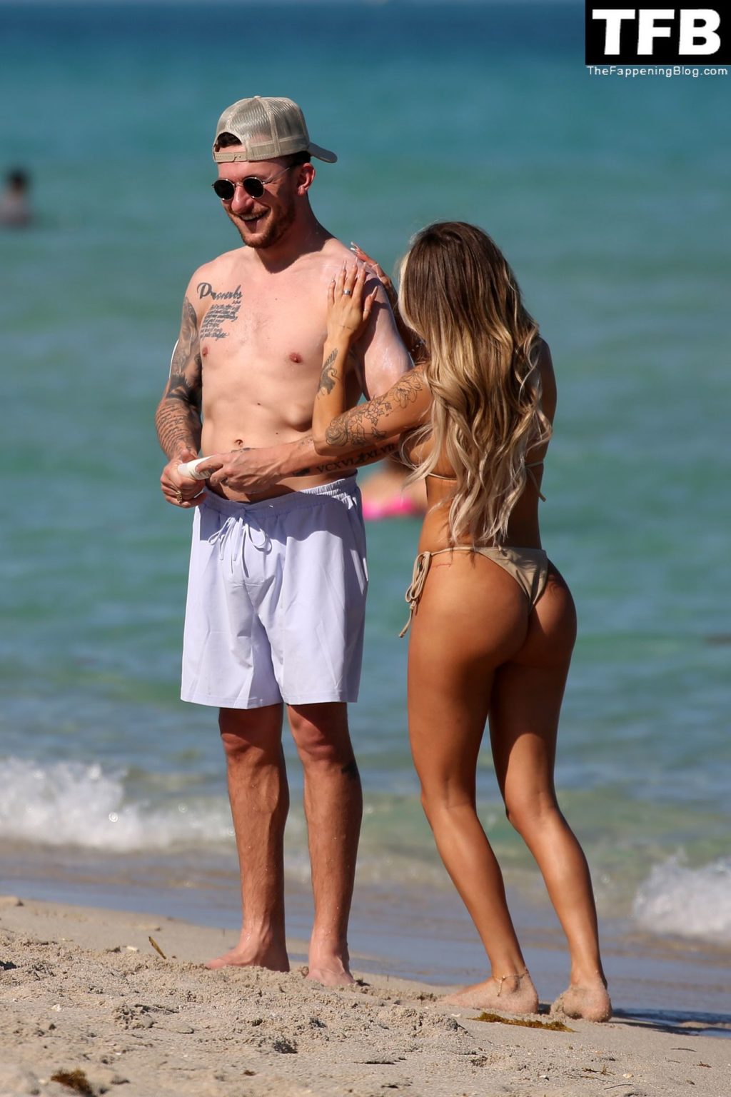 Опозоренная звезда НФЛ Джонни Манзиль, похоже, ни о чем не заботится, отдыхая на пляже с блондинкой в бикини, футбольным мячом и кейсом White Claw в Майами, 29.03.2022.