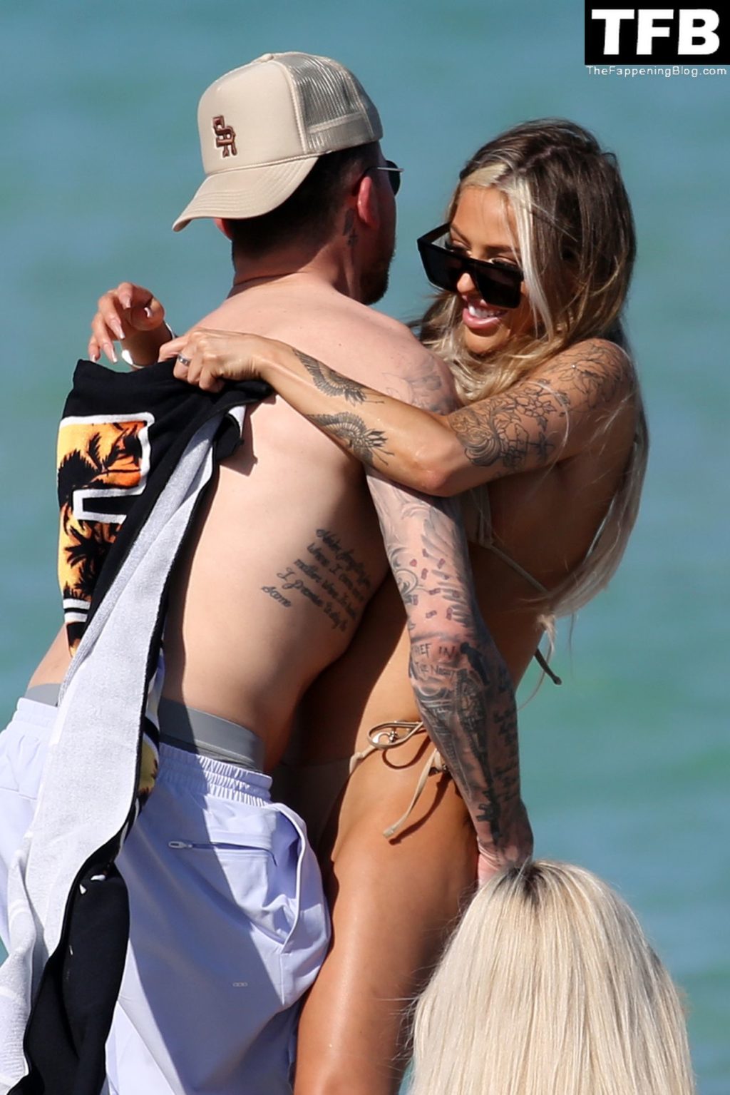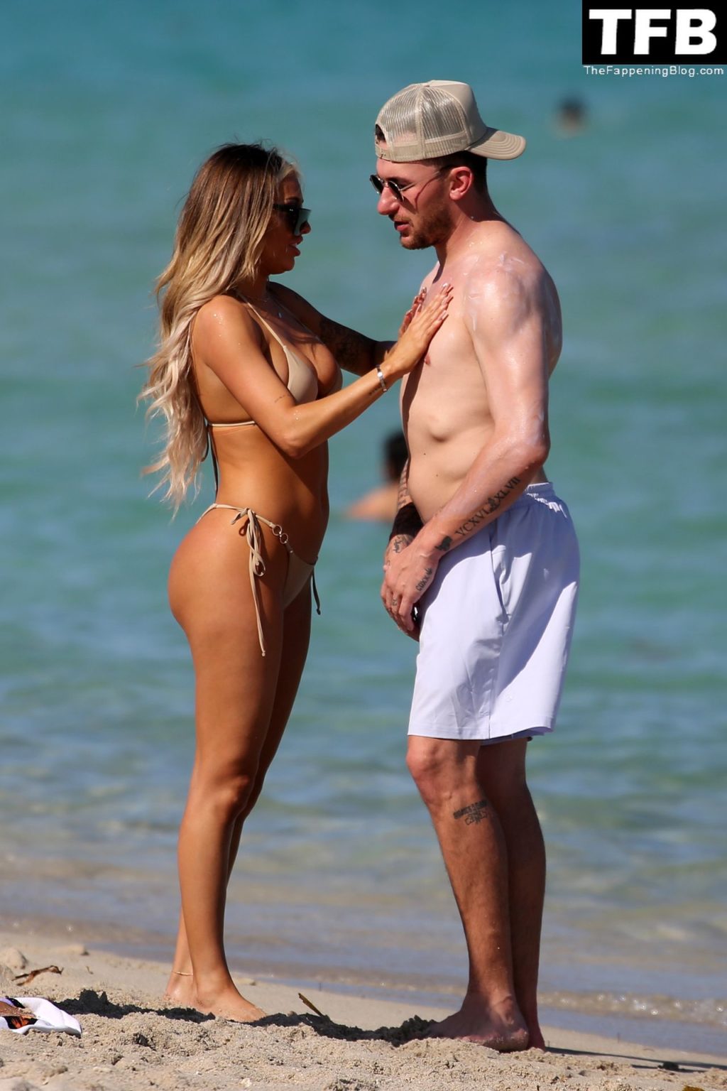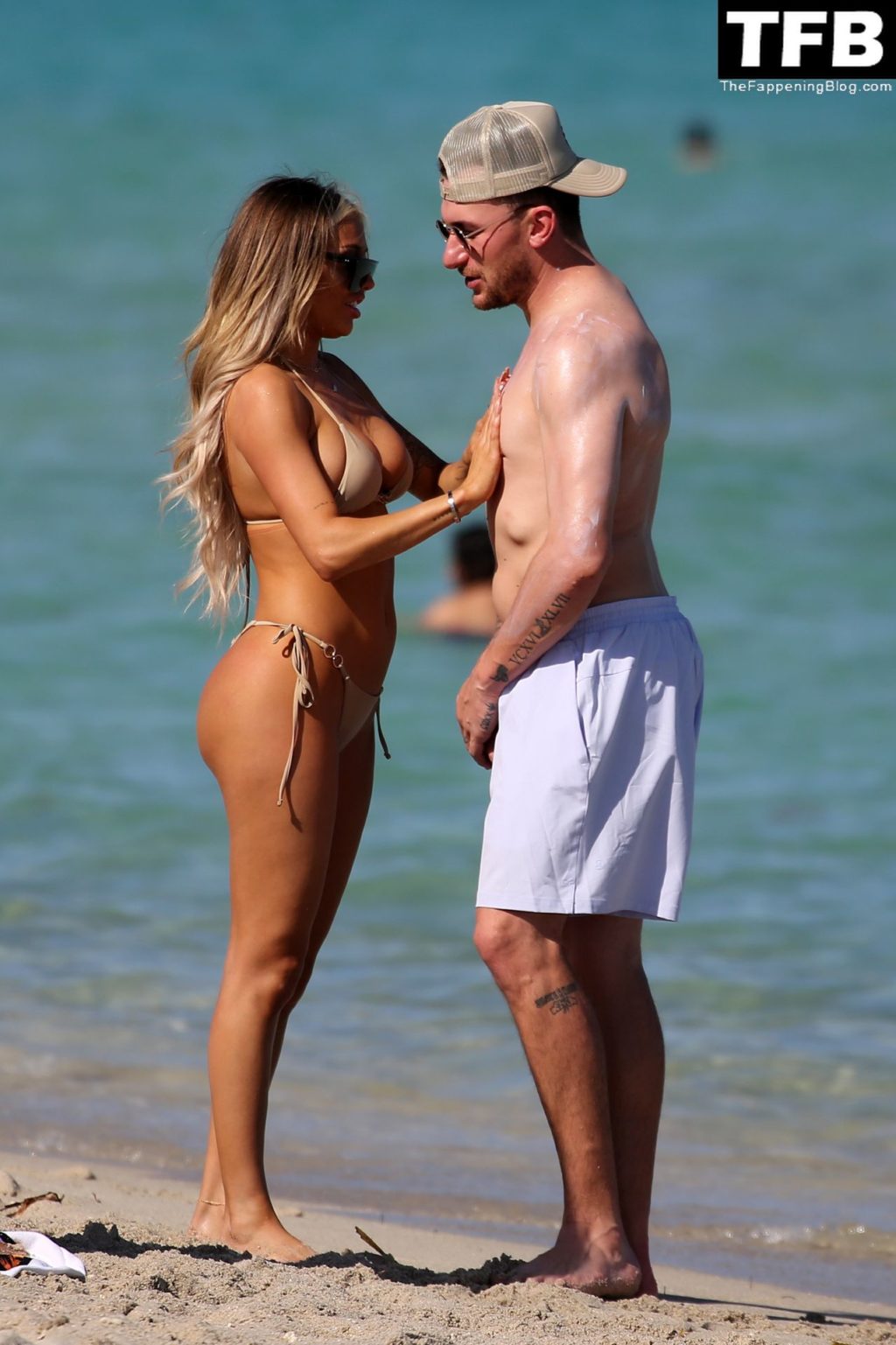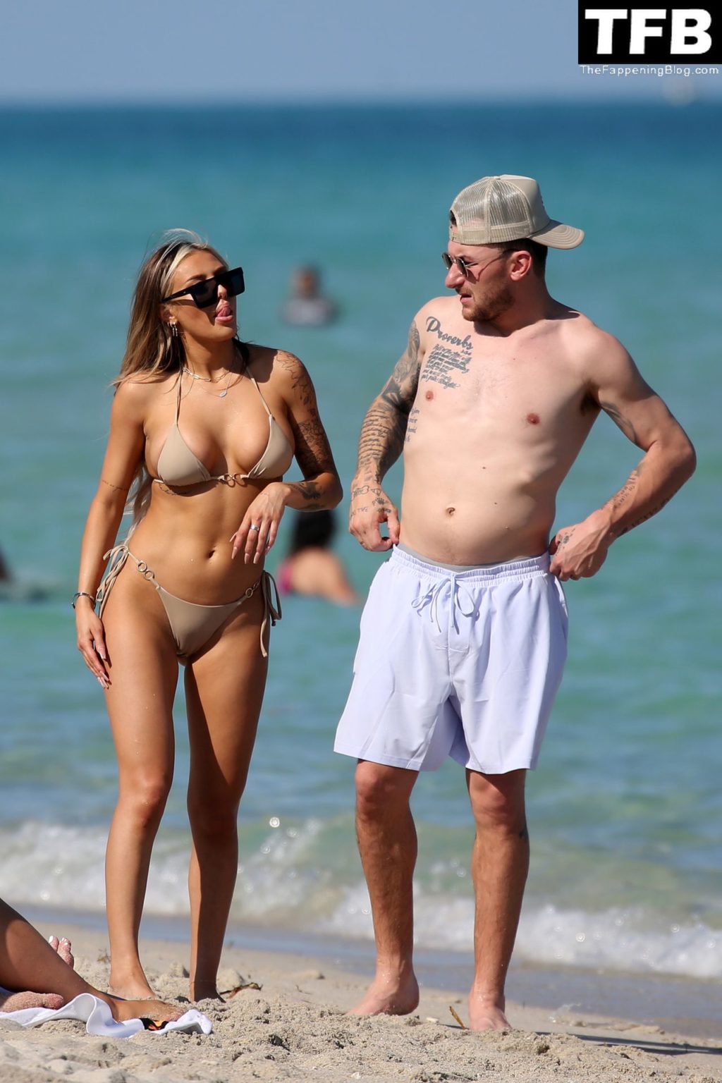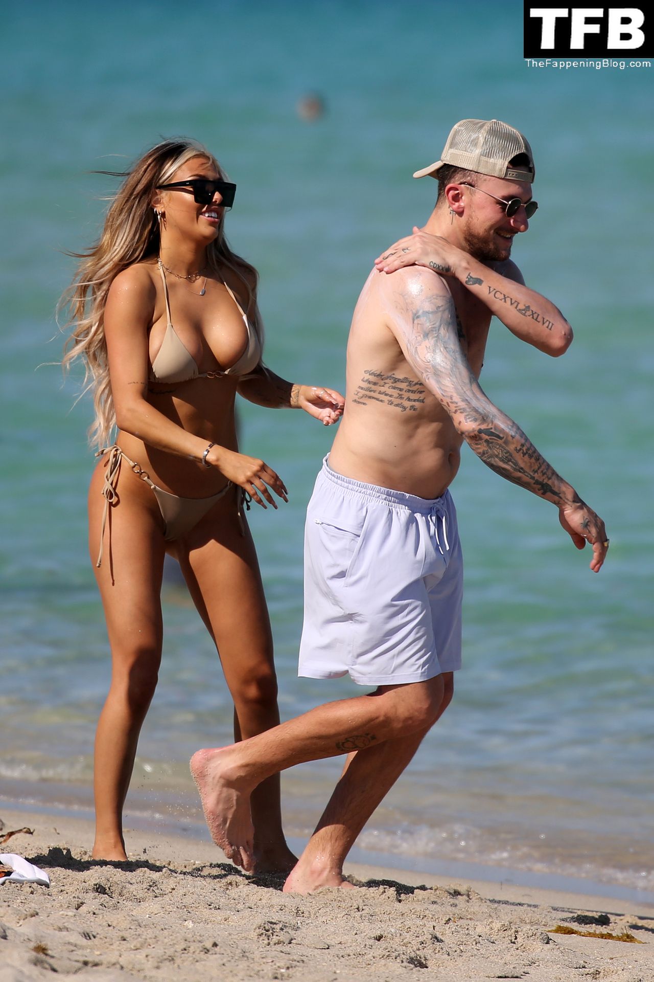 Опозоренная звезда НФЛ Джонни Манзиль, похоже, ни о чем не заботится, отдыхая на пляже с блондинкой в бикини, футбольным мячом и кейсом White Claw в Майами, 29.03.2022.