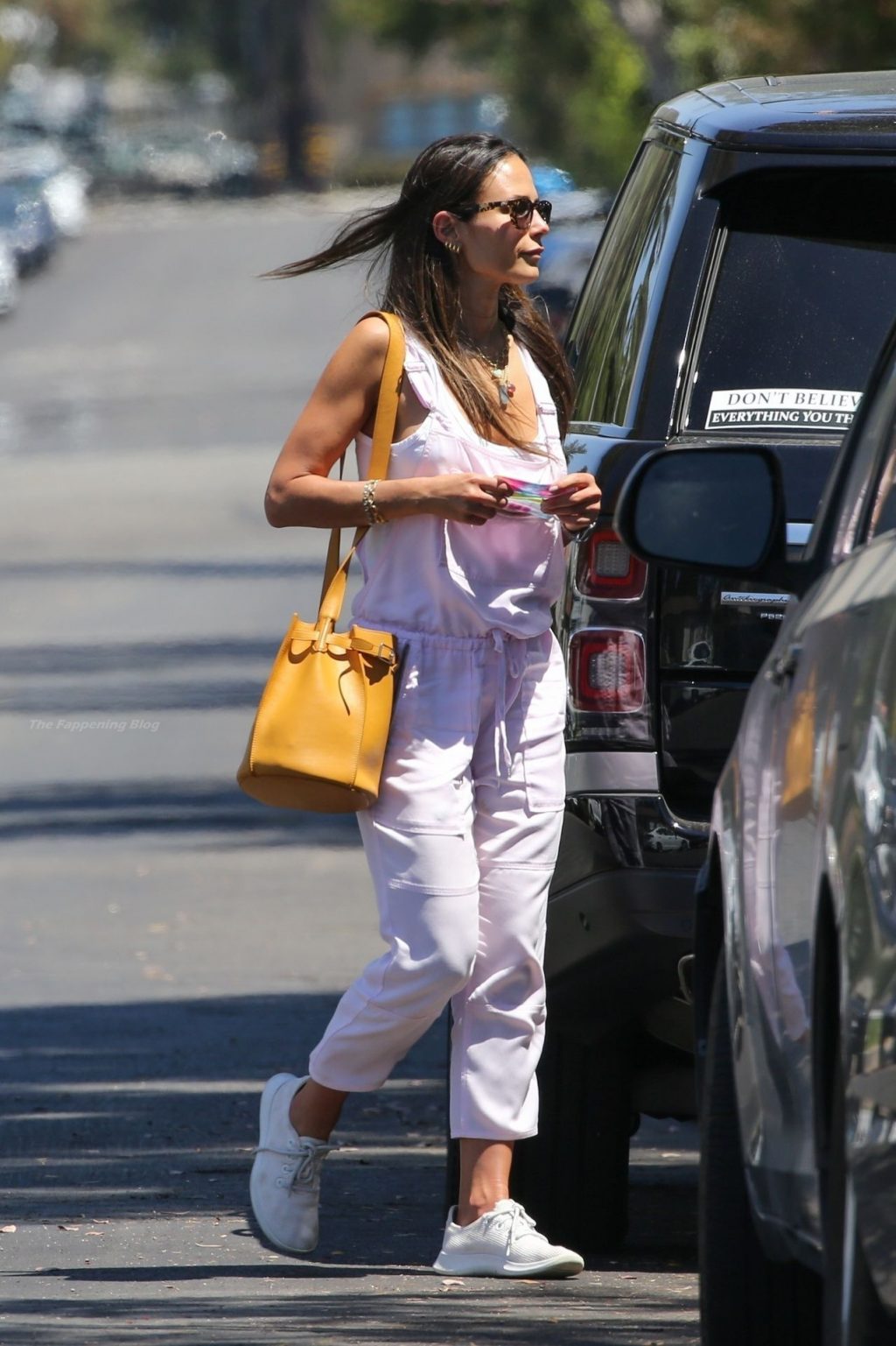 Актриса Джордана Брюстер в розовом прозрачном комбинезоне во время прогулки по Брентвуду, 14.06.2021.