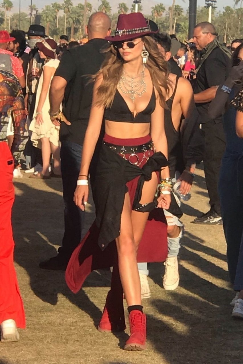 Josephine Skriver наблюдает за Bad Bunny и останавливается, чтобы сфотографироваться с фанатами в Индио, 21.04.2019. Модель демонстрирует свою сексуальную фигуру в черно-красном наряде.