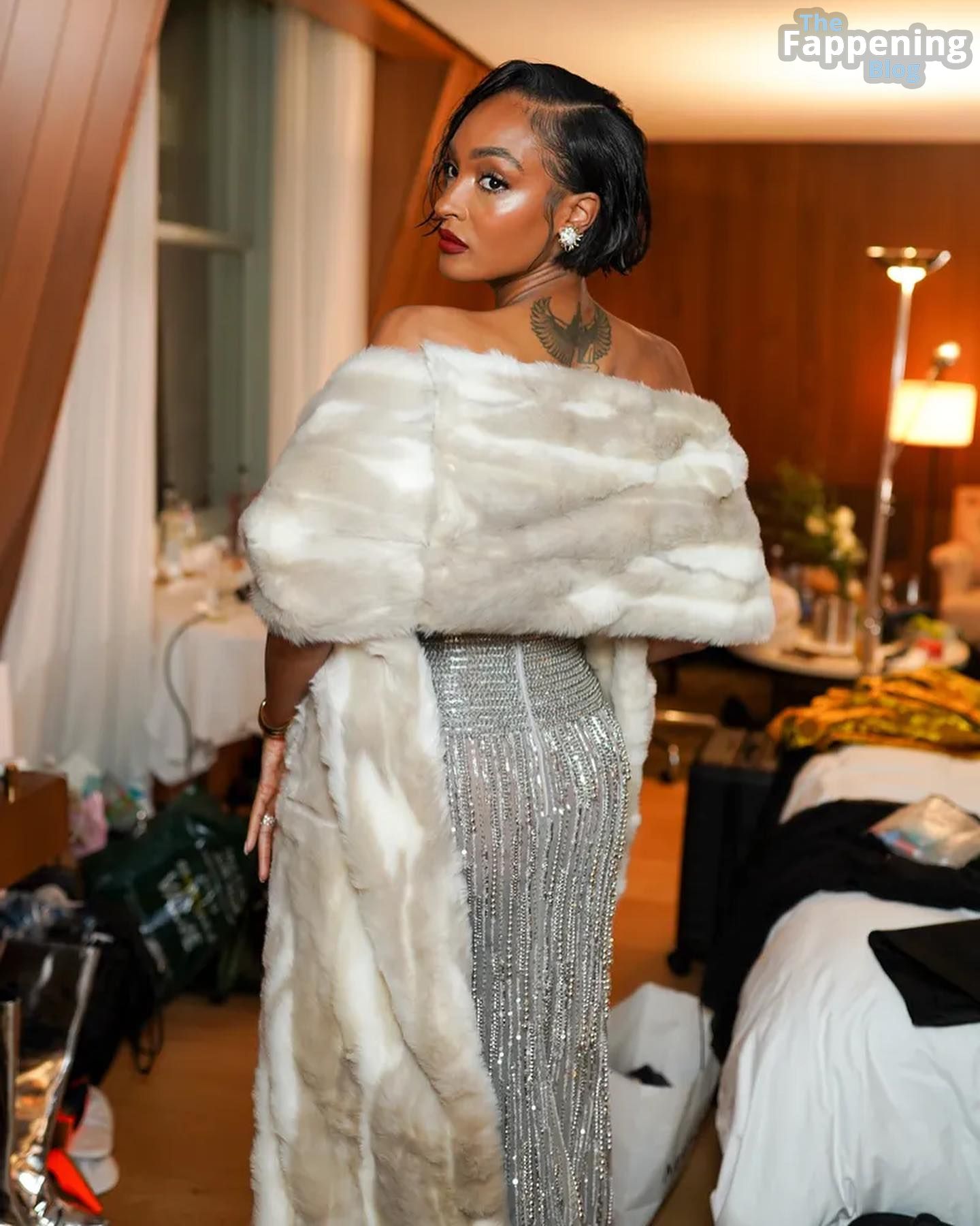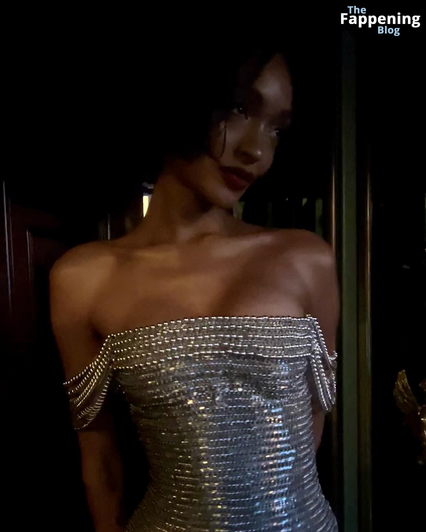 Британская модель Журдан Данн произвела впечатляющее появление на вечеринке British Vogue и Tiffany & Co. Fashion and Film Party в Лондоне, надев обтягивающее серебристое платье, которое казалось сделанным из крошечных цепочек. Платье открывало плечи Данн и подчеркивало её пышный бюст.