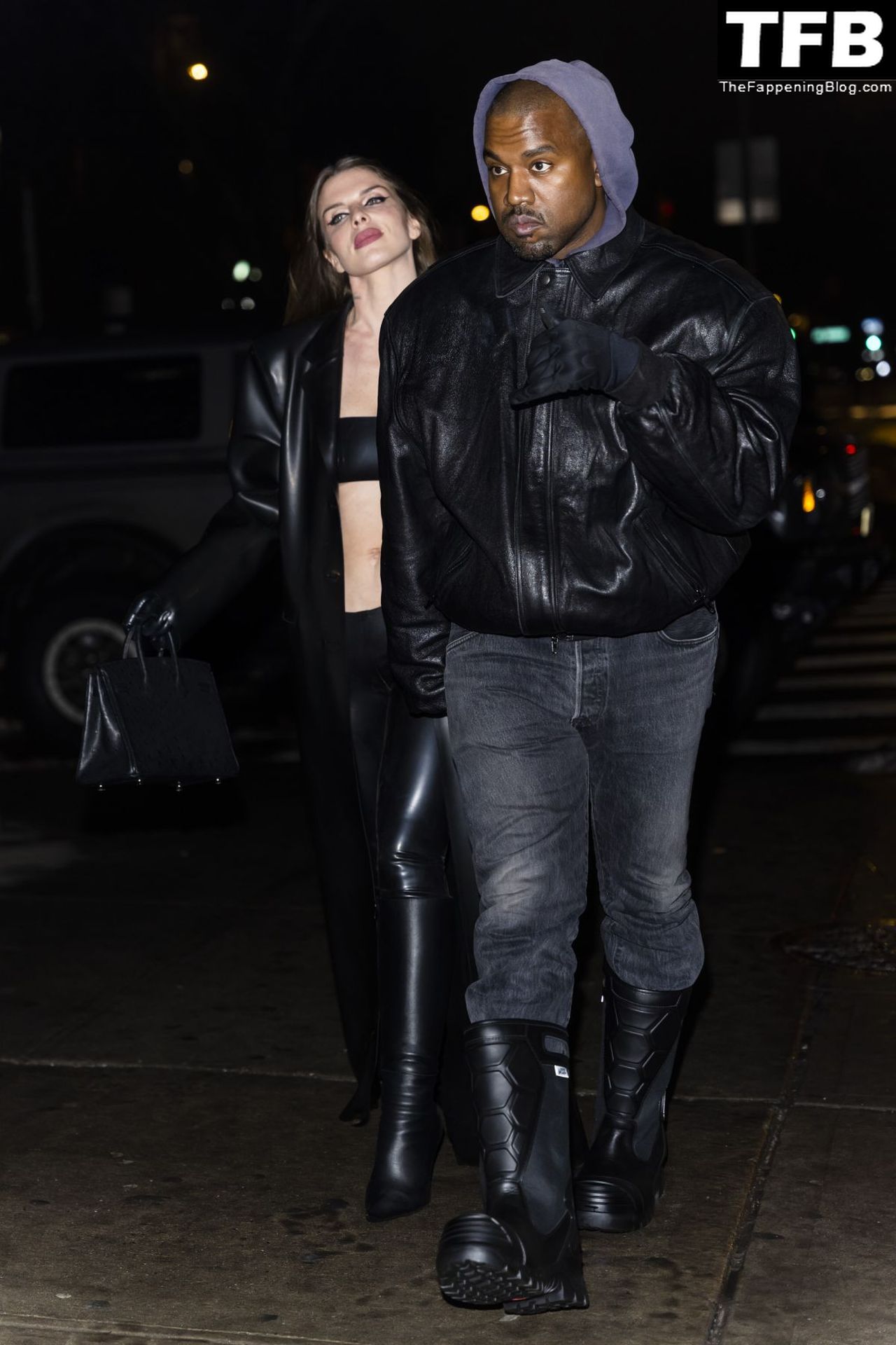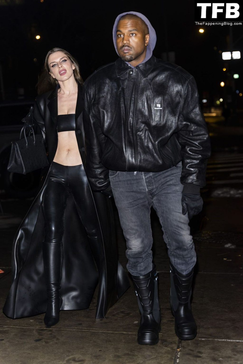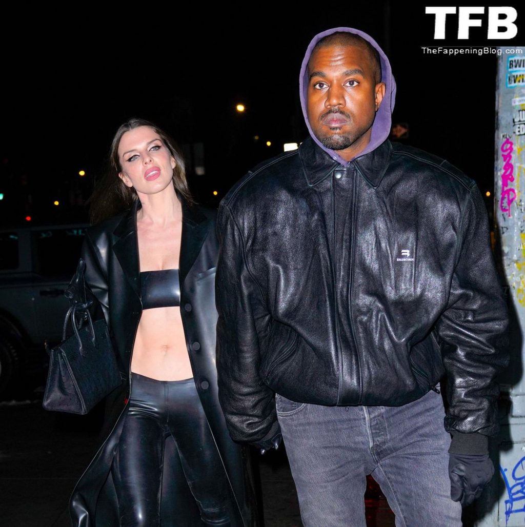 Модель и актриса Джулия Фокс в крошечном топе из ПВХ и с виднеющимися сосками замечена вместе с Ye в ресторане Lucien в Нью-Йорке, 02.08.2022.