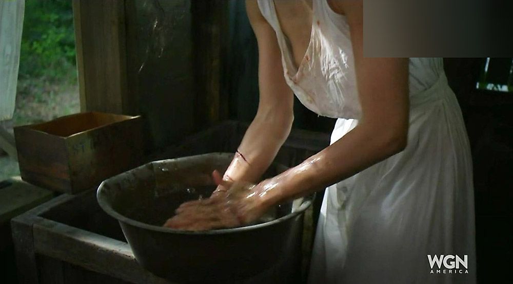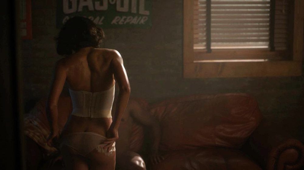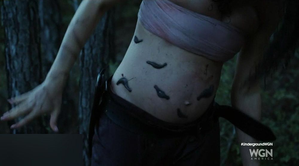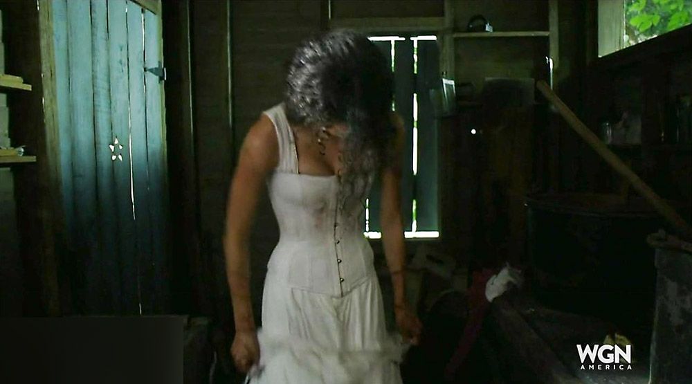 In the second scene, Jurnee Smollett-Bell’s nude belly is seen covered with leeches. And in the third scene, she is almost naked, in a hot white dress, covering some bloody cuts and showing boobs in the cleavage.