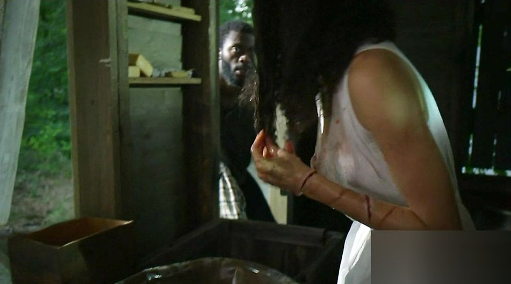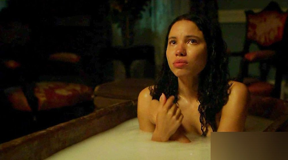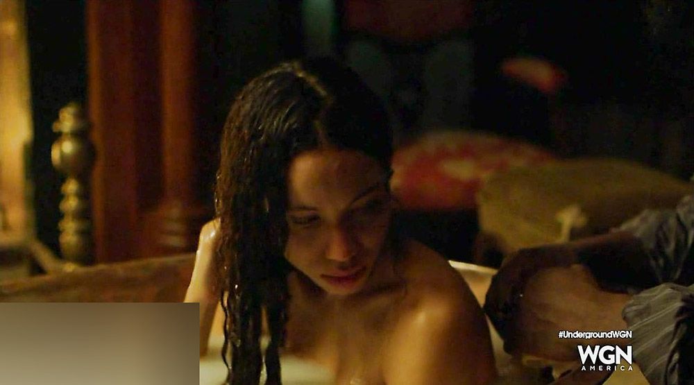 Then Jurnee Smollett-Bell is seen in three scenes from ‘Underground’. In the first one, Jurnee Smollett-Bell nude is in the bathtub full of milk. Then the black guy enters and helps her to bath, then kisses her and touches her, as she cries.